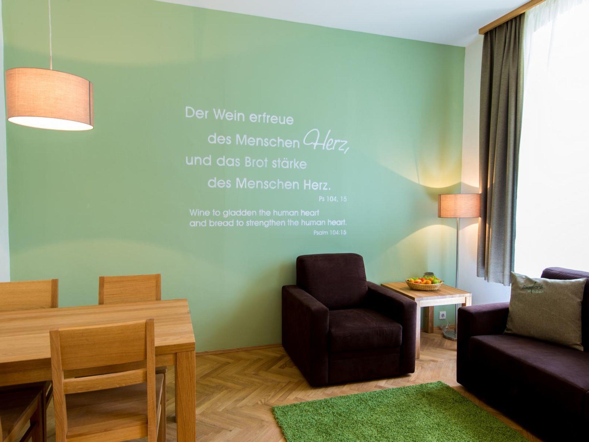 Das Appartement „Brot & Wein“ erinnert an das Wesentliche im Leben: Einfach, reduziert, modern und stilvoll bietet Ihnen Ihre Unterkunft im 1. Obergeschoss einen Wohnraum für zwei, maximal vier Personen. Der Wein erfreue des Menschen Herz, und das Brot stärke des Menschen Herz ist im Appartment zu lesen. Großzügig Auf etwa 47m2 verteilen sich ein geräumiges Vorzimmer, ein Badezimmer mit Dusche, getrennte, großzügige Schlaf- und Wohnzimmer mit Kochecke sowie eine separate Toilette. Die Küche ist voll ausgestattet mit Kochfeld, Kühlschrank, Geschirrspüler sowie mit Gläsern, Besteck, Tellern und Töpfen. Darüber hinaus stehen Ihnen eine Kaffeemaschine und dazugehörigen Kaffeepads sowie ein Wasserkocher mit einem Tee-Sortiment zur Verfügung. Auch hier schlafen Sie in einem Himmelbett und genießen Sie den modernen Komfort all unserer Appartements.