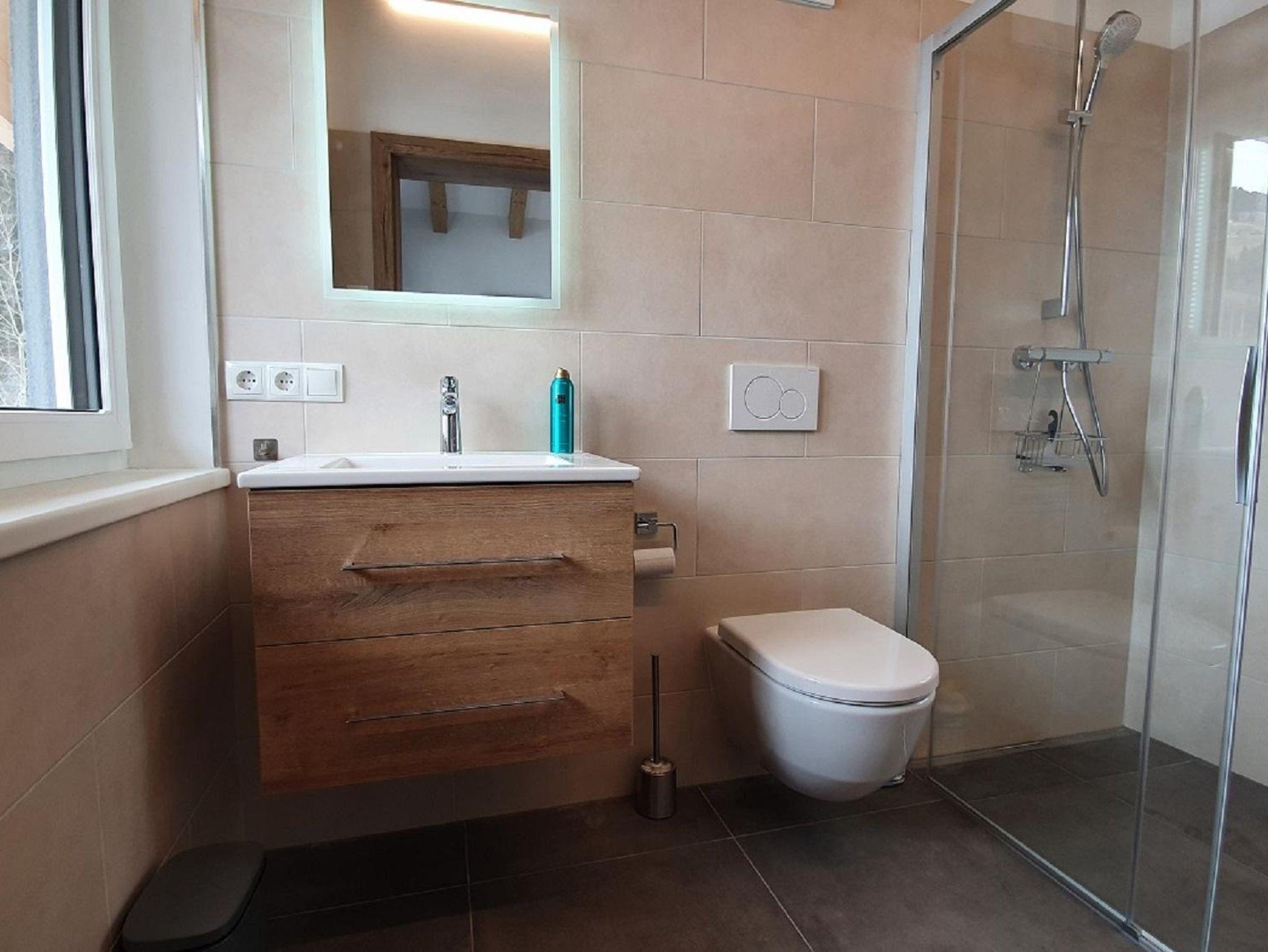 • Badezimmer mit Dusche, WC, Waschbecken und Haarföhn;