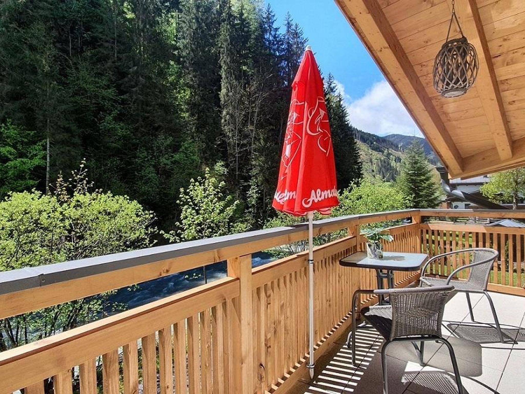 Von den sonnigen Balkonen oder Terrassen genießen Sie einen herrlichen Blick auf die umliegenden Berge, während ein idyllischer Bach hinter dem Haus für besondere Wohlfühlmomente sorgt.