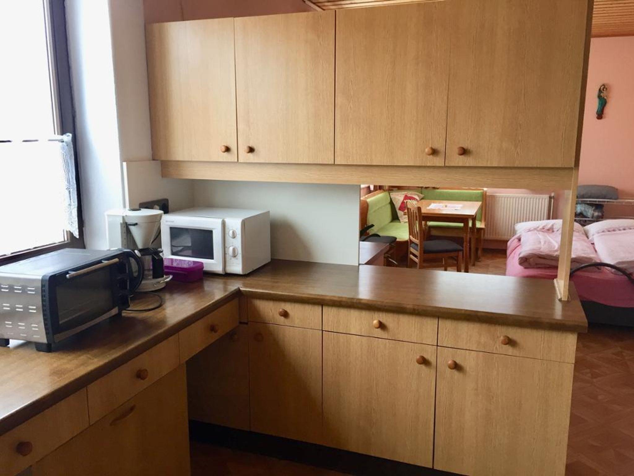 Unsere Ferienwohnung besteht aus einem Vorraum, Bad mit WC, einer Wohnküche mit 2 Sofas und einem Schlafzimmer mit Doppelbett, und einem Abstellraum - bei uns heisst es: die Speis'. Dort befindet sich auch der Kühlschrank und die Gefriertruhe mit dem Frühstücksgebäck. Die Küche ist mit einem Elektroherd mit Backrohr ausgestattet, es gibt auch einen Minibackofen, Mikrowelle, Wasserkocher und eine Kaffeemaschine. Ess- und Kochgeschirr ist vorhanden und ein TV-Gerät ist im Wohnbereich angebracht. Die Essgruppe bietet genug Platz für vier Personen. Die beiden Sofas können in Betten umgewandelt werden. Im Schlafzimmer befindet sich ein Doppelbett und ein Kleiderschrank. Das Badezimmer ist mit Dusche ausgestattet, das WC kann mit einer Falttüre abgetrennt werden.