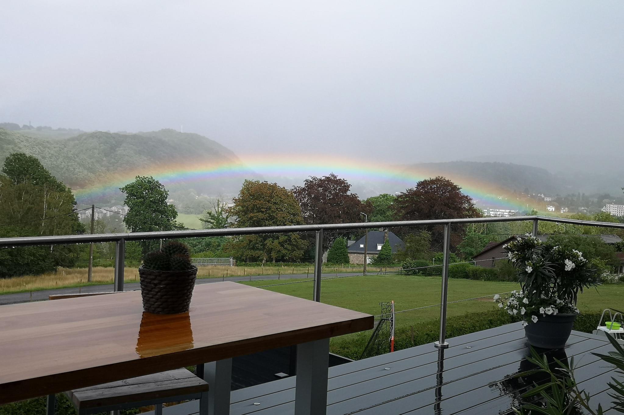 A peaceful abode in Aywaille amid the mountain view and a large terrace and garden calls for a well-deserved holiday in Belgium. There is an outdoor bubble bath to relax and unwind in privacy and an infrared sauna. _x000D_ _x000D_ Situated within the beautiful and green region of the Ardennes, this holiday home ensures tranquility and peace. The town center with the restaurants rests at 2 km. It is a great place to enjoy the streetscape, local cuisine, and shopping. Supermarkets rest at 3 km. Wild World Safari Park, Ninglinspo Valley, Grotte de Remouchamps are some of the nature of Wallonia and nature, you will find the voucher with the reduction voucher information here or at the tourist information center._x000D_ _x000D_ Central heating will keep the indoors cosy. Prepare meals of your choice in the open kitchen. Staying here, you have a furnished garden and a terrace to enjoy outdoor living. Paid bicycles are available on request to explore the area. A cot and a high chair is available. House owner lives here.