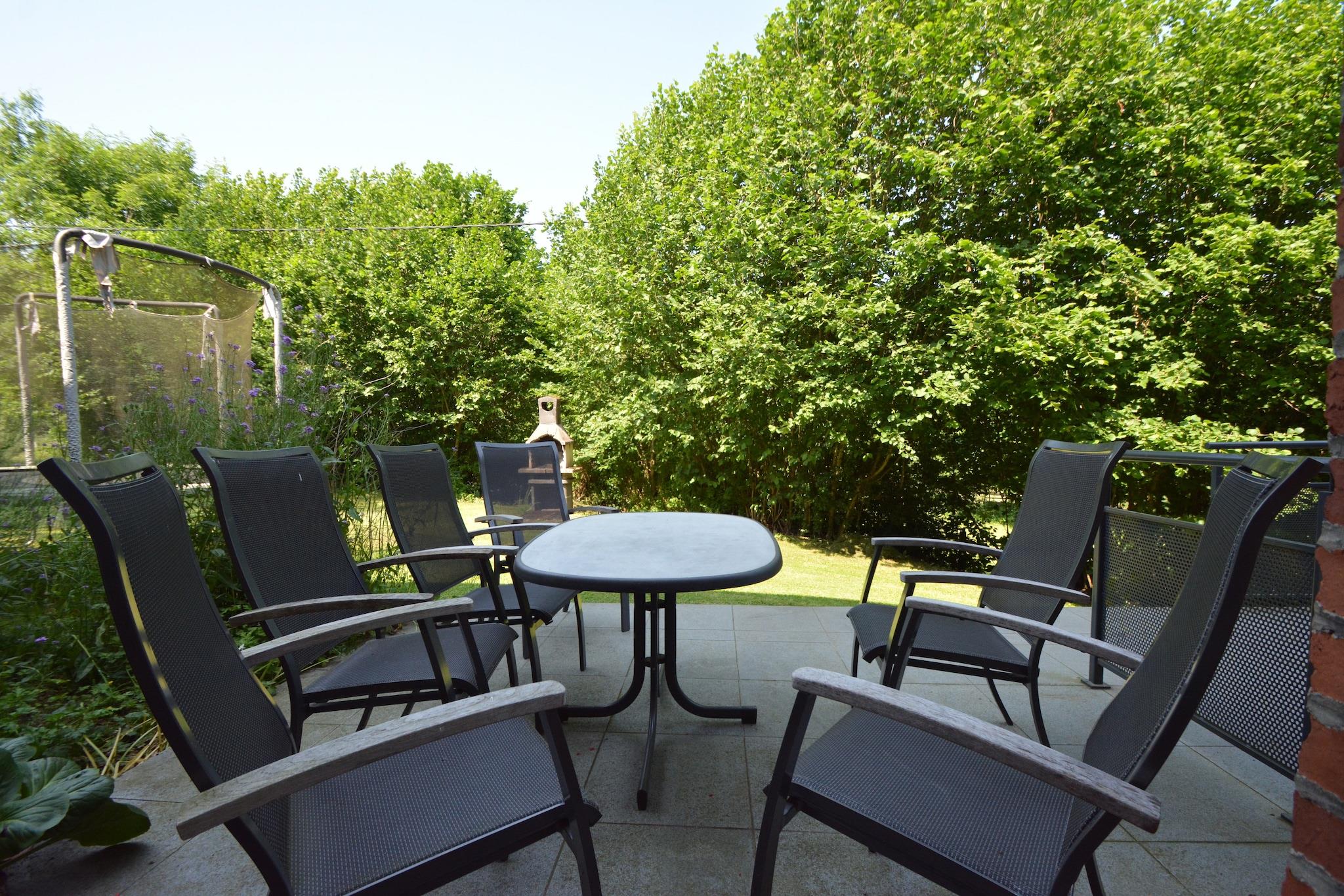 Ground floor: (hallway, dining room, open kitchen(hob, electric kettle, toaster, coffee machine(filter), oven, microwave, dishwasher, fridge-freezer), bedroom(single bed(80 x 200 cm), single bed(80 x 200 cm)), bathroom(bath tub, washbasin, toilet)) On the 1st floor: (Sitting room(TV), bedroom(single bed(90 x 200 cm), double bed(140 x 200 cm))) cot, terrace, garden, garden furniture, BBQ, parking, trampoline