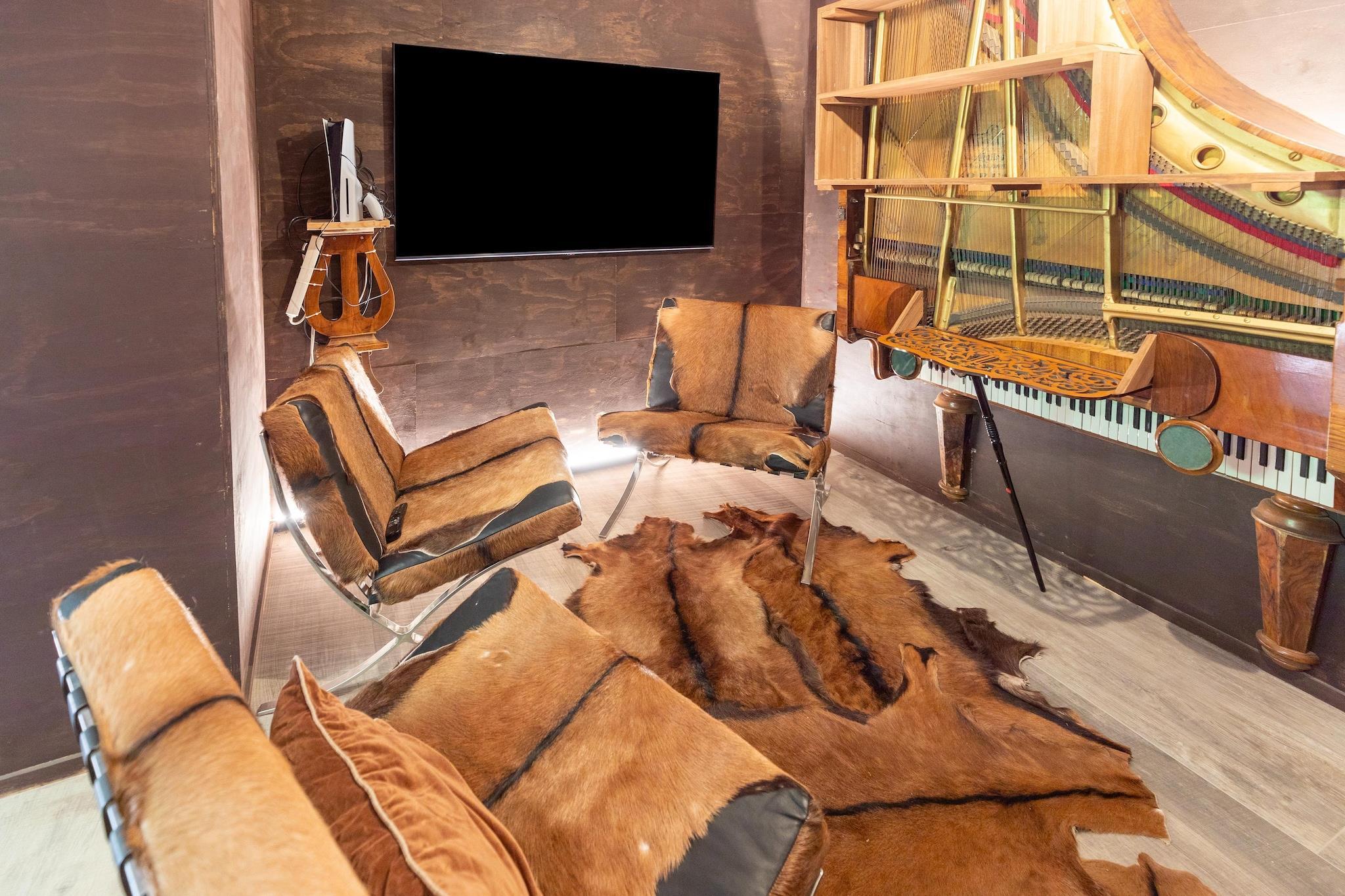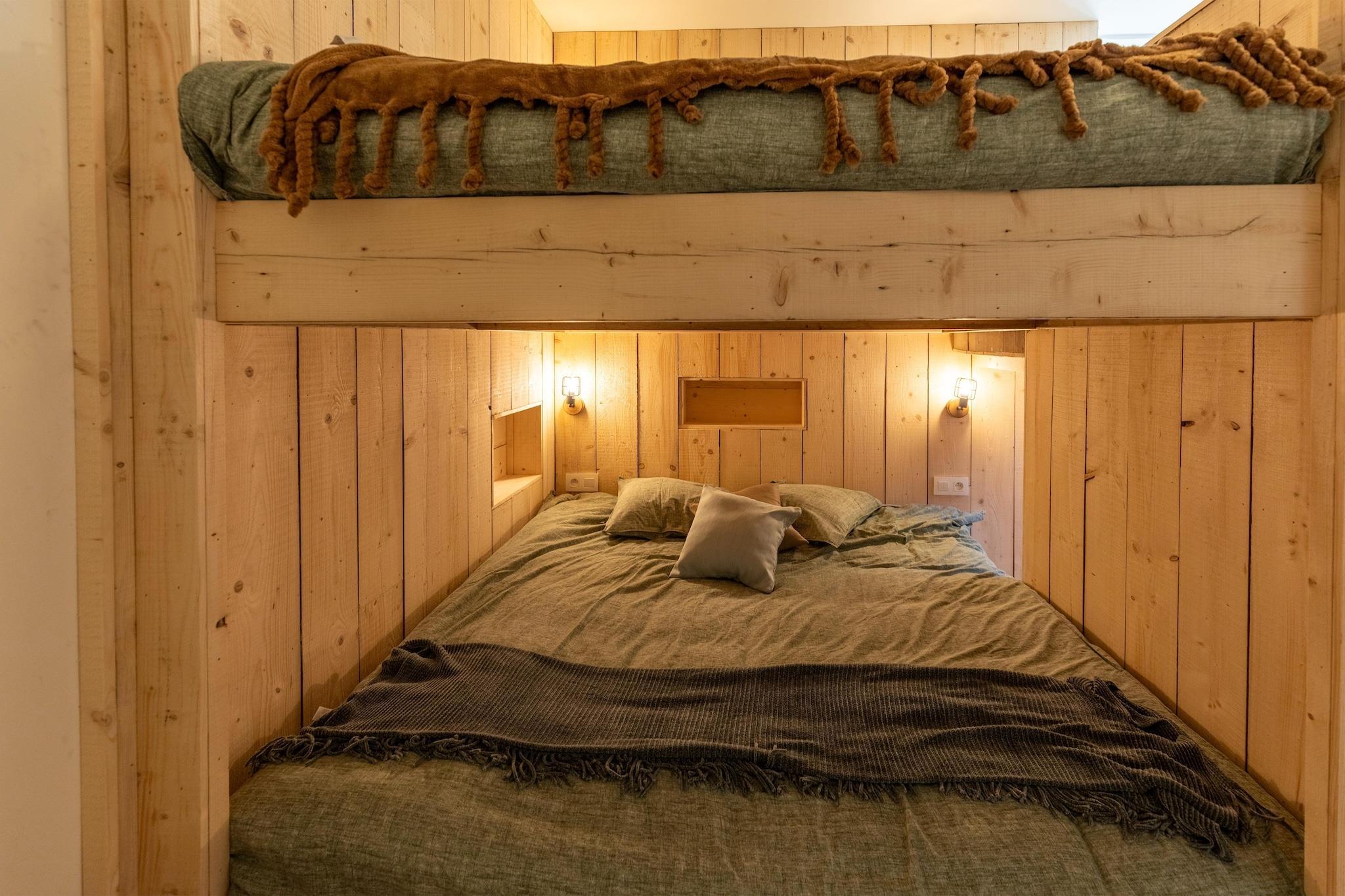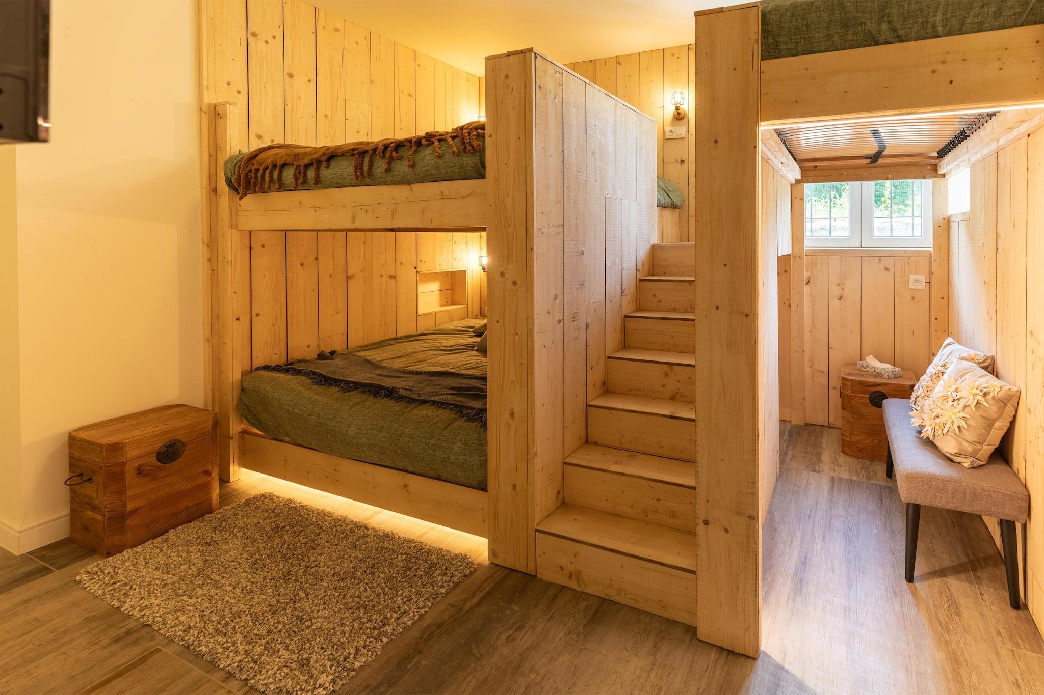 On the 1st floor: (hallway, Living room(TV, fireplace, seating area), Living room(seating area, wireless music system, bar, coffee machine), dining room(dining table), Large kitchen(stove, oven, oven, dishwasher, fridge, fridge-freezer)) On the 2nd floor: (Bedroom with bathroom(double bed, TV, shower, washbasin, toilet), Bedroom with bathroom(double bed, TV, shower, washbasin, toilet), Bedroom with bathroom(double bed, TV, shower, washbasin, toilet), bathroom(bath tub, shower(walk-in shower), washbasin, toilet), toilet) On the 3rd floor: (bedroom(double bed), bedroom(double bed)) Basement: (Bedroom with bathroom(single loft bed, double bed, double loft bed, shower, washbasin, toilet), recreation room(seating area, streamingservice, billiards, playstation)) Pool house: (shower, toilet) Log cabin: (BBQ) Bubble bath(private), garden(private), garden furniture, parking, swimming pool(private, heated)