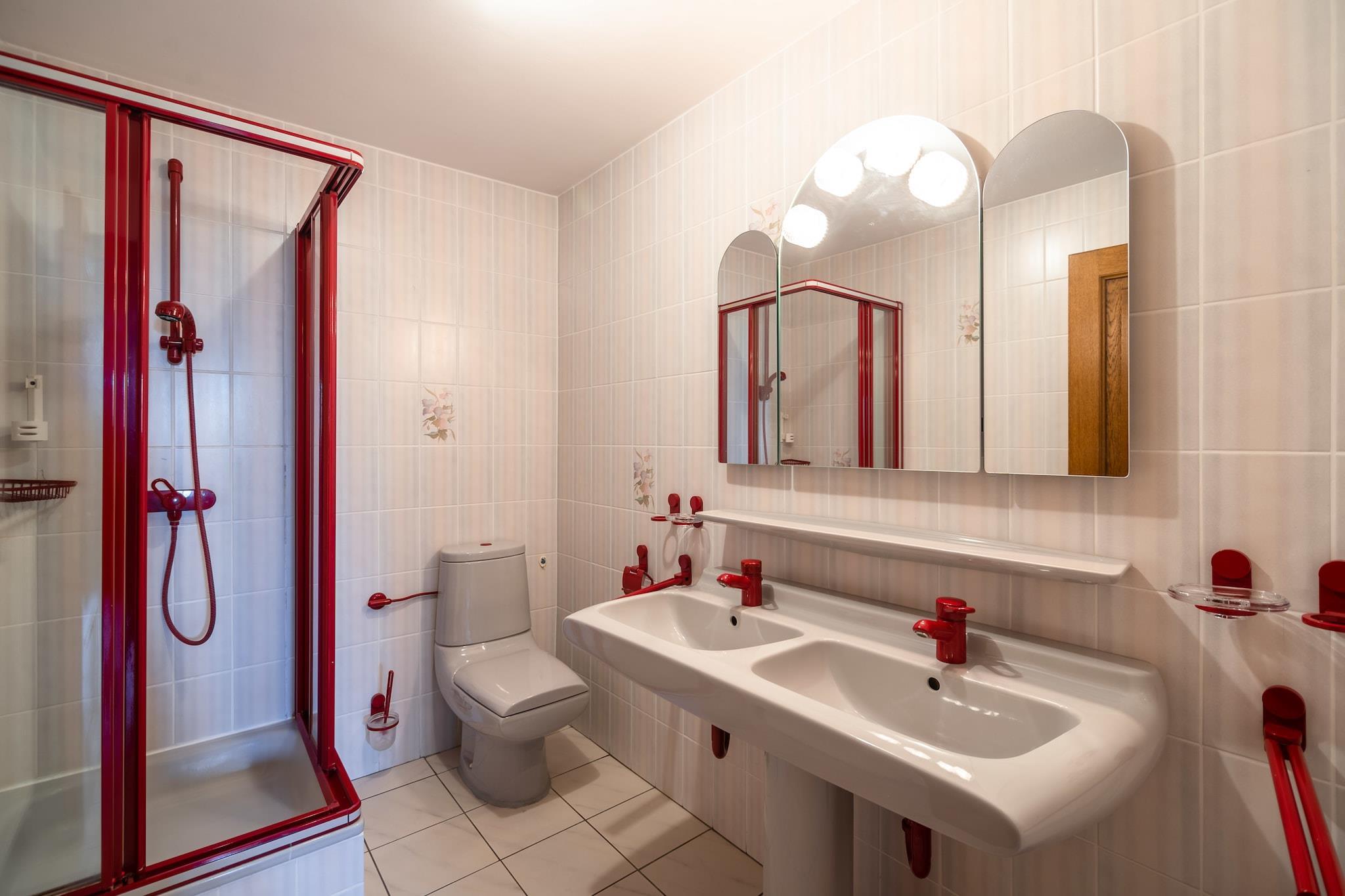 Ground floor: (Entrance, Living room(bar(with beer tap), play equipment), dining room(dining table), Kitchen(electric kettle, toaster, cooker(gas, electric), coffee machine, oven, grill, microwave, dishwasher, fridge-freezer), bedroom(single bed, single bed, single bed, single bed, single bed, single bed, single bed, single bed, single bed, single bed), toilet, toilet, recreation room) On the 1st floor: (Bedroom with bathroom(2x single bed(boxspring), bath tub, washbasin, toilet), Bedroom with bathroom(single bed, double bed or 2 single beds(boxspring), shower, washbasin, toilet), Bedroom with bathroom(2x single bed(boxspring), shower, washbasin, toilet), Bedroom with bathroom(2x single bed, single bed, shower, washbasin, toilet), Bedroom with bathroom(2x single bed(boxspring), shower, washbasin, toilet), Bedroom with bathroom(2x single bed(boxspring), bath tub, washbasin, toilet), toilet) On the 2nd floor: (Bedroom with bathroom(4x single bed, shower, washbasin, toilet), walk-through bedroom(4x single bed, double bed(two single duvets, two single blankets), shower, washbasin, toilet)) Basement: (washing room(tumble dryer, washing machine), garage, fridge, bicycle storage, table tennis table) cot, garden, garden furniture, BBQ, parking, high chair