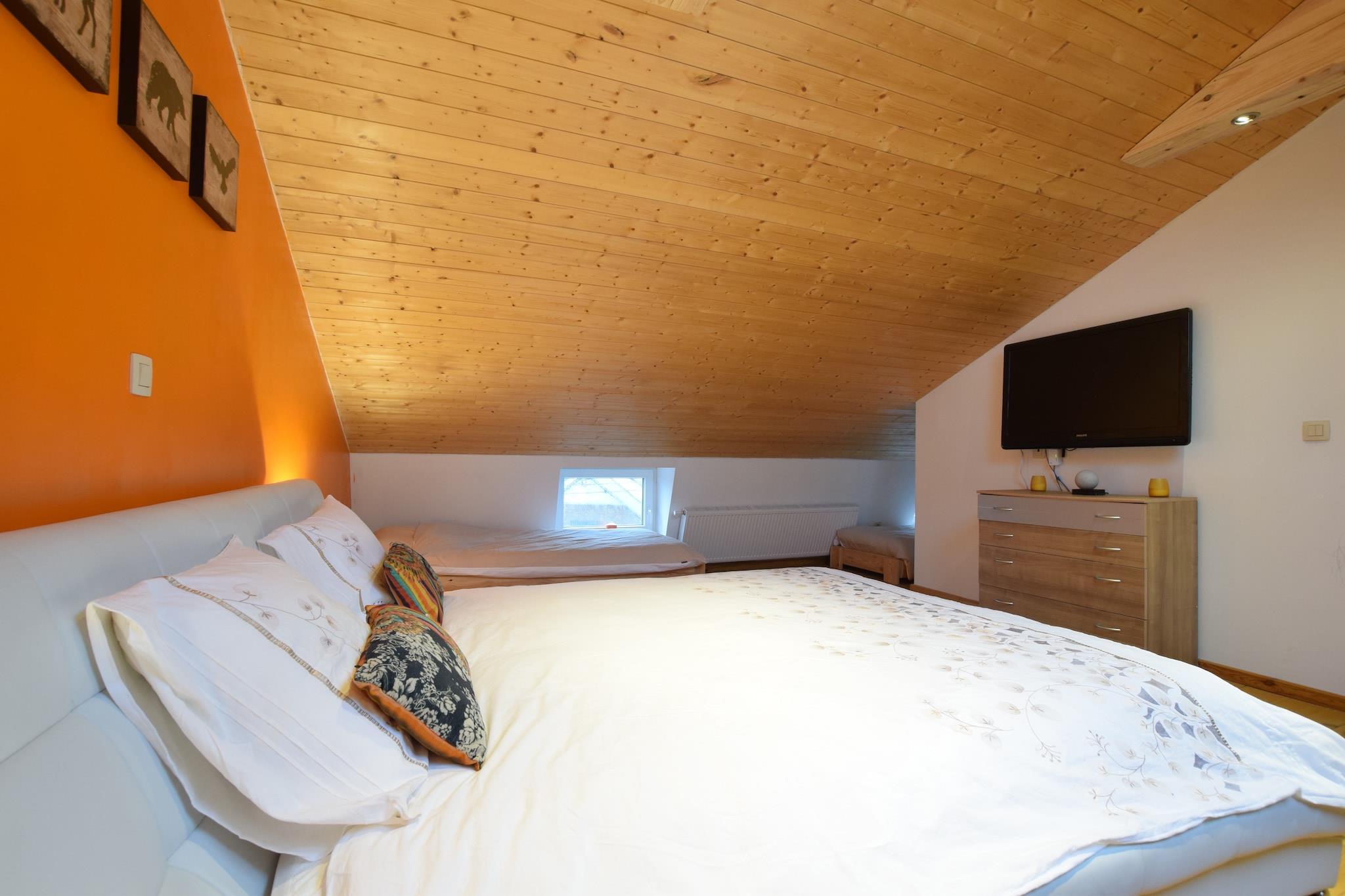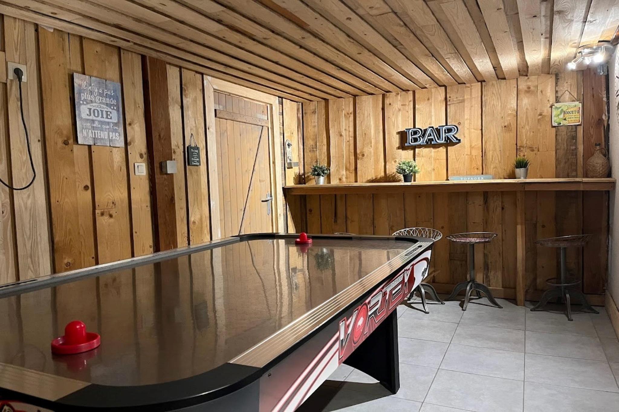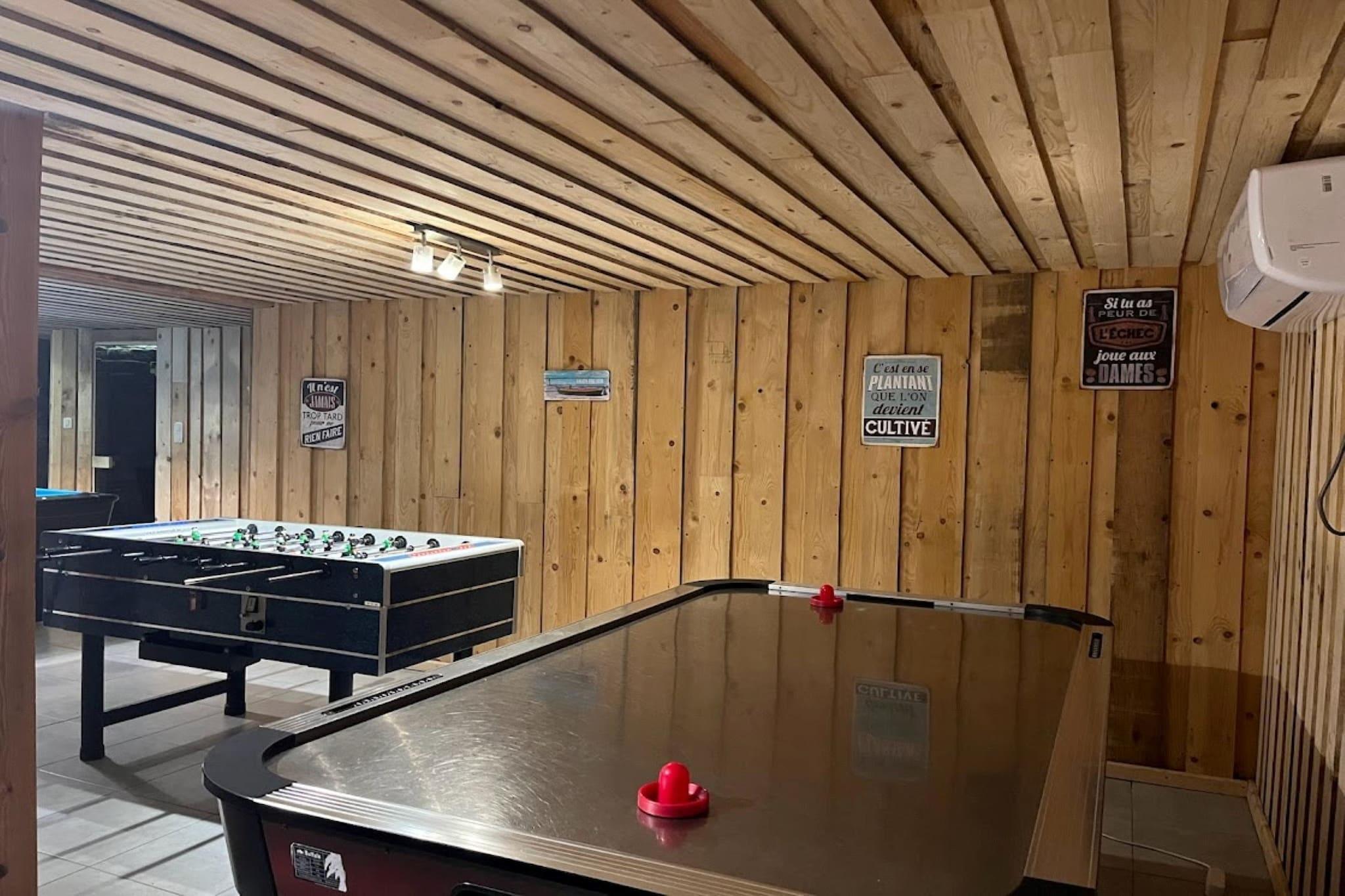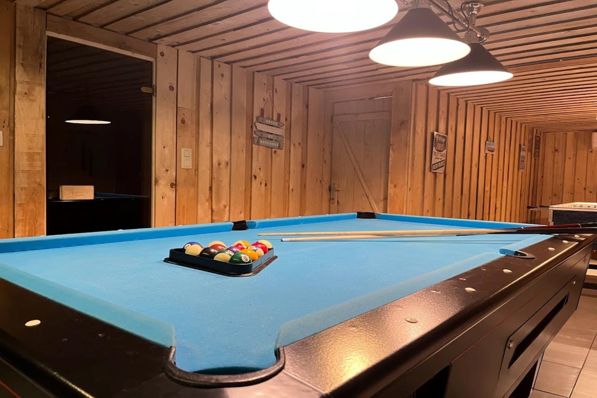 Ground floor: (Kitchen(electric kettle, cooker(gas), coffee machine(filter, pads), espresso machine, oven, microwave, dishwasher, fridge, freezer), Living/diningroom(TV(digital), dining table, fireplace, high chair), terrace) On the 1st floor: (bedroom(double bed(160 x 200 cm)), bedroom(single bed(90 x 200 cm), double bed(180 x 200 cm)), bathroom(bathtub with shower, 2x washbasin, toilet)) On the 2nd floor: (bedroom(2x single bed(90 x 200 cm), double bed(160 x 200 cm)), bathroom(shower, washbasin, toilet, bidet)) Basement: (bathroom(shower), relaxation area(tumble dryer, sauna, washing machine, table football, air hockey, billiards)) cot, Bubble bath, heating(central), terrace, garden(partially fenced), garden furniture, BBQ, parking, slide, Swing set