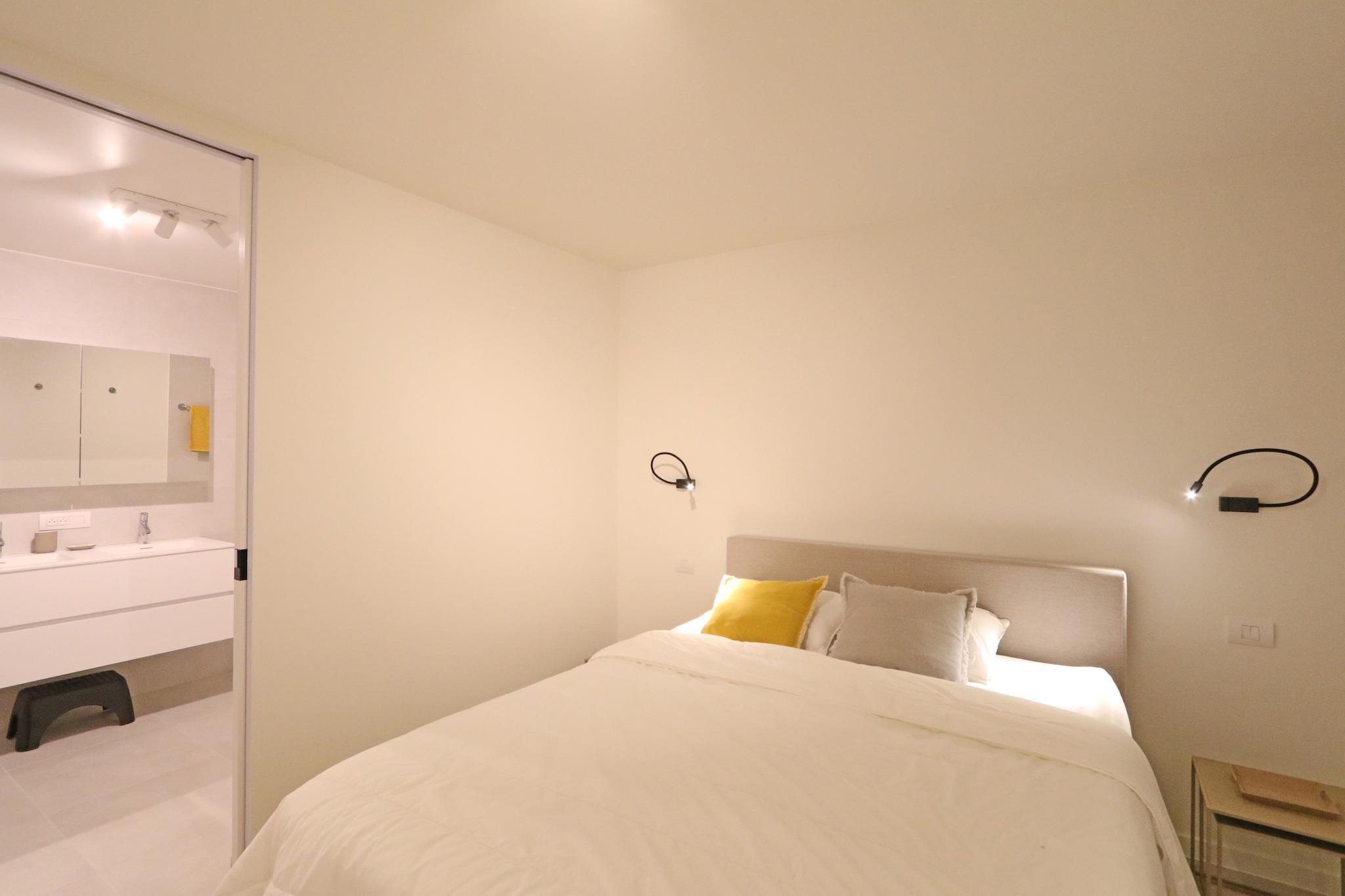 On the 2nd floor: (open kitchen(hob(induction), electric kettle, toaster, coffee machine(cups, filter), combination microwave, dishwasher, fridge-freezer, Blender), Living/diningroom(TV(satellite), dining table, seating area), bedroom(double bed(twin duvet)), bedroom(bunk bed(duvet)), Bedroom with bathroom(double bed(twin duvet), bathtub with shower, washbasin, washbasin, toilet), bathroom(shower, washbasin), toilet(toilet), Internet access) tumble dryer, washing machine, patio, terrace, bicycle storage, lift, high chair, ironing board, hairdryer, Sea view