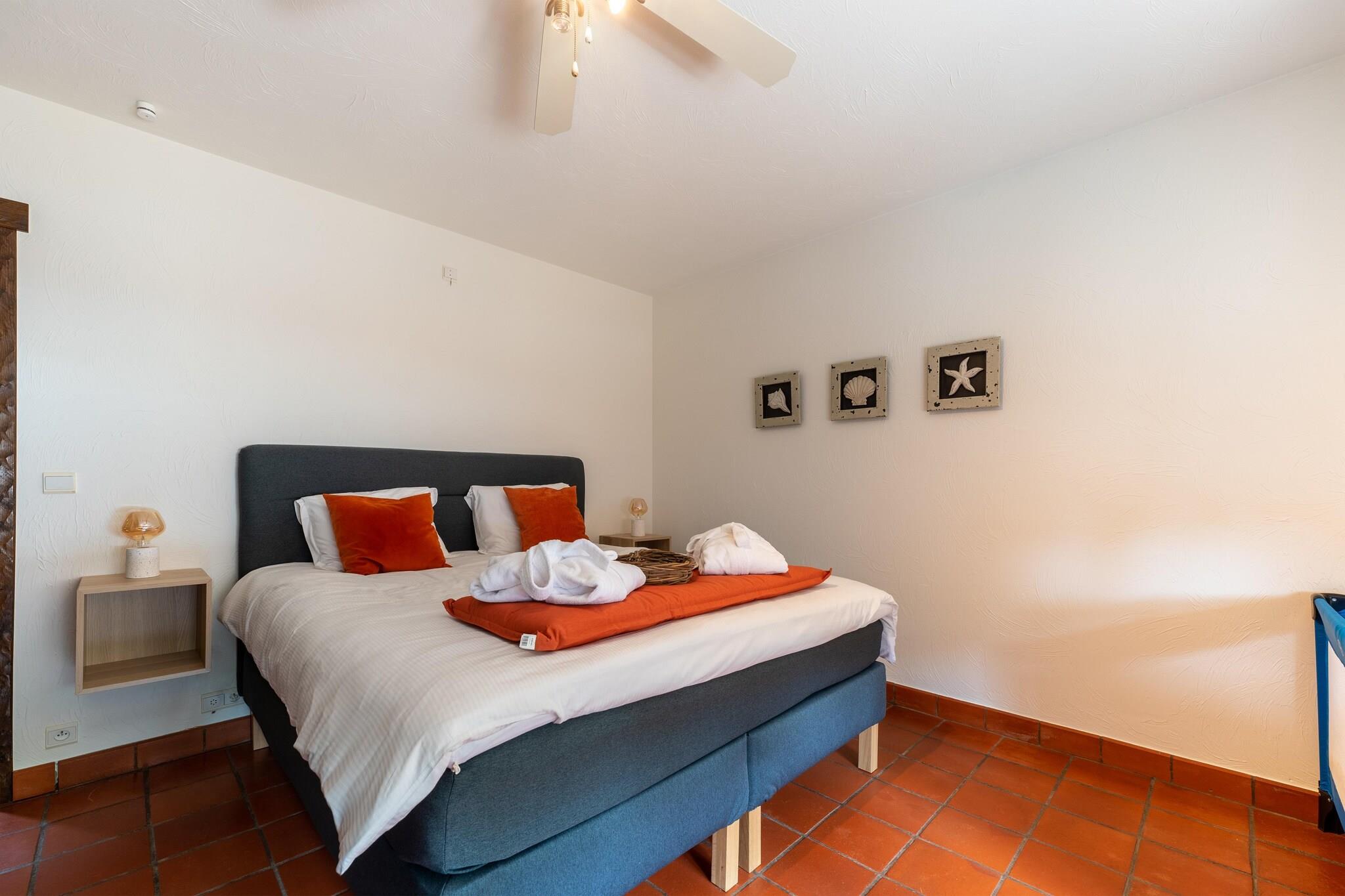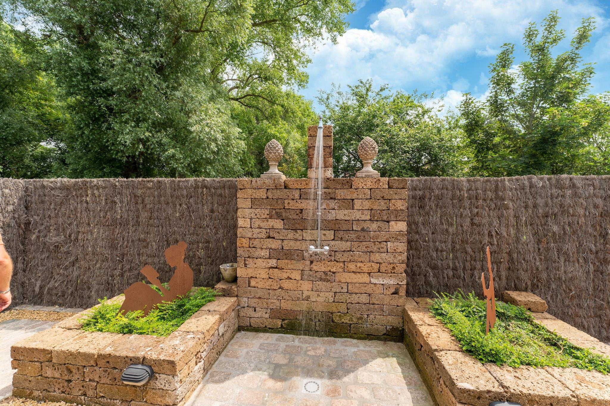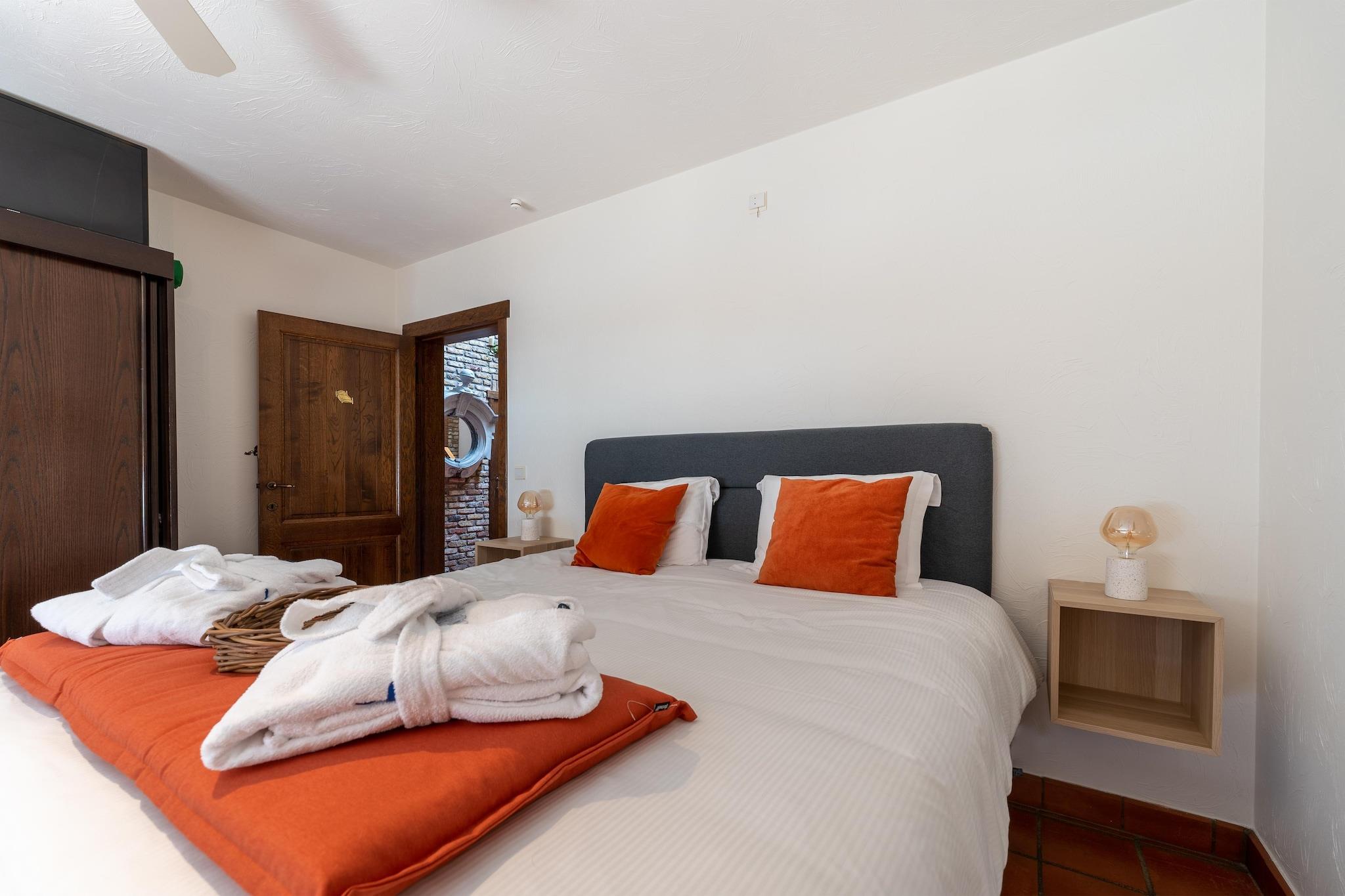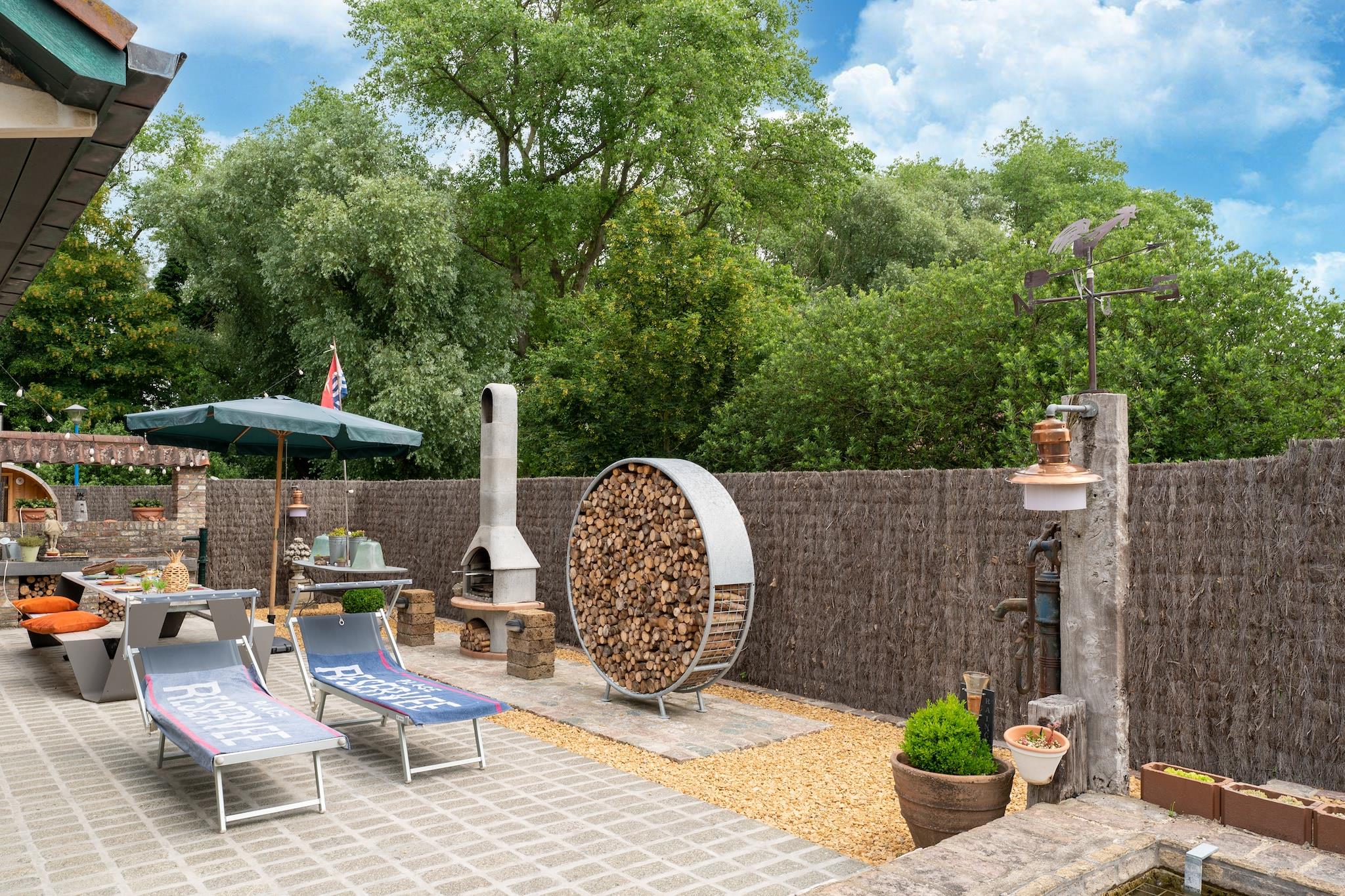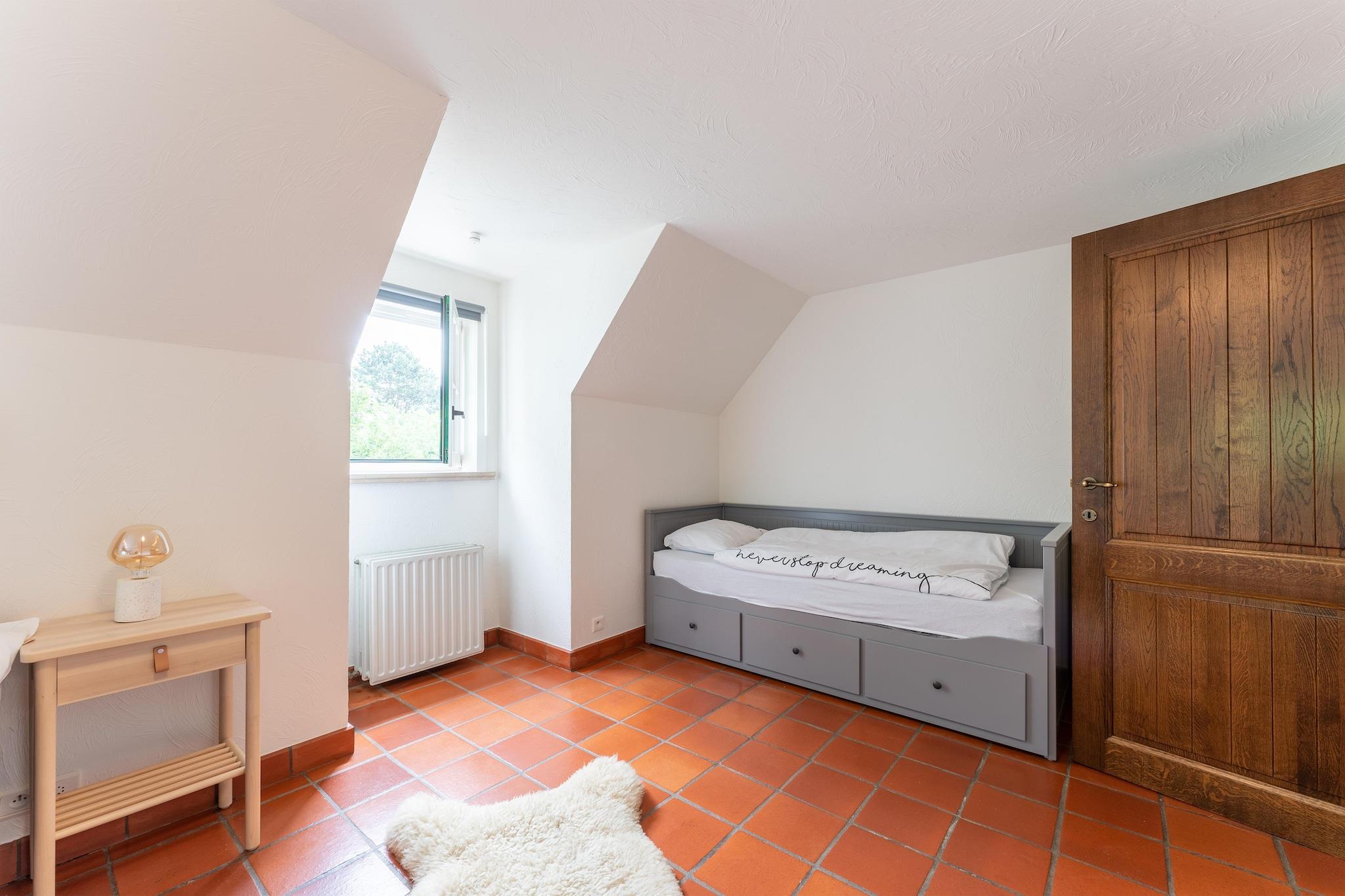 This extremely luxurious holiday home has a great location, just outside the centre on a cul-de-sac. In this oasis of tranquillity, you can enjoy your beautiful surroundings and the various facilities that the home has to offer. Ideal for holidays with family or friends or for business meetings. You can reach the woods, the cosy city center and even the vibrant nightlife in no time. You will find a wide range of high-quality restaurants. Discover the impressive flora and fauna during walking tours through the Provincial Recreational Domain of Zilvermeer. A flying club where you can go gliding is also located within a radius of 10 km. Lght the barbecue or the outdoor fireplace for a relaxing evening. The residence has a bicycle shed where electric bicycles can be charged. Enjoy the view of the setting sun before getting ready for a carefree night's sleep in the bedrooms that are furnished as luxury hotel suites, each with its own bathroom, air conditioning, TV and box-spring mattress.