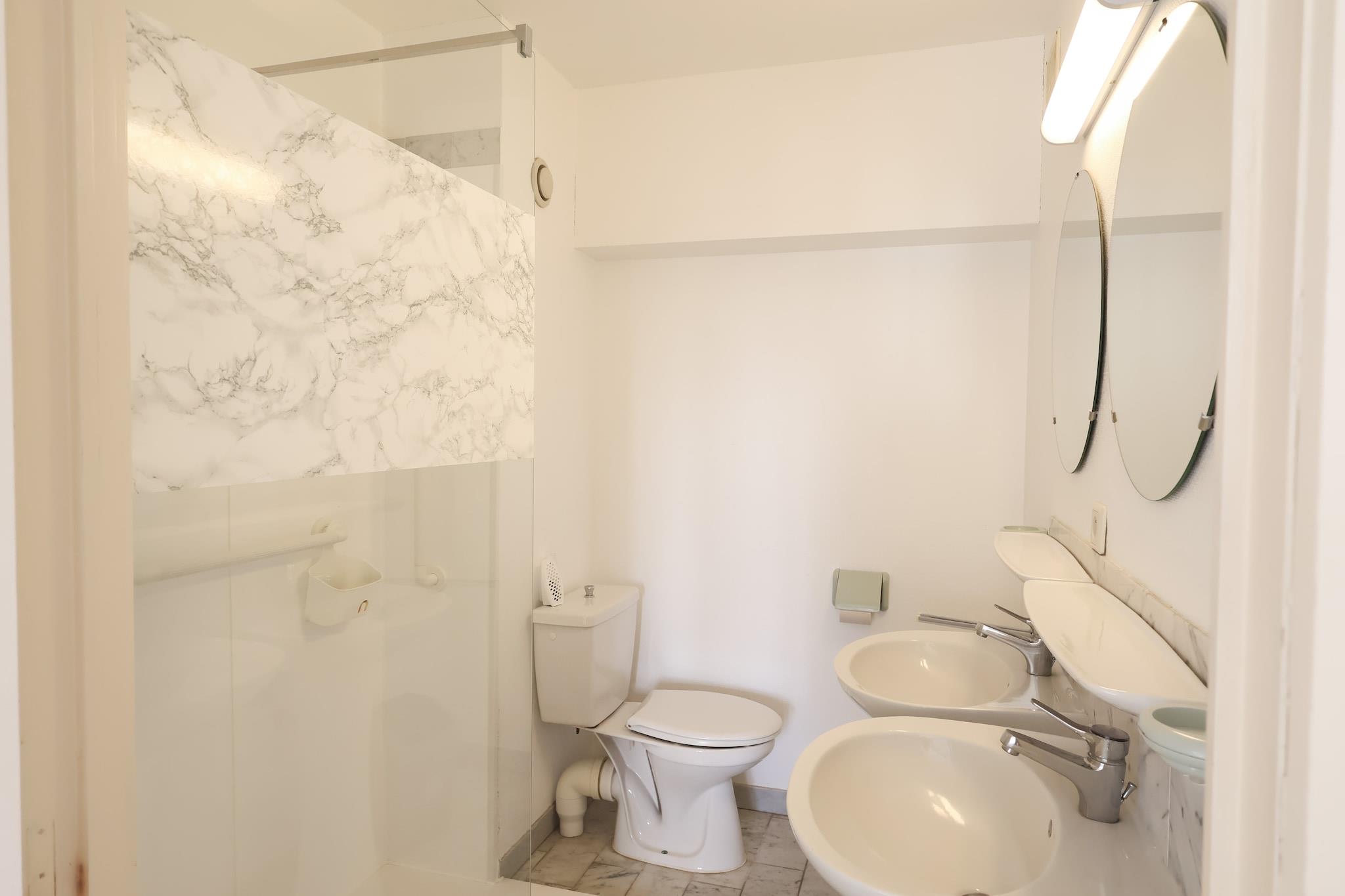 On the 5th floor: (open kitchen(hob, coffee machine(filter, pads), combination microwave, dishwasher), Living/diningroom(TV(digital), dining table, seating area, DVD player, stereo unit, balcony or terrace), bedroom(double bed(twin duvet, 140 x 200 cm)), bedroom(double bed or 2 single beds(duvet, 90 x 200 cm)), bedroom(single bed(duvet, 90 x 200 cm), single bed(duvet, 90 x 200 cm)), bathroom(shower, washbasin, toilet), toilet(washbasin, toilet), storage) DVD player, terrace, parking, heating, Sea view