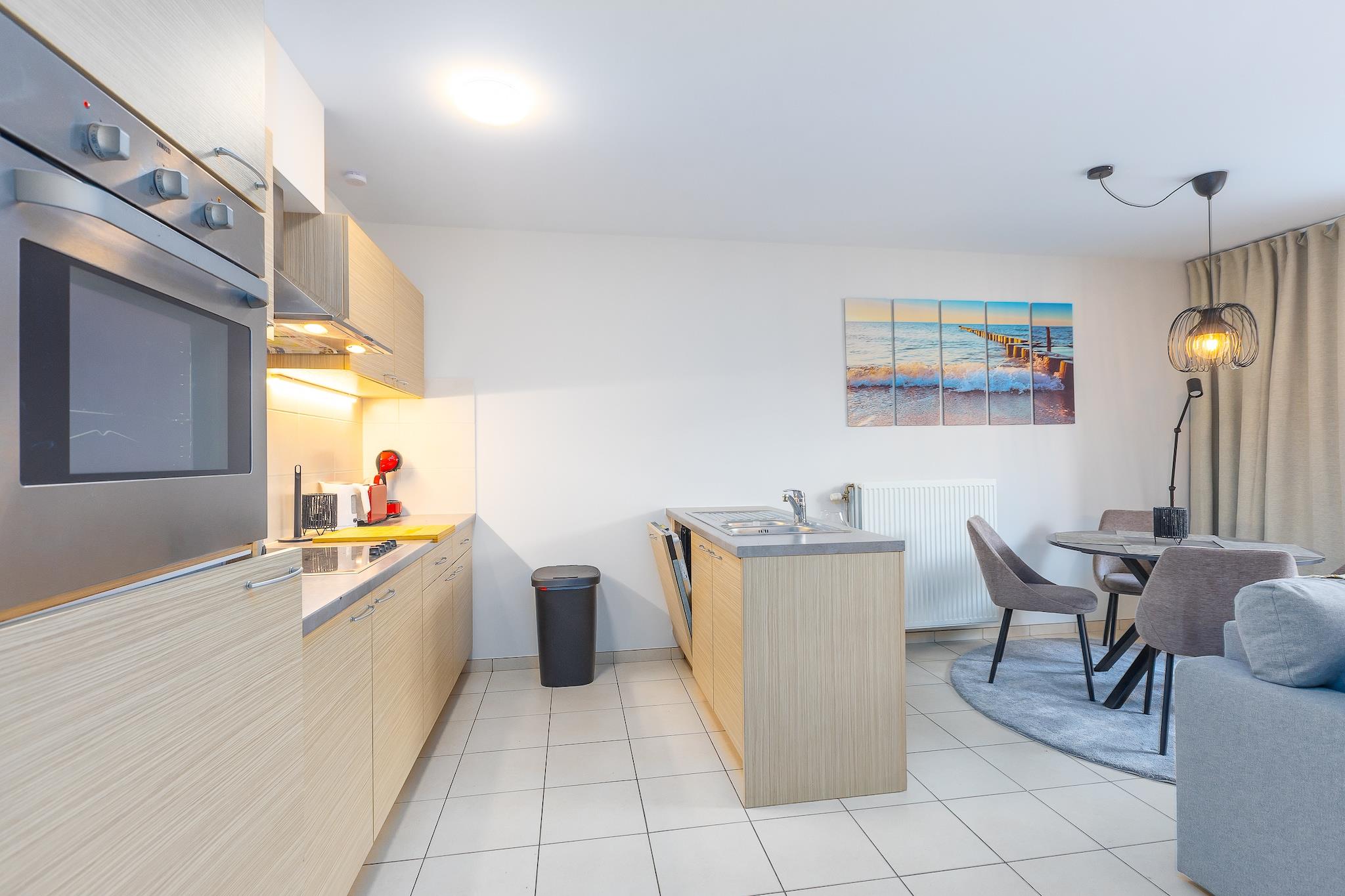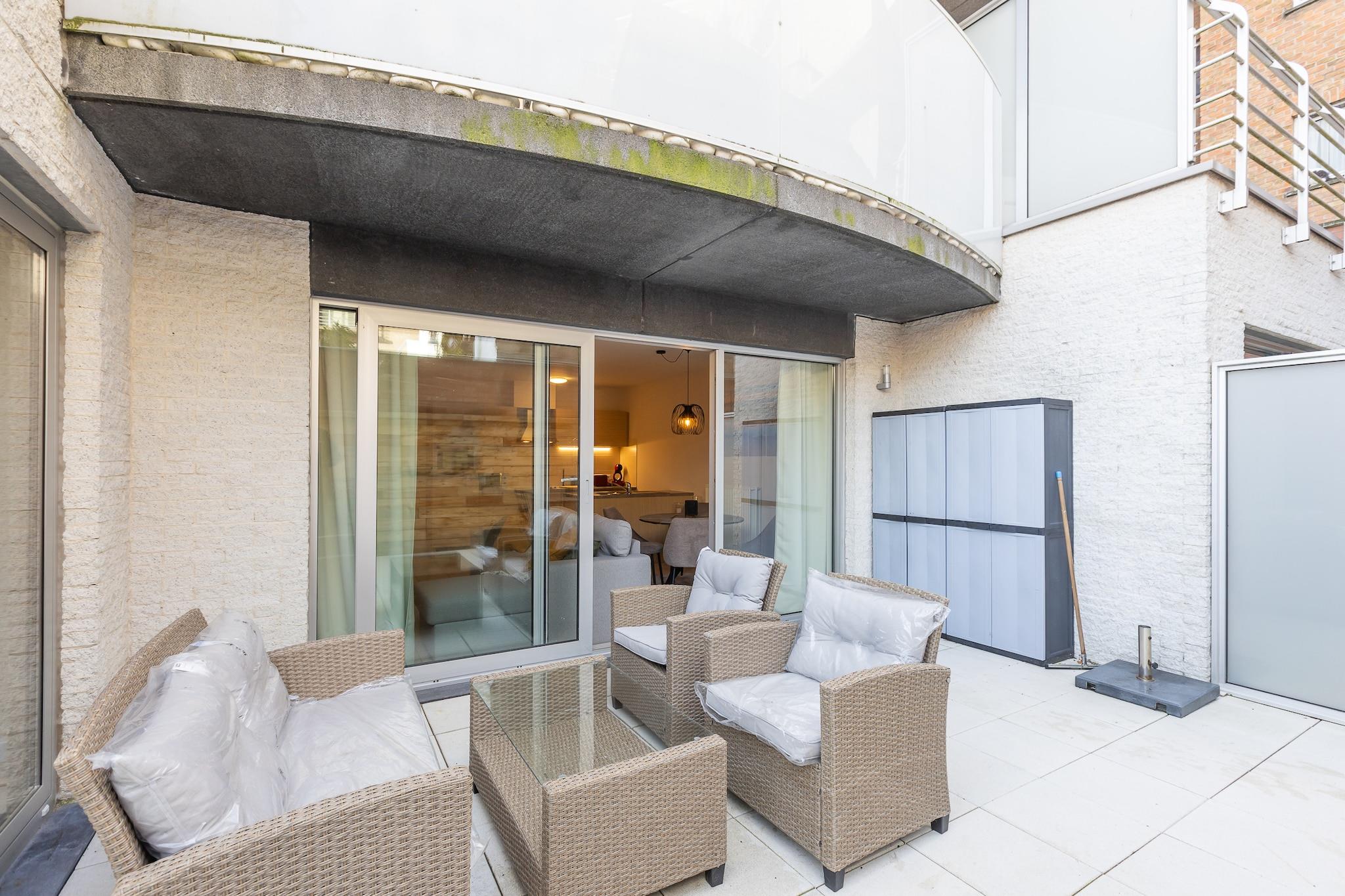 Cozy ground floor apartment with 1 bedroom (with double bed) and a bright, spacious living room with a sofa bed for 2 people. The floor-to-ceiling windows across the entire width fill the living room with light and open directly onto the spacious south-facing terrace with outdoor furniture – perfect for breakfast or relaxing in the sun. The apartment also features a modern open kitchen, bathroom with shower, separate toilet, and a practical storage room with washing machine. The residence is just steps from the beach; step outside, cross the street, and you are on the promenade. A tram stop nearby takes you in minutes to Middelkerke or the center of Ostend. Perfect for a relaxing seaside holiday! Wifi: yes - parking: not included - sheets: bring your own - towels: bring your own.