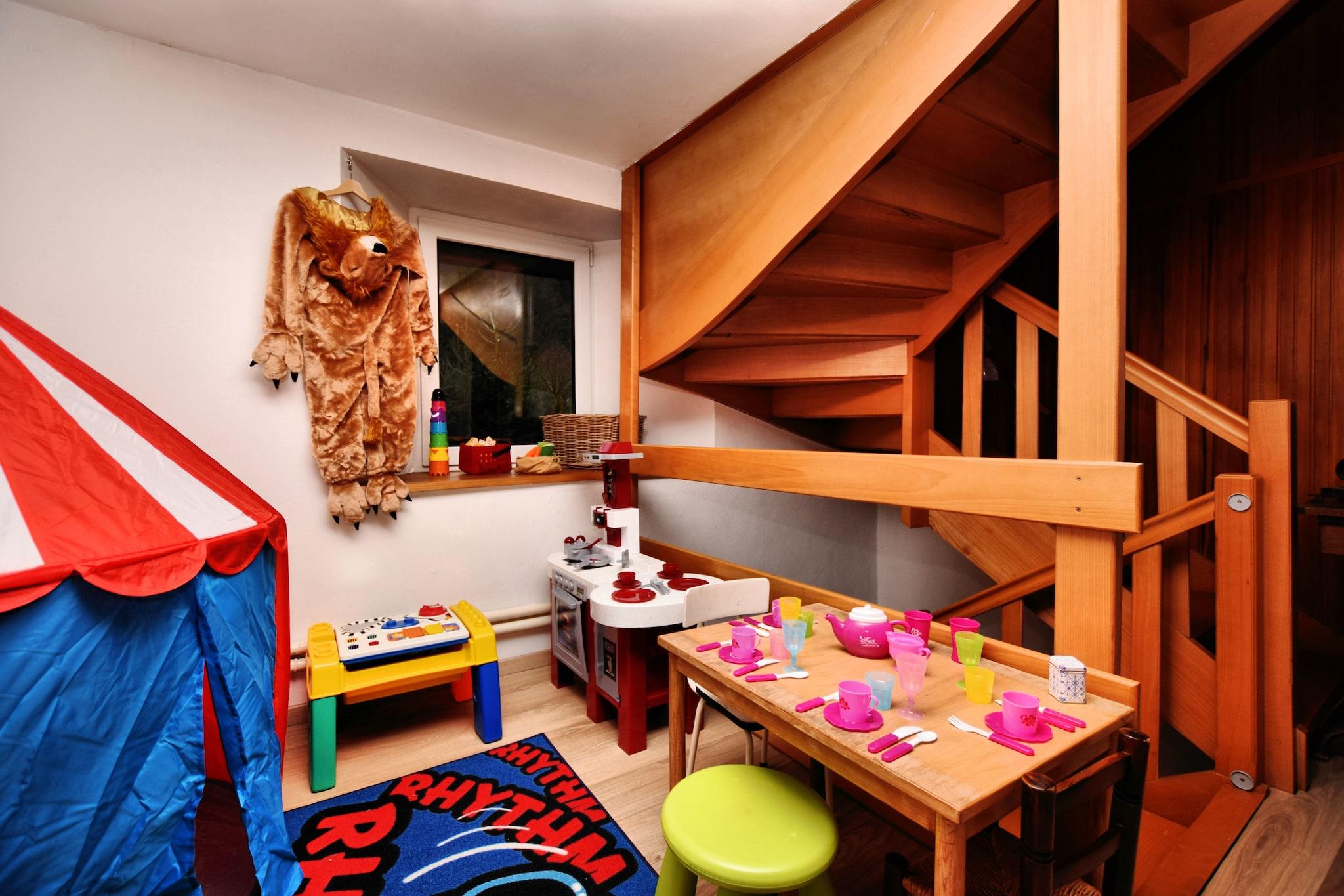 Ground floor: (Kitchen(cooker(4 ring stoves, ceramic), 2x coffee machine(pads), oven, microwave, dishwasher), Living/diningroom(TV, dining table, seating area), bathroom(shower, washbasin, toilet), pantry(dining table, fridge-freezer)) On the 1st floor: (bedroom(double bed(boxspring, 180 x 200 cm)), bedroom(double bed(boxspring, 180 x 200 cm)), bedroom(double bed(180 x 200 cm)), bedroom(single bed, camping cot, infrared sauna), bathroom(shower, washbasin, toilet), Landing(play equipment), children's bed) Attic: (Bedroom with bathroom(double bed(160 x 200 cm), bathtub with shower, washbasin)) DVD player, game computer, tumble dryer, hot tub, sauna, washing machine, terrace, garden(50 m2), garden(1000 m2), garden furniture, BBQ, parking, boules court, play equipment, table football, billiards, high chair