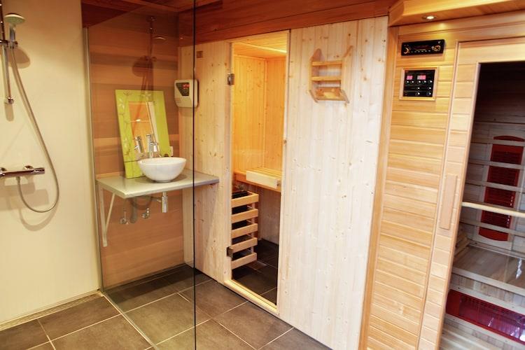Ground floor: (hallway, Sitting room(6 persons)(fireplace, DVD player, radio, CD player, stereo unit), open kitchen(dining table(6 persons), cooker(ceramic), coffee machine(filter), oven(grill-oven), microwave, dishwasher, fridge(+ freezer), high chair), bathroom(shower, washbasin), toilet, terrace(24 m2)) On the 1st floor: (bedroom(double bed, children's bed), bedroom(double bed(twin duvet), TV), bathroom(shower, washbasin, toilet)) On the 2nd floor: (bedroom(2x single bed(duvet))) Guest house ground floor: (sauna(3 persons), infrared sauna) Bubble bath, heating(central), garden(fenced), garden furniture, BBQ, parasol