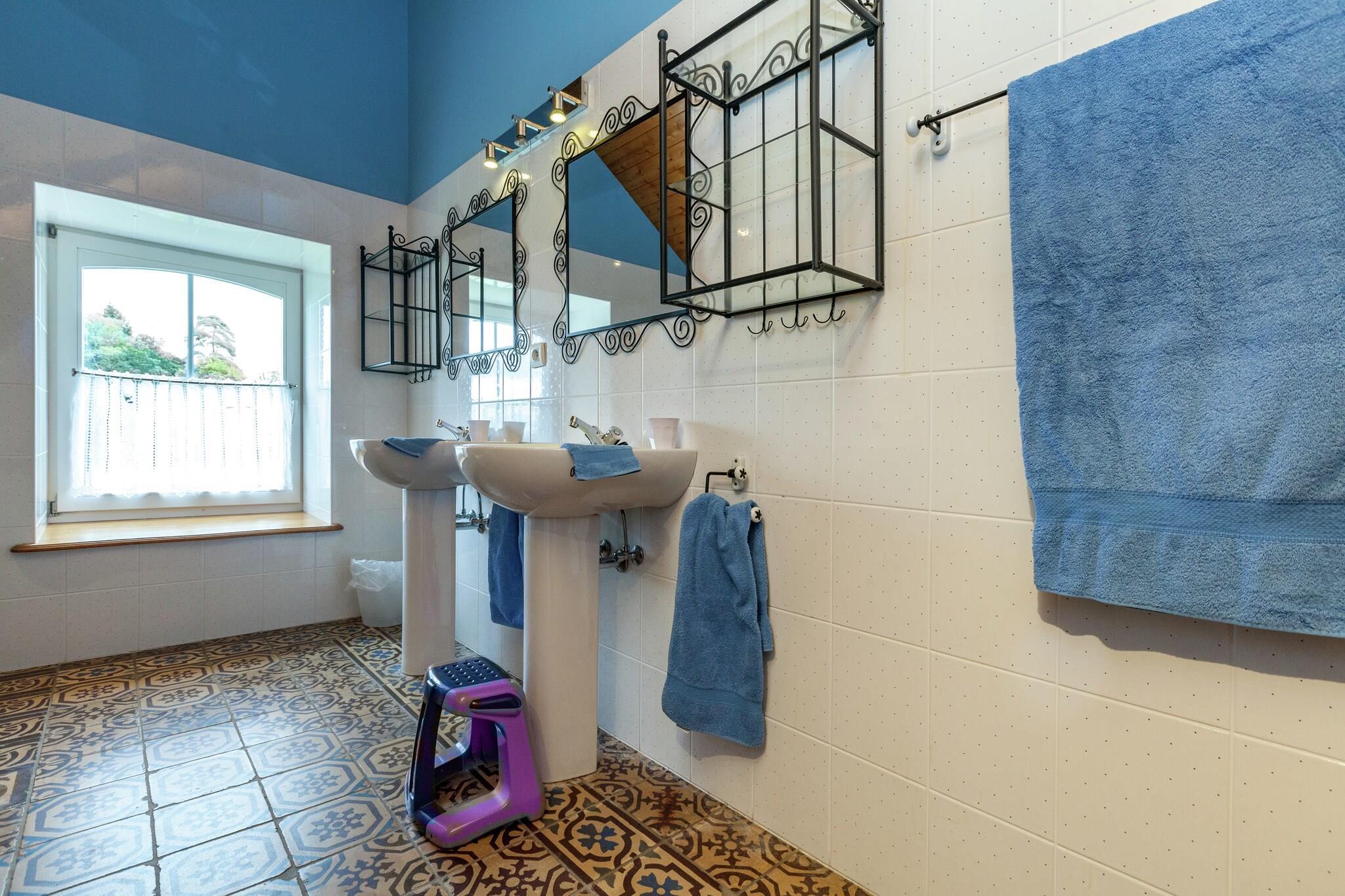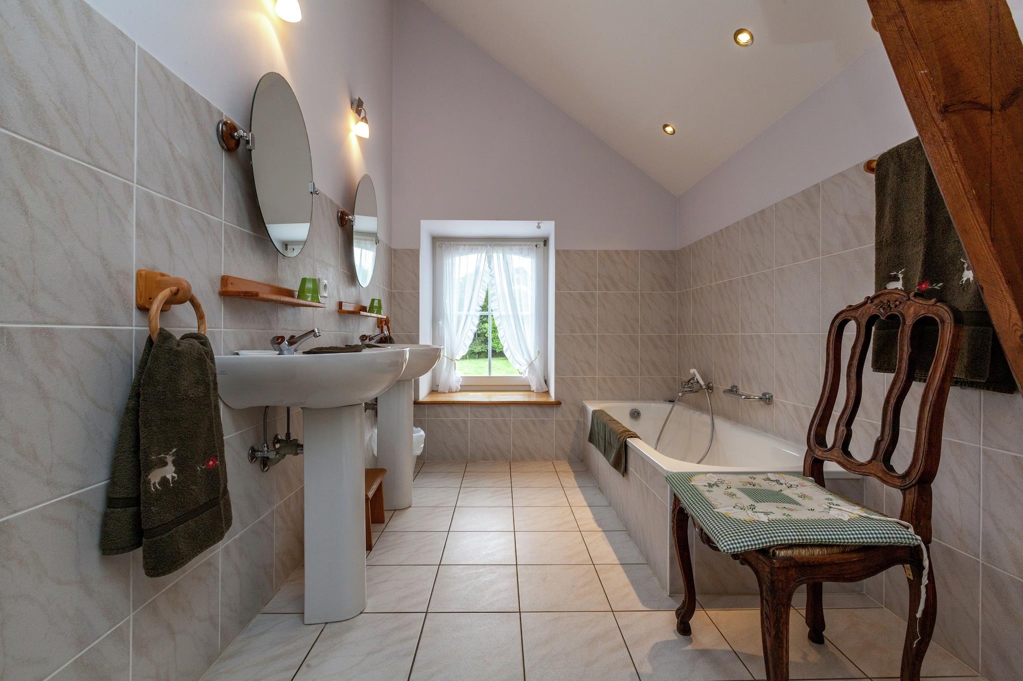 This cosy holiday home is a former stable that has been stylishly renovated into a luxury residence and is perfect for a group of 13. It is located in a peaceful area, 460 m above sea level on a gorgeous private property in Saint-Hubert and has 5 bedrooms. A sauna is in place for you to give maximum relaxation. The holiday home is situated near a lovely forest and you can go fishing for trout in a nearby private lake for a fee. There are tons of hiking and (mountain) biking trails in the region. Within 6 km from the home, you can find a restaurant and grocery store. In the spacious and nicely decorated living area, you'll find a cosy open fireplace. The completely furnished open kitchen with attached dining area has a homely, intimate feel and contains a dining table. The garden offers access to a large terrace with a barbecue where you can enjoy a panoramic view of the hilly surroundings. The home also has a trampoline, and sandpit for the kids.