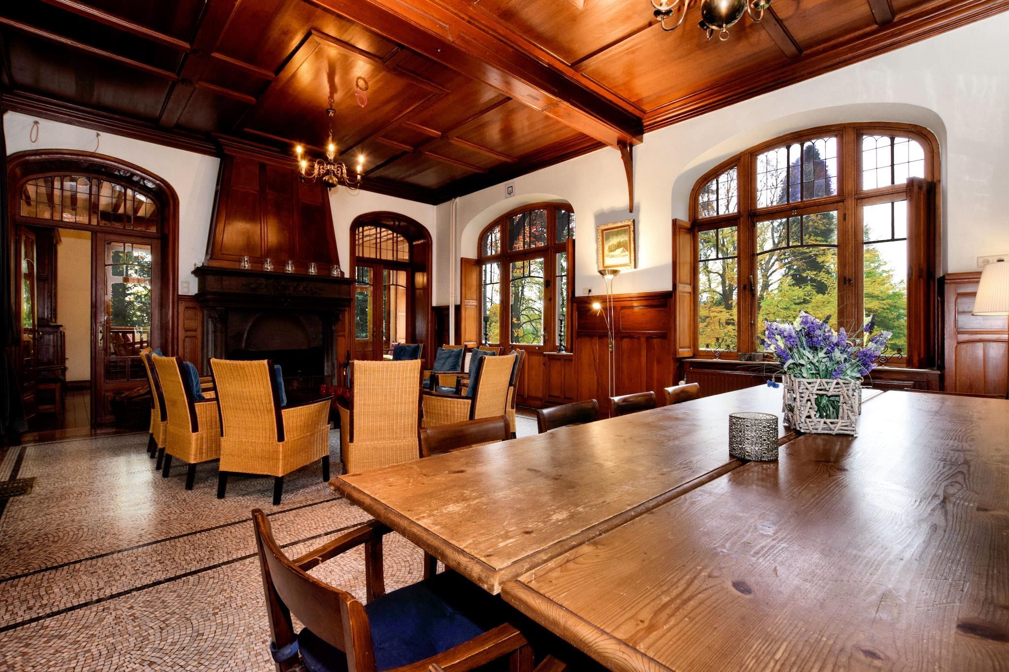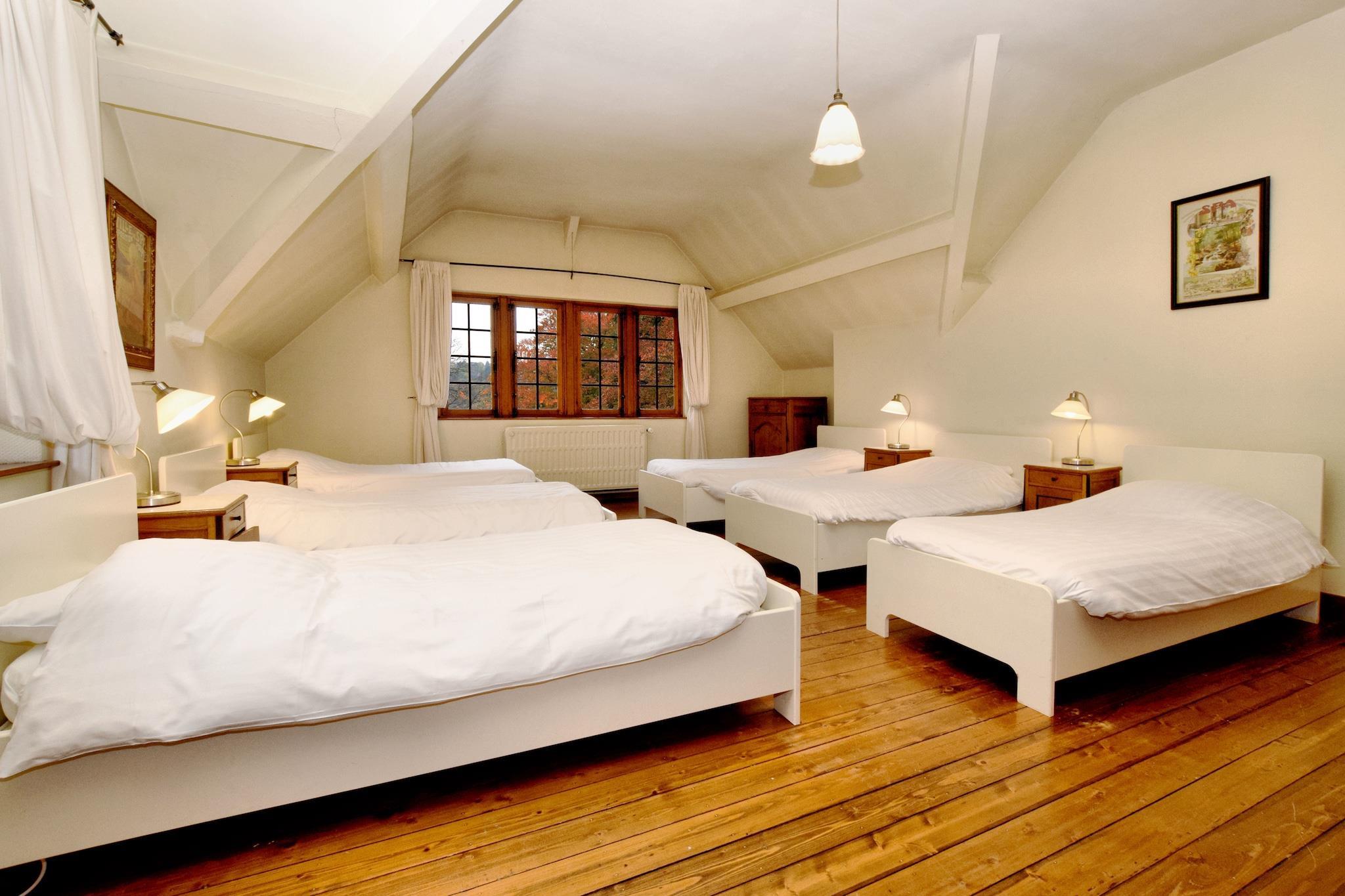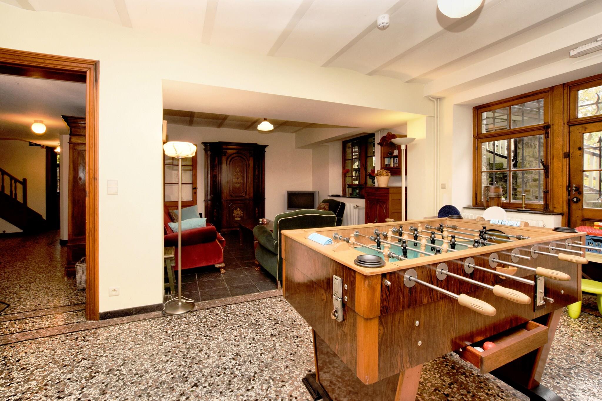 Ground floor: (Living room(seating area), dining room(dining table), Kitchen(cooker(5 ring stoves, induction), oven, dishwasher, fridge, freezer), toilet, library) On the 1st floor: (bedroom(2x single bed, washbasin), bedroom(3x single bed, washbasin), Bedroom with bathroom(5x single bed, bathtub with shower, 2x washbasin, toilet), Bedroom with bathroom(2x single bed, shower, washbasin, toilet), bathroom(shower, washbasin, toilet)) On the 2nd floor: (bedroom(2x single bed), bedroom(2x single bed, washbasin), bedroom(3x single bed, washbasin), bedroom(2x single bed, washbasin), Bedroom with bathroom(6x single bed, bathtub with shower, 2x washbasin), bathroom(shower, washbasin, toilet), toilet) Basement: (Sitting room(TV, DVD player, table football), dining room(dining table), Kitchen(cooker(5 ring stoves, gas), oven, microwave, dishwasher, fridge, freezer), bathroom(bathtub with shower, washbasin), toilet, sanitary facility(tumble dryer, washing machine), coffee machine(filter), coffee machine(filter), coffee machine(pads)) balcony, heating(central), terrace, garden(fenced), garden furniture, BBQ(charcoal), parking, children's bed, high chair