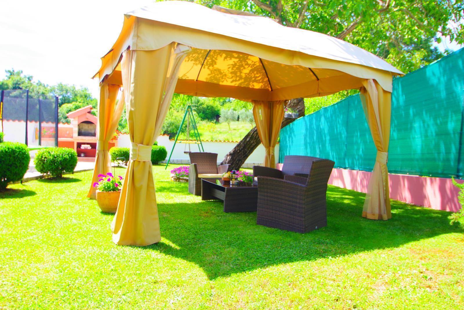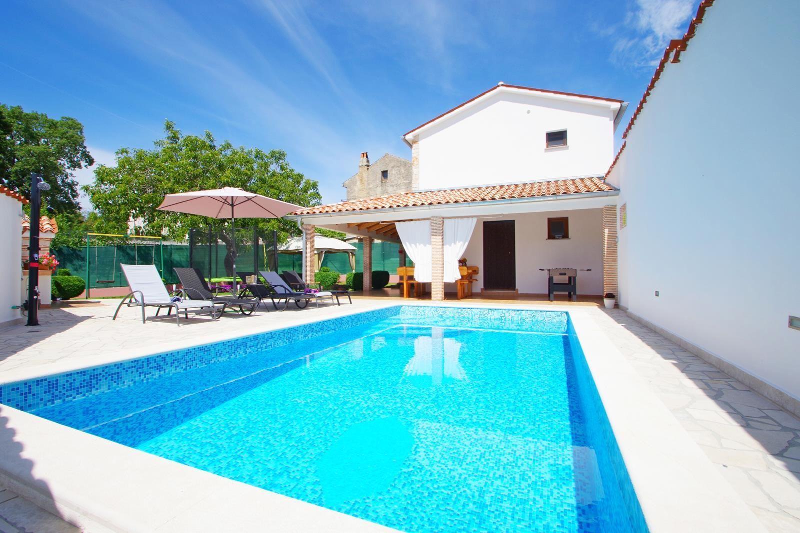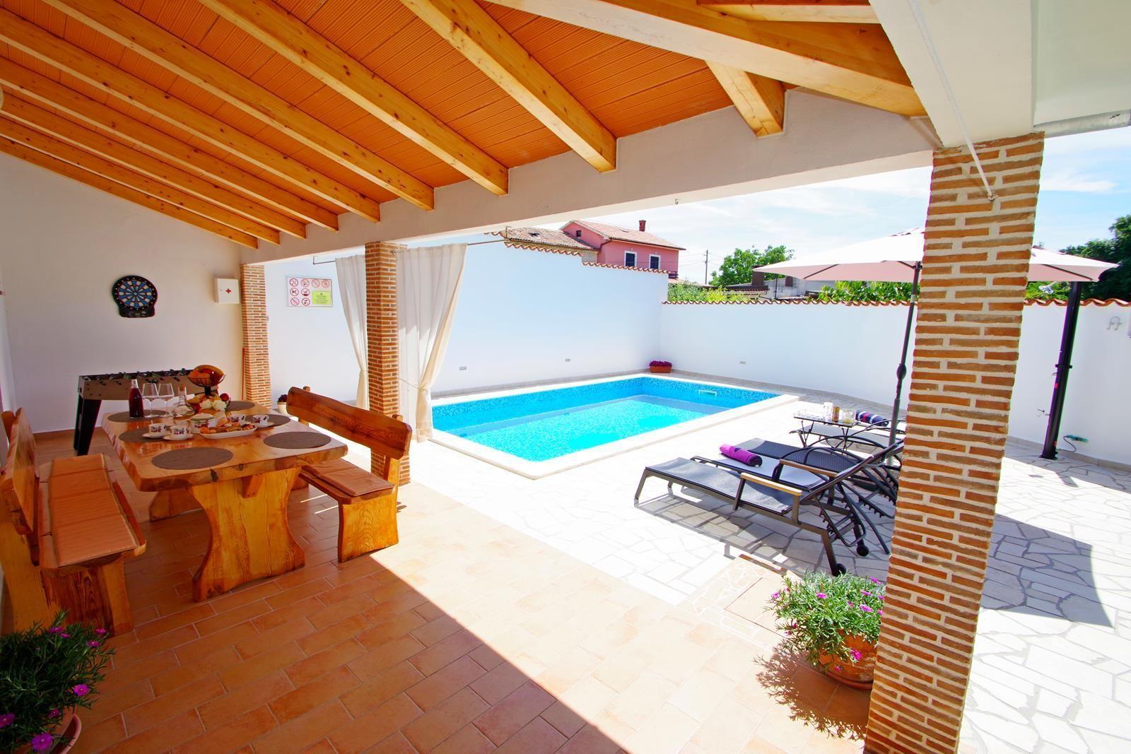 Swimming pool size is 25 m2 and 1,35 m depth, surrounded with 8 sun beds, outside shower, sun umbrella, BBQ.