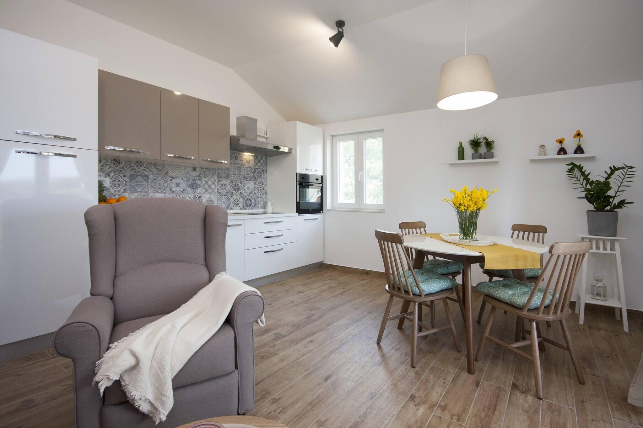 This modern and cozy 48-square-metre apartment in Šibenik-Brodarica is the perfect retreat for families or couples, accommodating up to 3 guests. The apartment includes a comfortable queen-size bed and a convenient sofa bed for additional guests. Guests can enjoy beautiful sea views from the balcony, which is equipped with outdoor furniture and a BBQ area, ideal for alfresco dining. The shared swimming pool, measuring 3.5x6 meters, provides a refreshing space for relaxation. Additional amenities include air conditioning, WiFi, and a flat-screen satellite TV. The apartment is located on a fenced plot, ensuring privacy and a peaceful atmosphere. Pets are not allowed, and smoking is only permitted outside. Situated just 850 meters from both sandy and rocky beaches, the apartment offers easy access to the pristine Adriatic coastline. Guests can explore local attractions, including the historic Šibenik Old Town, located 9 km away. Nearby, you'll find a supermarket within 1 km and the local Konoba Dalmare restaurant offering delicious Croatian cuisine. For outdoor enthusiasts, two bicycles are available for use, and the property is conveniently located for day trips to the surrounding areas. Split Airport is about 55 km away, providing convenient travel options. The apartment features a fully equipped American-style kitchen, complete with induction cooking, a dishwasher, oven, coffee machine, and all necessary kitchenware for preparing meals. The living space also includes a dining area and essential amenities such as a first aid kit and cleaning products.