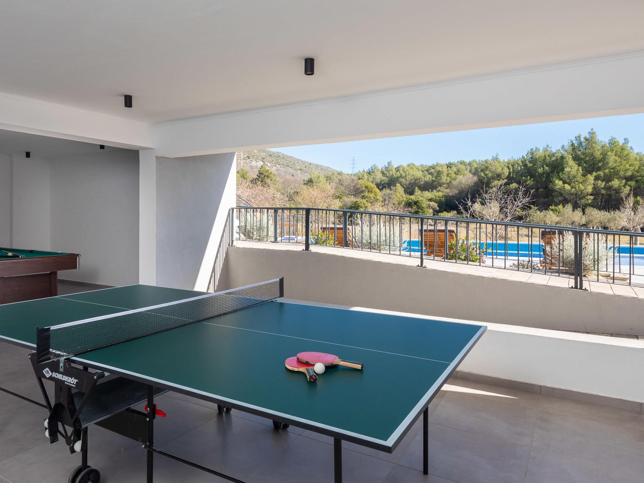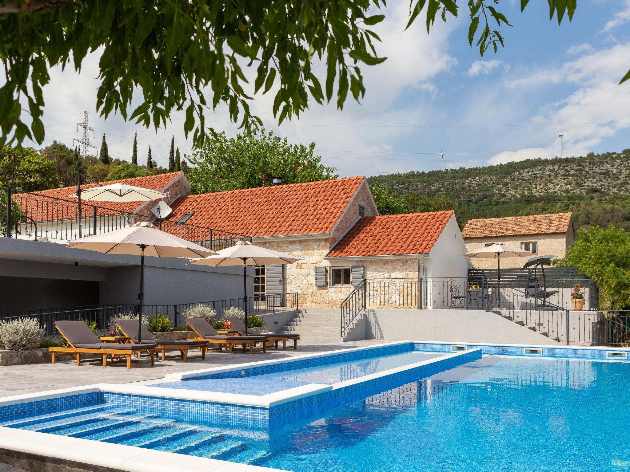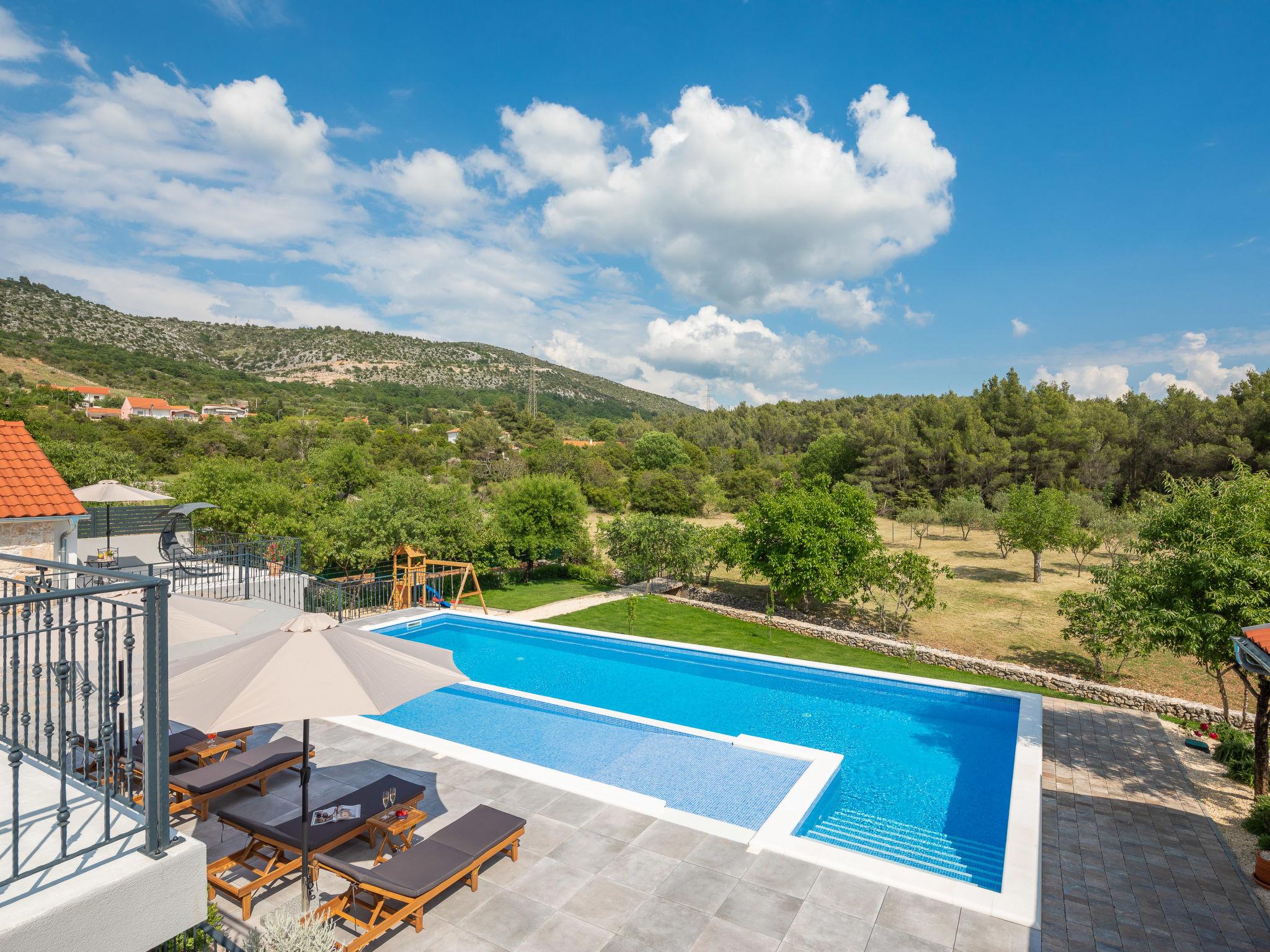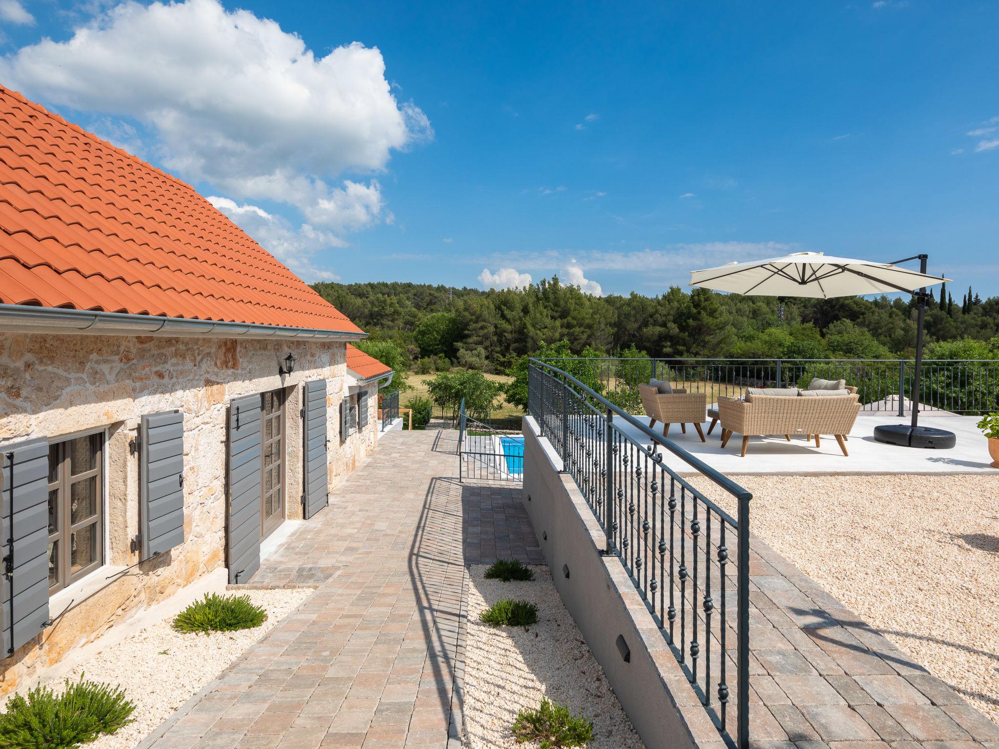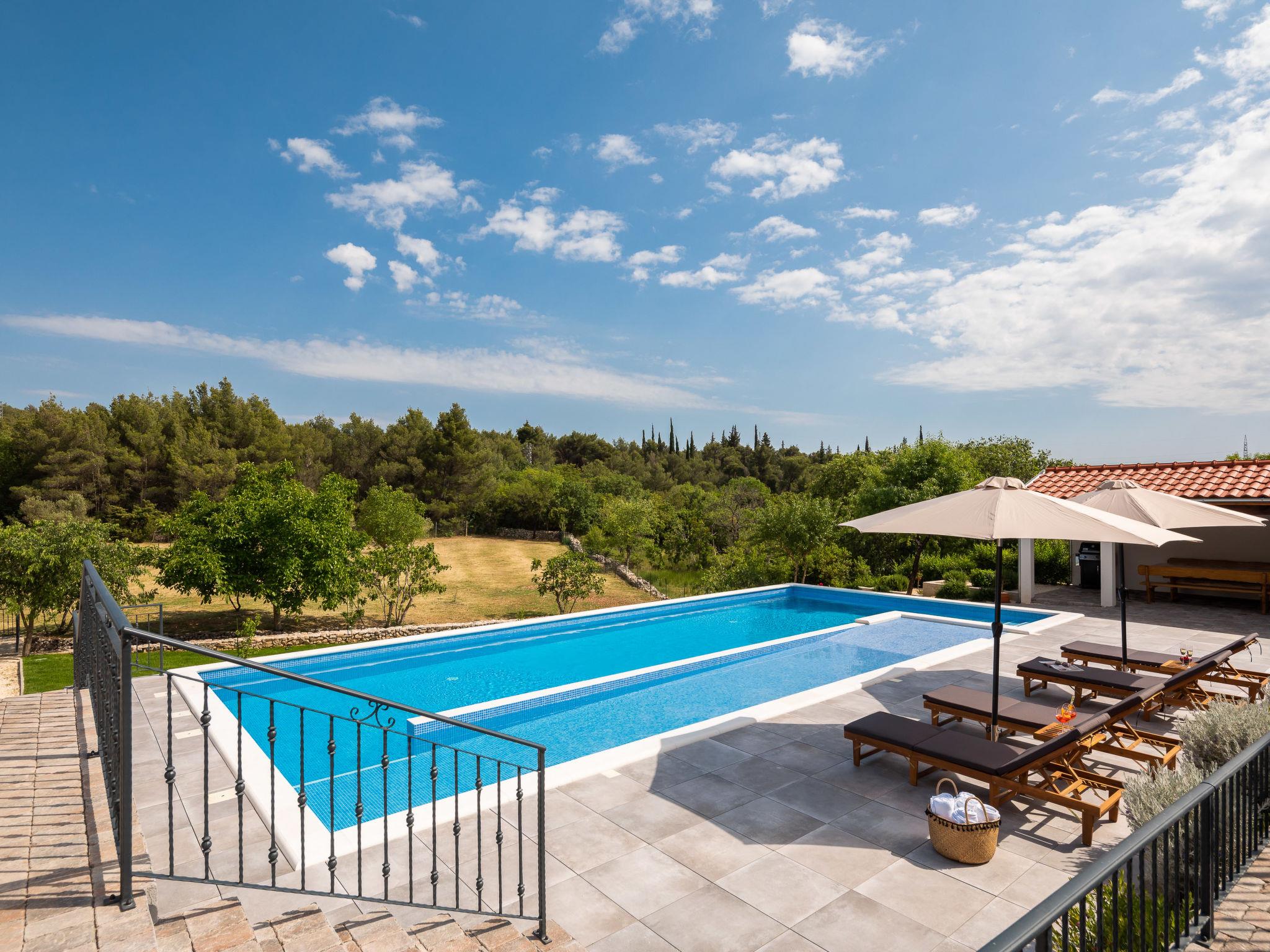 Dubrava: Single-family house "Villa di Pietra", 2 storeys. 8 km from the centre of Šibenik, in a quiet, sunny position, 8 km from the sea, in the countryside. Private: property 3'800 m2, lawn and trees, swimming pool angular, heated (86 m2, depth 150 cm, seasonal availability: 01.Apr. - 01.Nov.) with internal staircase. Outdoor shower, table tennis, terrace (20 m2), garden furniture, barbecue, children's playground (slide, swing), pool maintenance by the owner/gardener. In the house: internet access, billiard table, washing machine, tumble dryer. Parking (for 3 cars) at the house on the premises. Shop 2 km, restaurant 8 km, bus stop 300 m, pebble beach 10 km. Nearby attractions: NP Krka 12 km. Please note: airfield 45 km from the property. It is necessary to announce 7 days in advance if the pool heating is required. Swimming pool with handicap access.