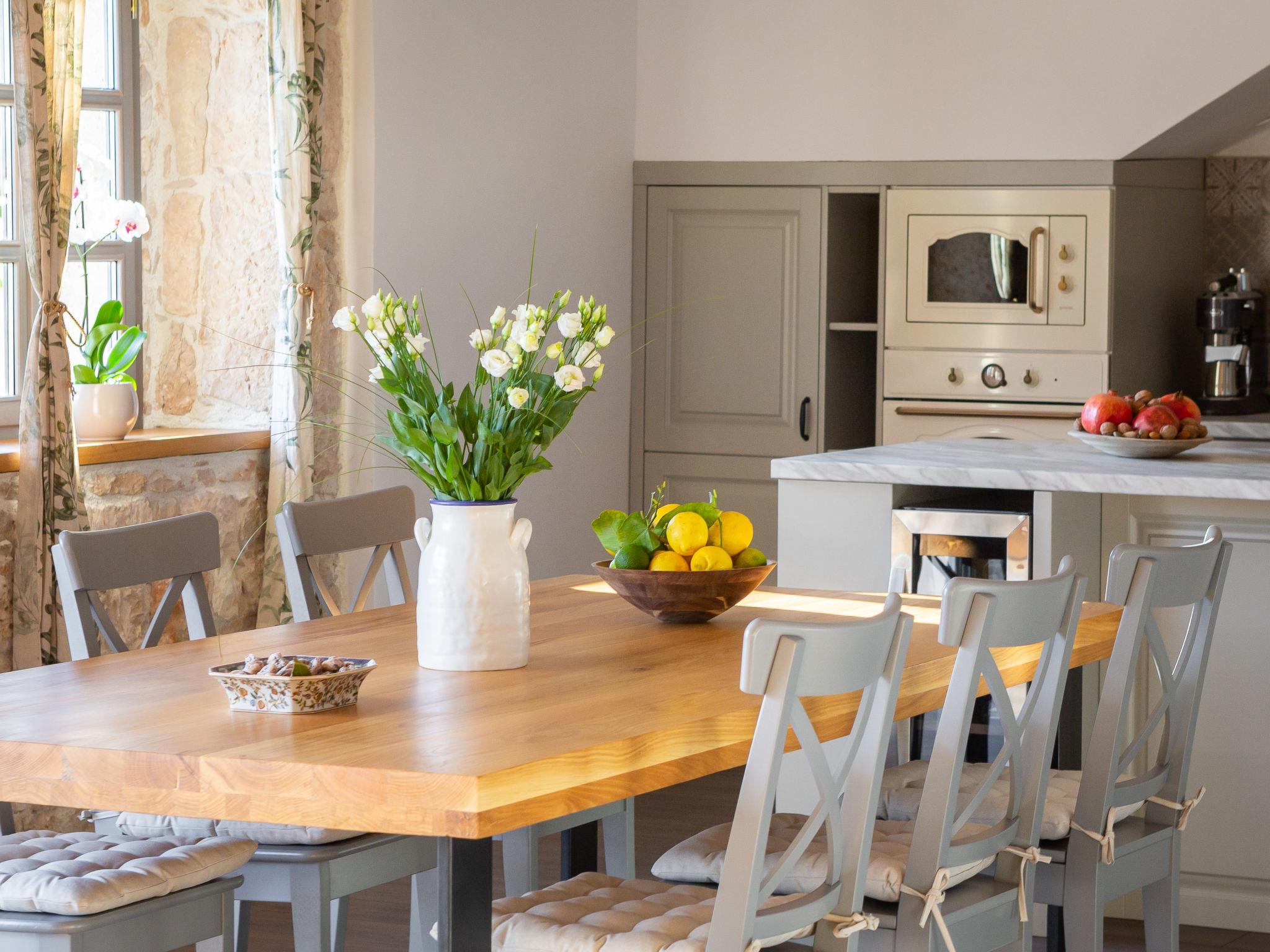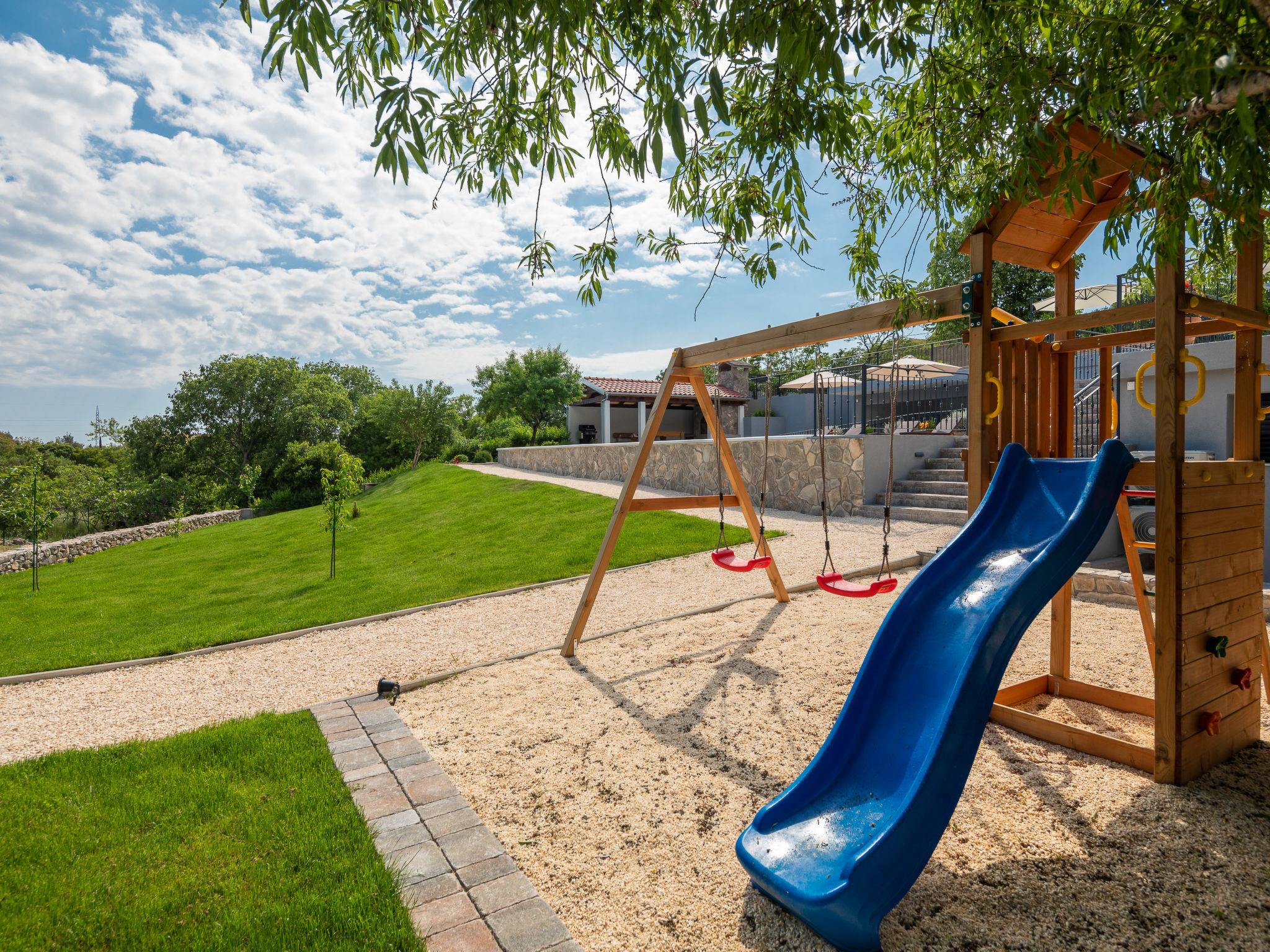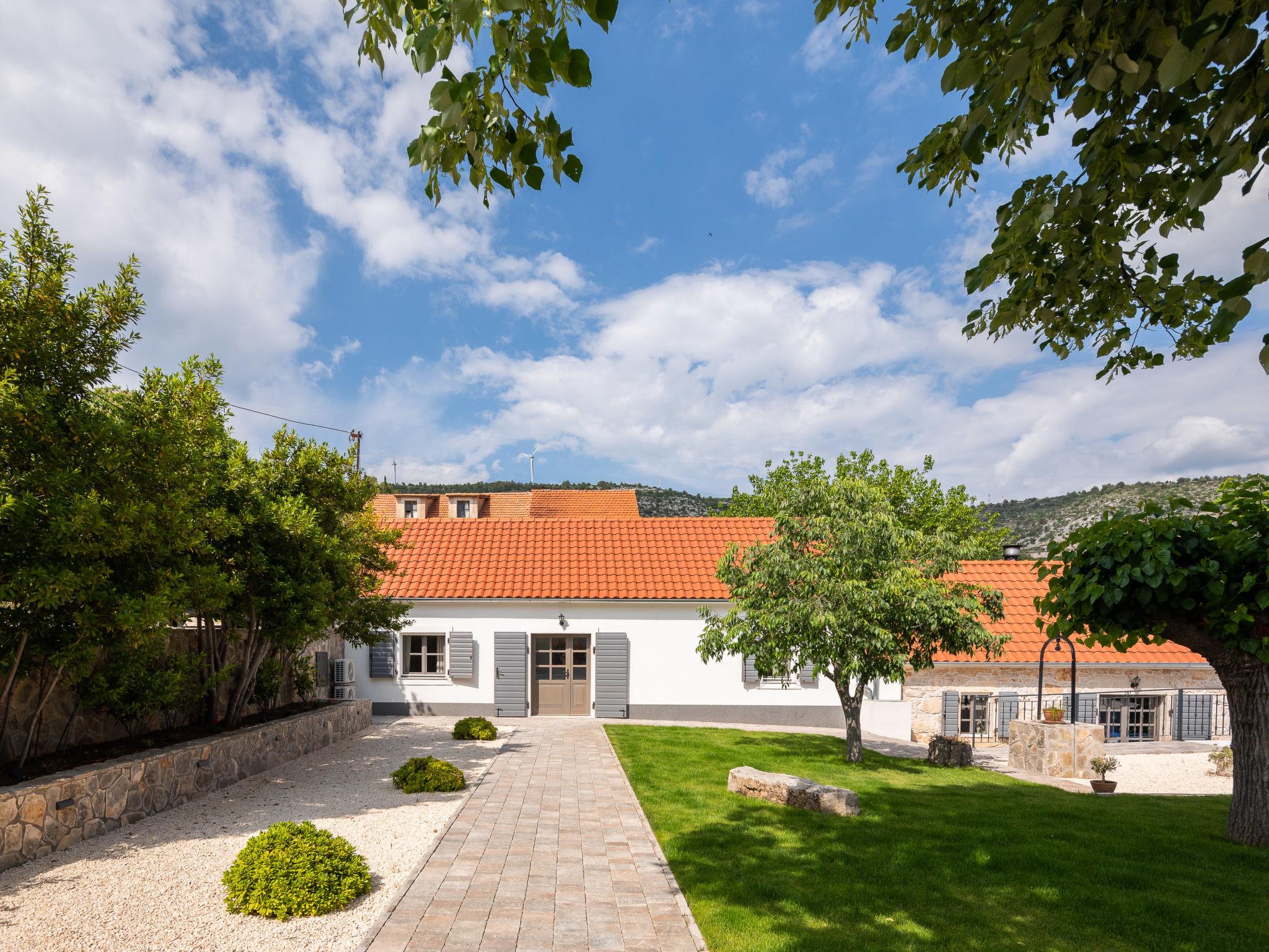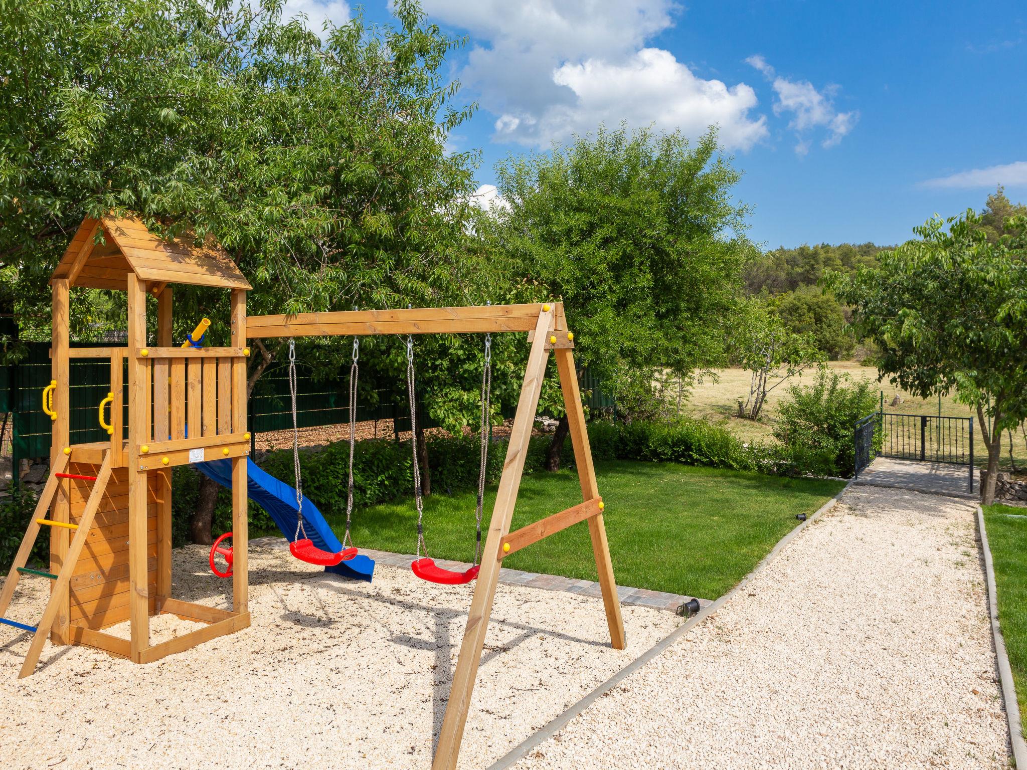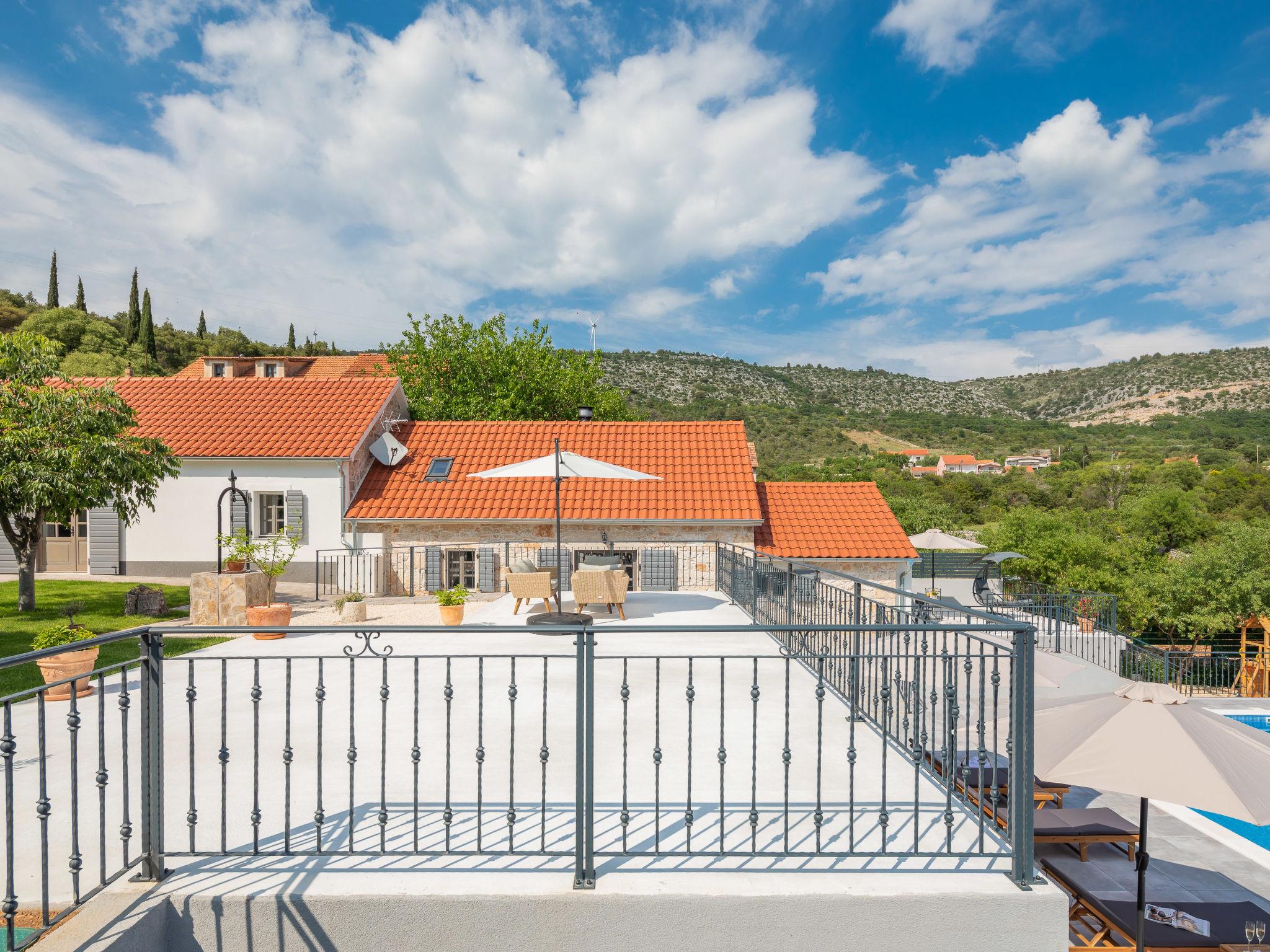 Dubrava: Single-family house "Villa di Pietra", 2 storeys. 8 km from the centre of Šibenik, in a quiet, sunny position, 8 km from the sea, in the countryside. Private: property 3'800 m2, lawn and trees, swimming pool angular, heated (86 m2, depth 150 cm, seasonal availability: 01.Apr. - 01.Nov.) with internal staircase. Outdoor shower, table tennis, terrace (20 m2), garden furniture, barbecue, children's playground (slide, swing), pool maintenance by the owner/gardener. In the house: internet access, billiard table, washing machine, tumble dryer. Parking (for 3 cars) at the house on the premises. Shop 2 km, restaurant 8 km, bus stop 300 m, pebble beach 10 km. Nearby attractions: NP Krka 12 km. Please note: airfield 45 km from the property. It is necessary to announce 7 days in advance if the pool heating is required. Swimming pool with handicap access.