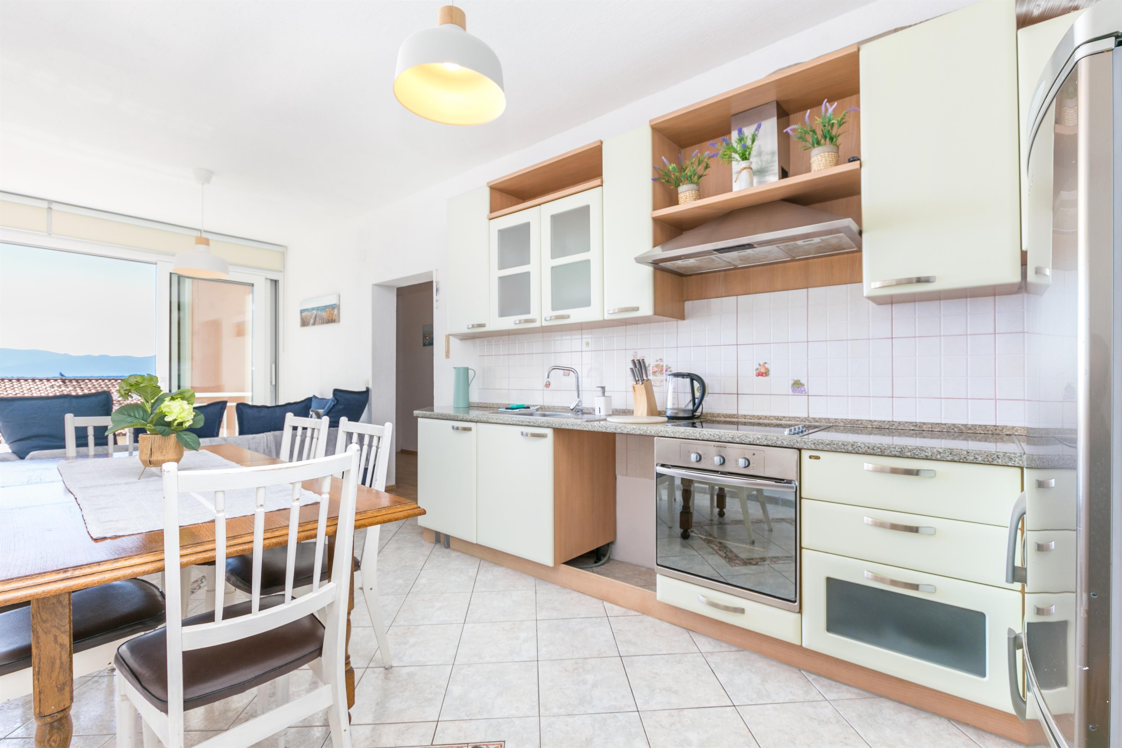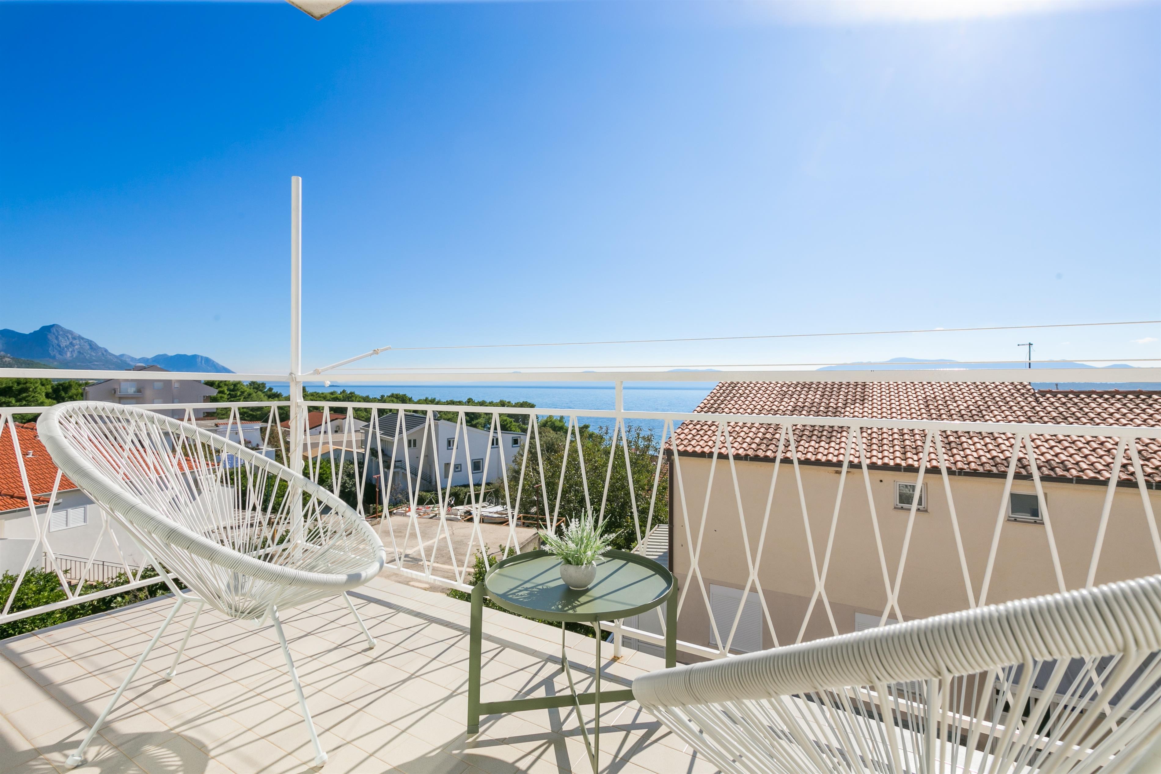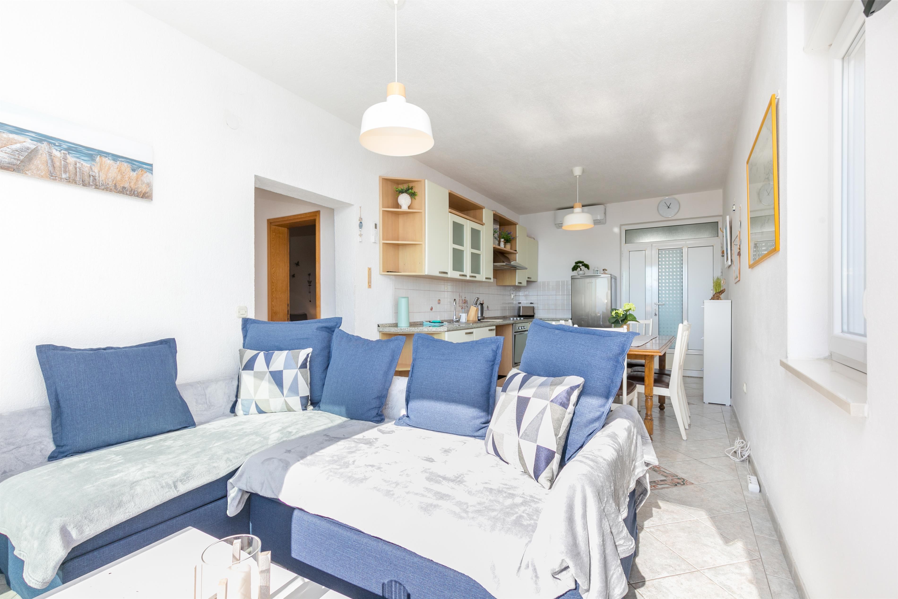 Apartment can accommodate 8 guests. Beds are situated in 2 sleeping rooms, but also in the living room, within 55m2. Guests can use a private balcony to enjoy the warm summer evenings. The apartment offers the sea view. Food can be prepared using barbecue which is shared with other guests too.
