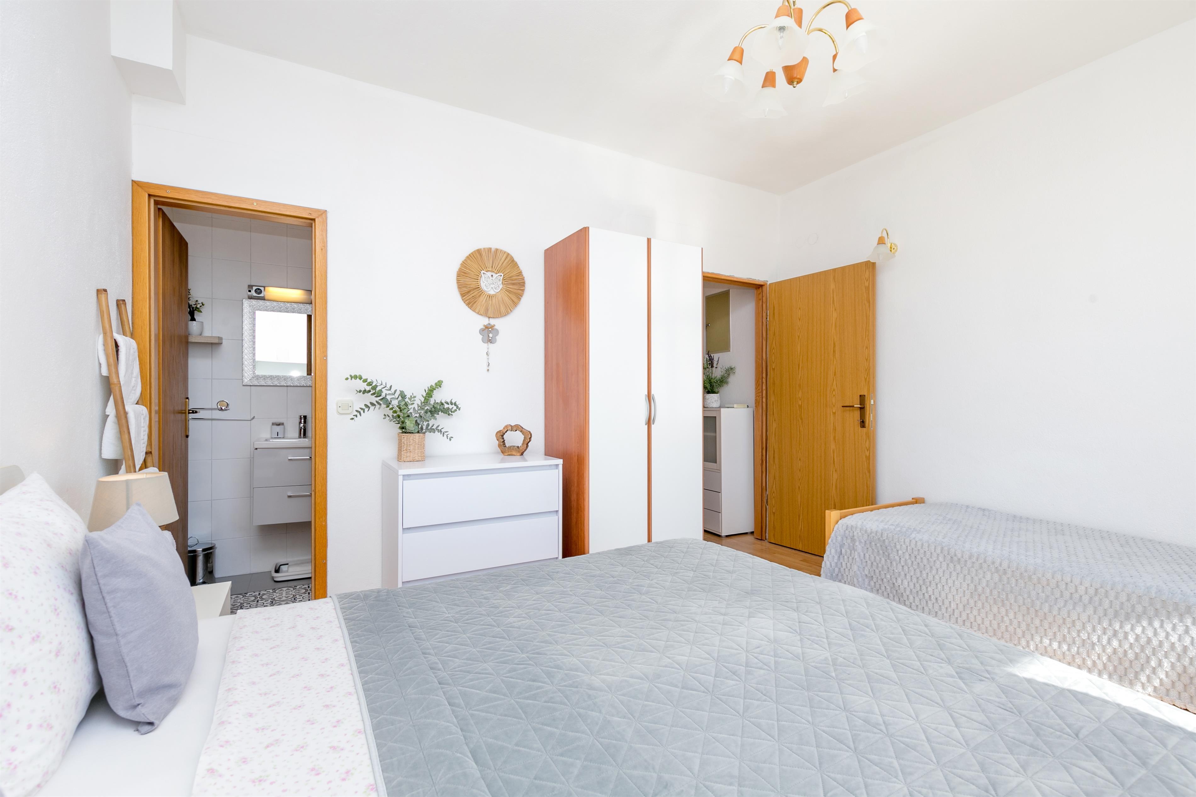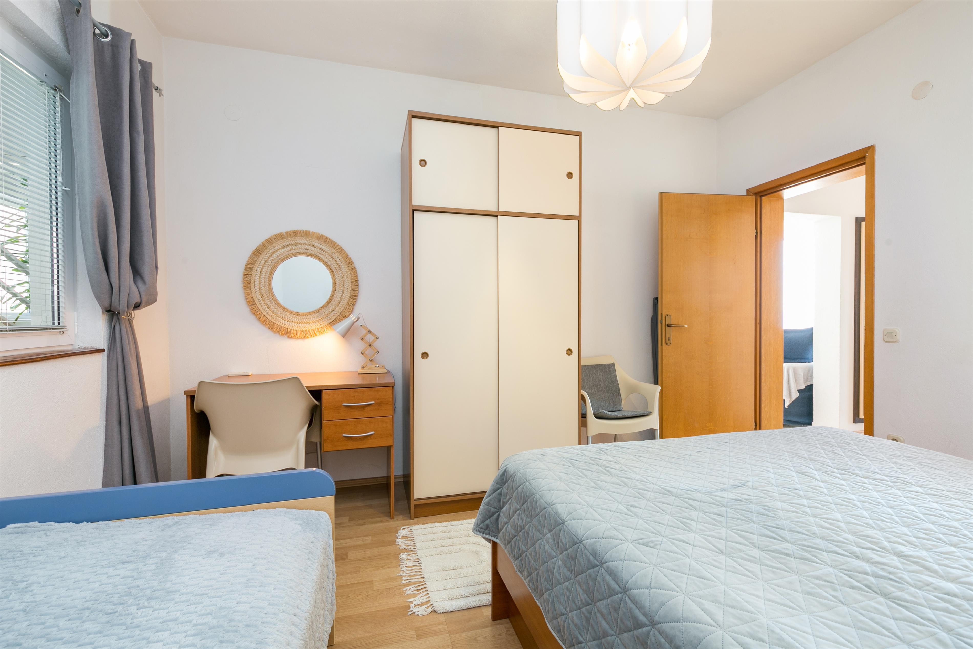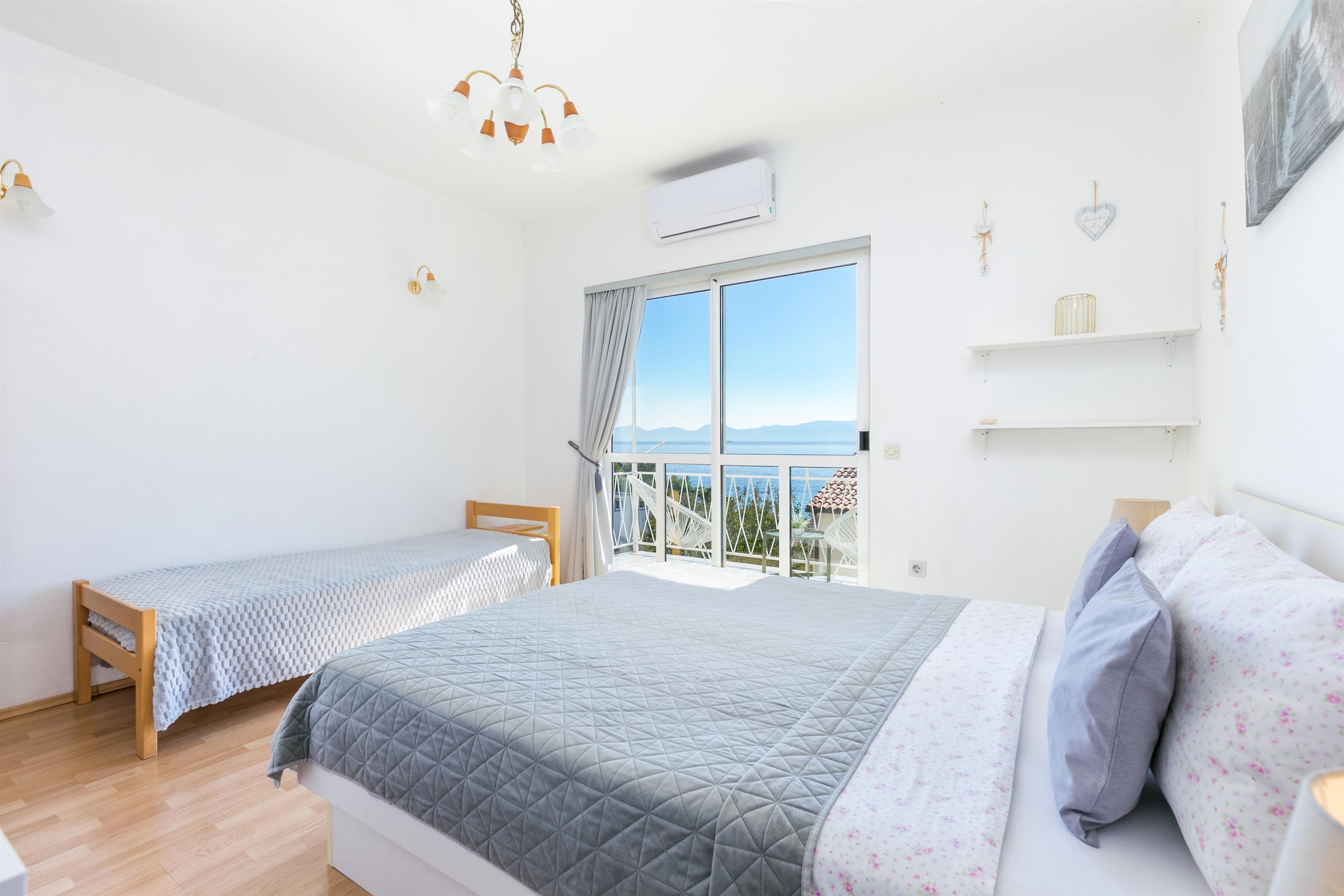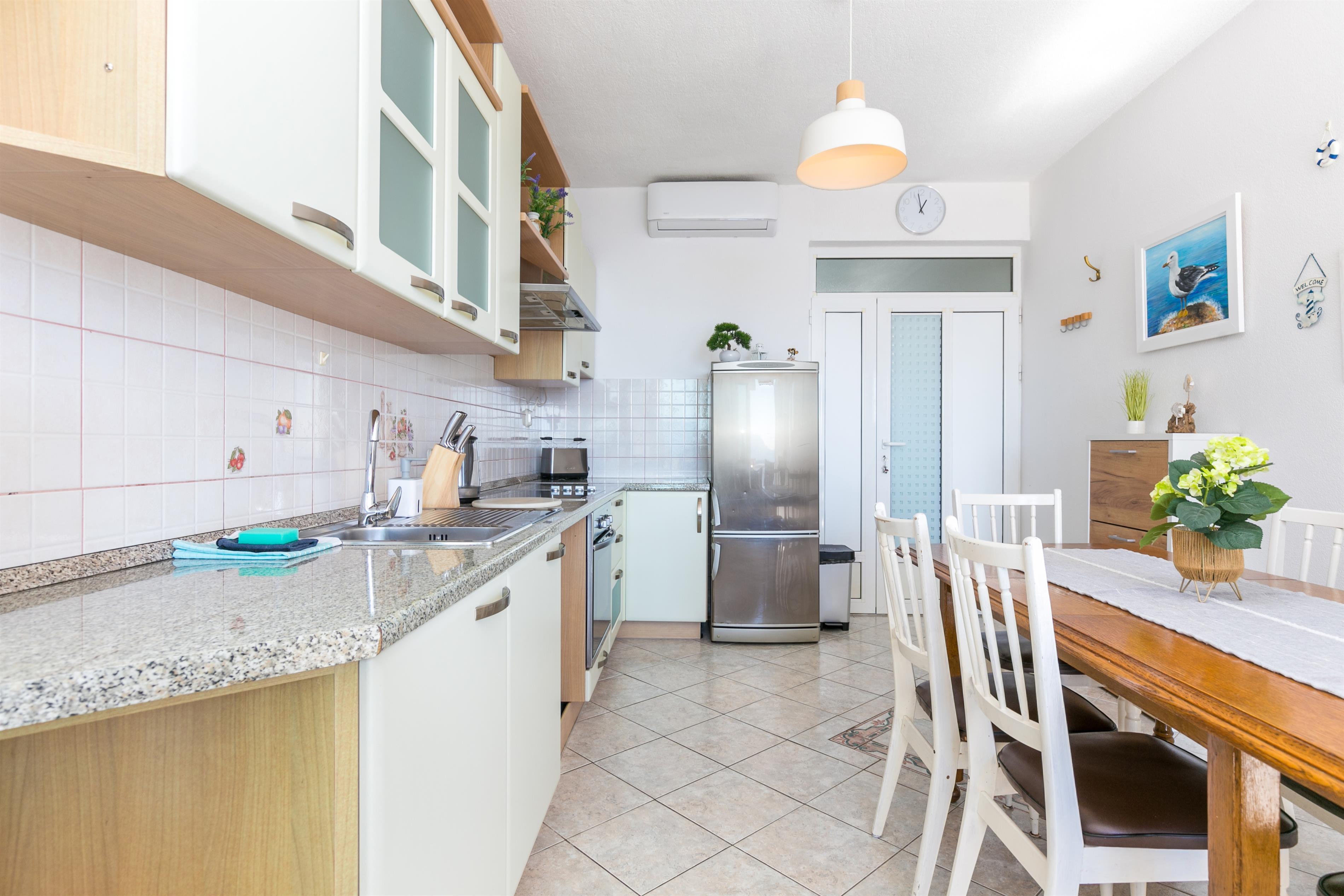 Apartment can accommodate 8 guests. Beds are situated in 2 sleeping rooms, but also in the living room, within 55m2. Guests can use a private balcony to enjoy the warm summer evenings. The apartment offers the sea view. Food can be prepared using barbecue which is shared with other guests too.