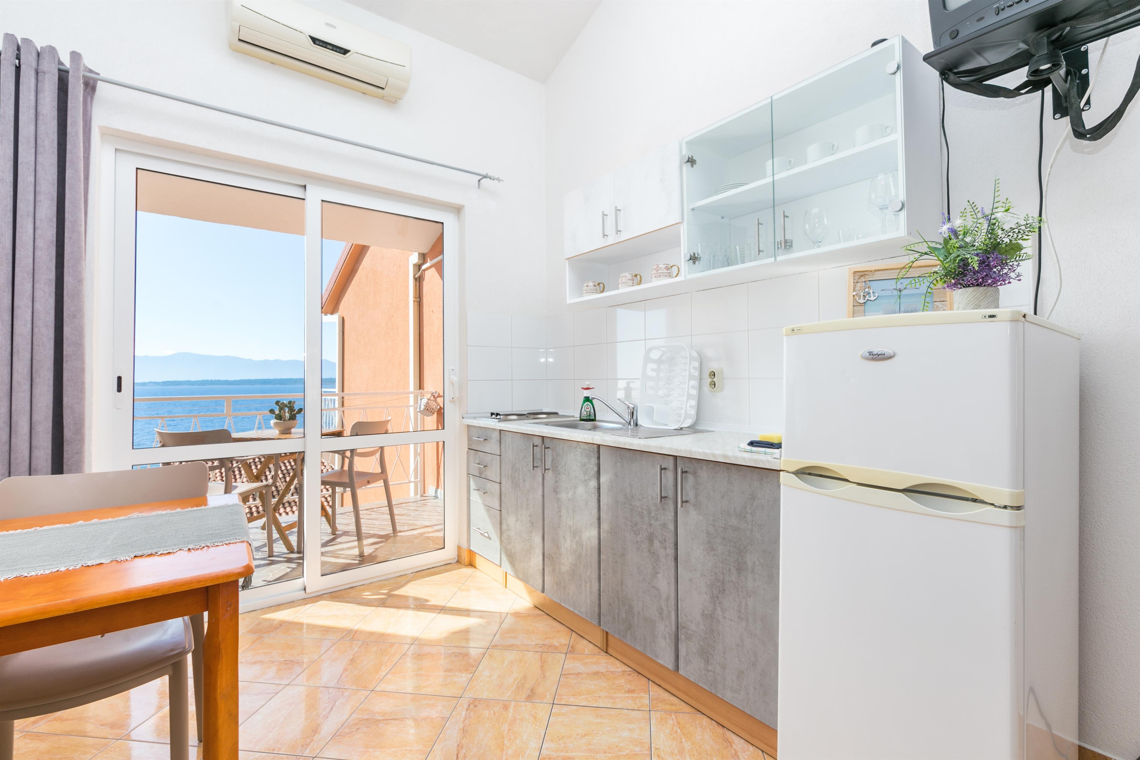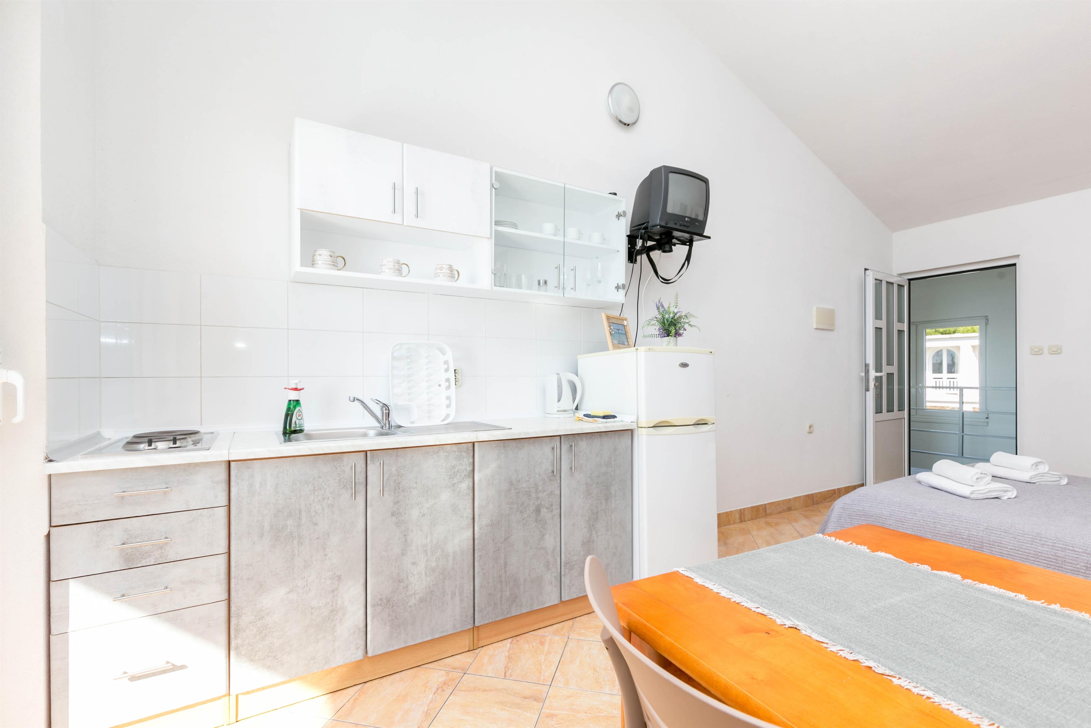 Studio flat can accommodate 3 guests. Beds are situated in 1 sleeping rooms, but also in the dining room, within 20m2. Guests can use a private balcony to enjoy the warm summer evenings. The studio offers the sea view. Food can be prepared using barbecue which is shared with other guests too.