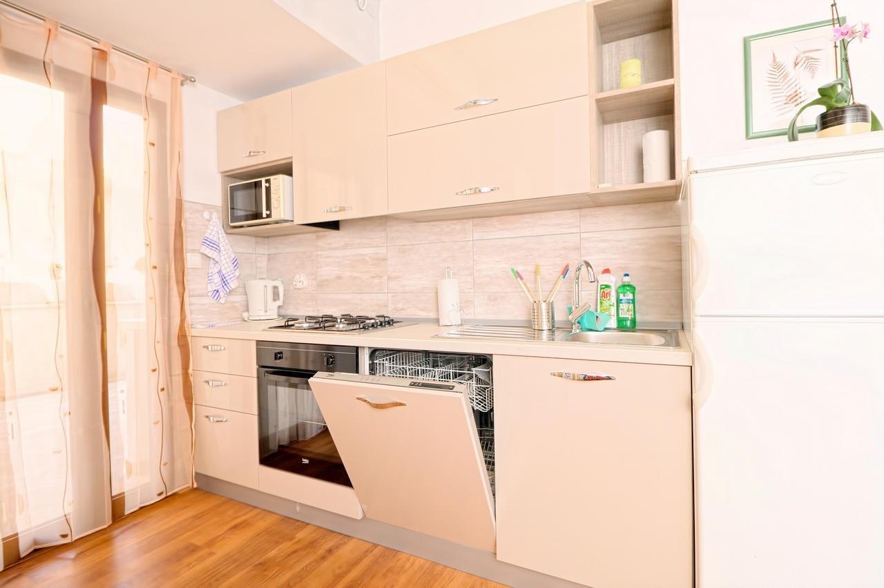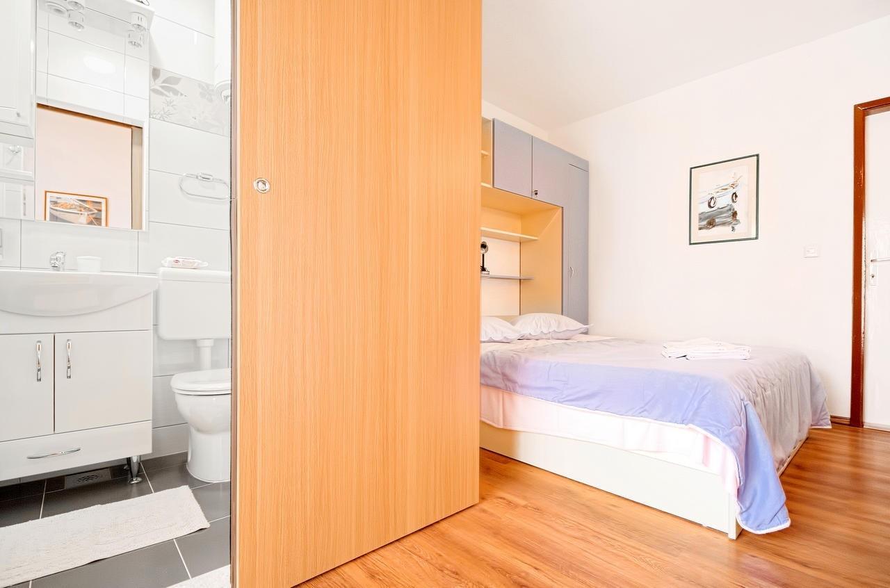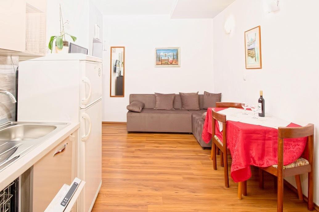 Apartment can accommodate 7 guests. Beds are situated in 2 sleeping rooms, but also in the living room, within 55m2. Guests can use a private terrace to enjoy the warm summer evenings. The apartment offers the sea view. Food can be prepared using barbecue which is shared with other guests too.