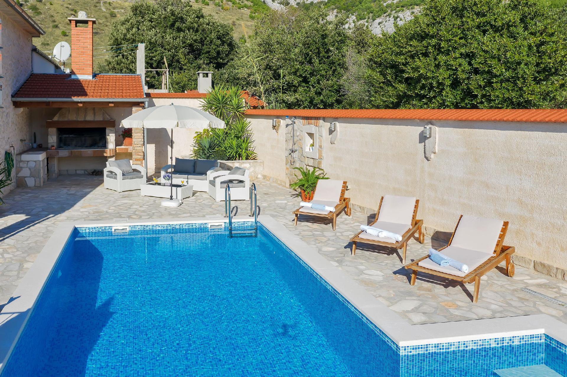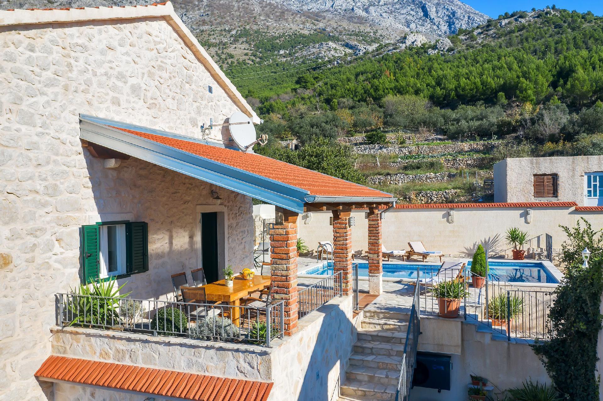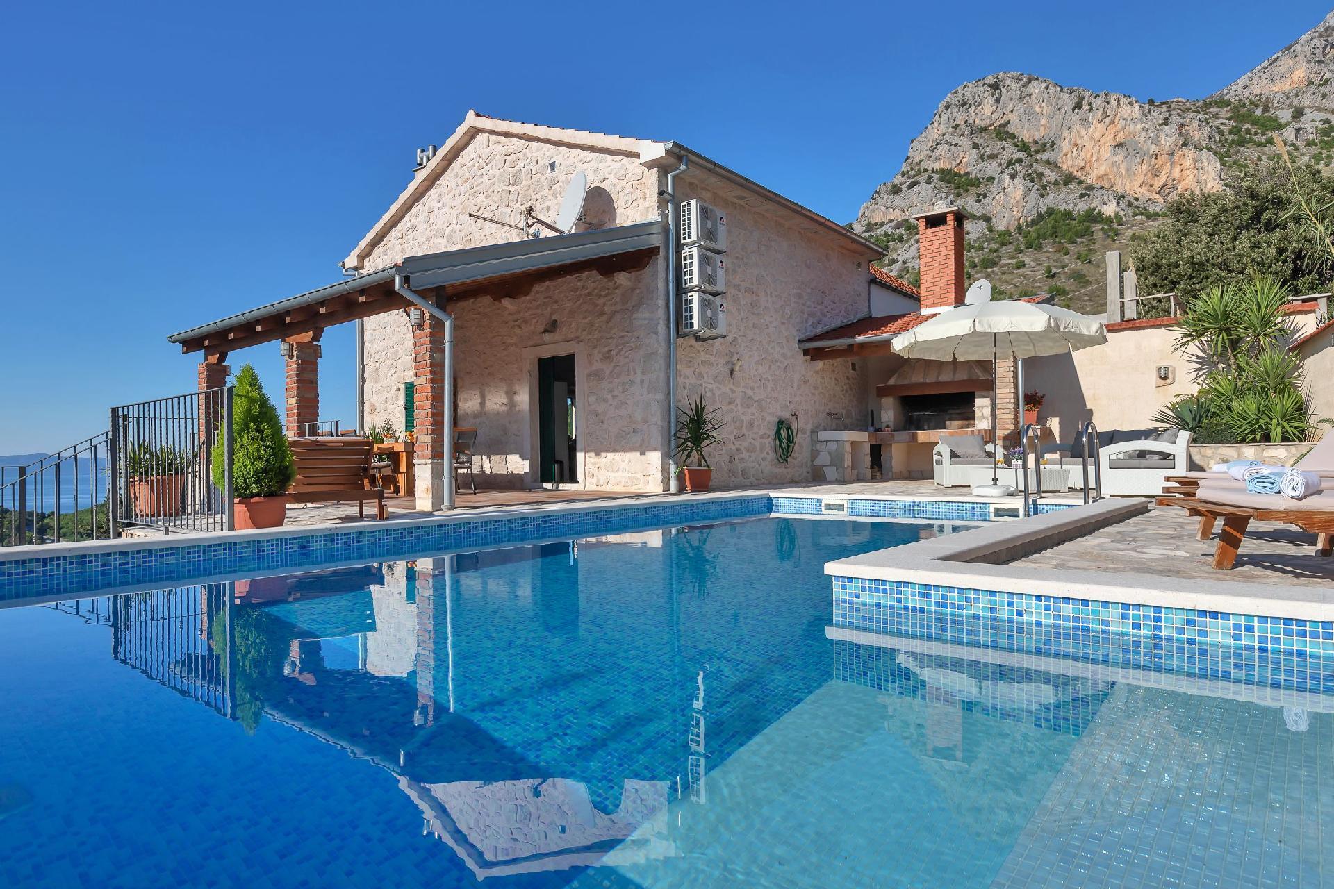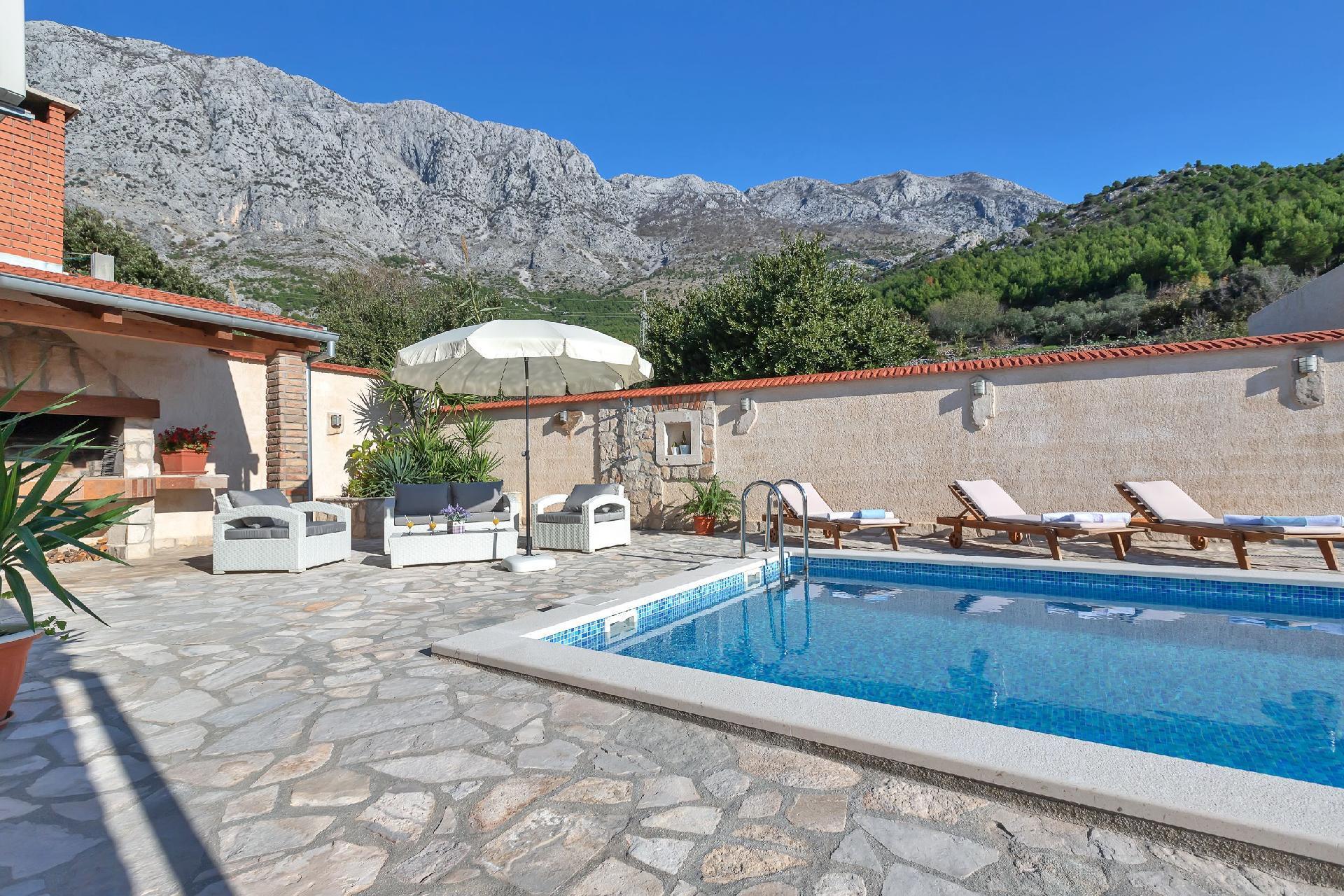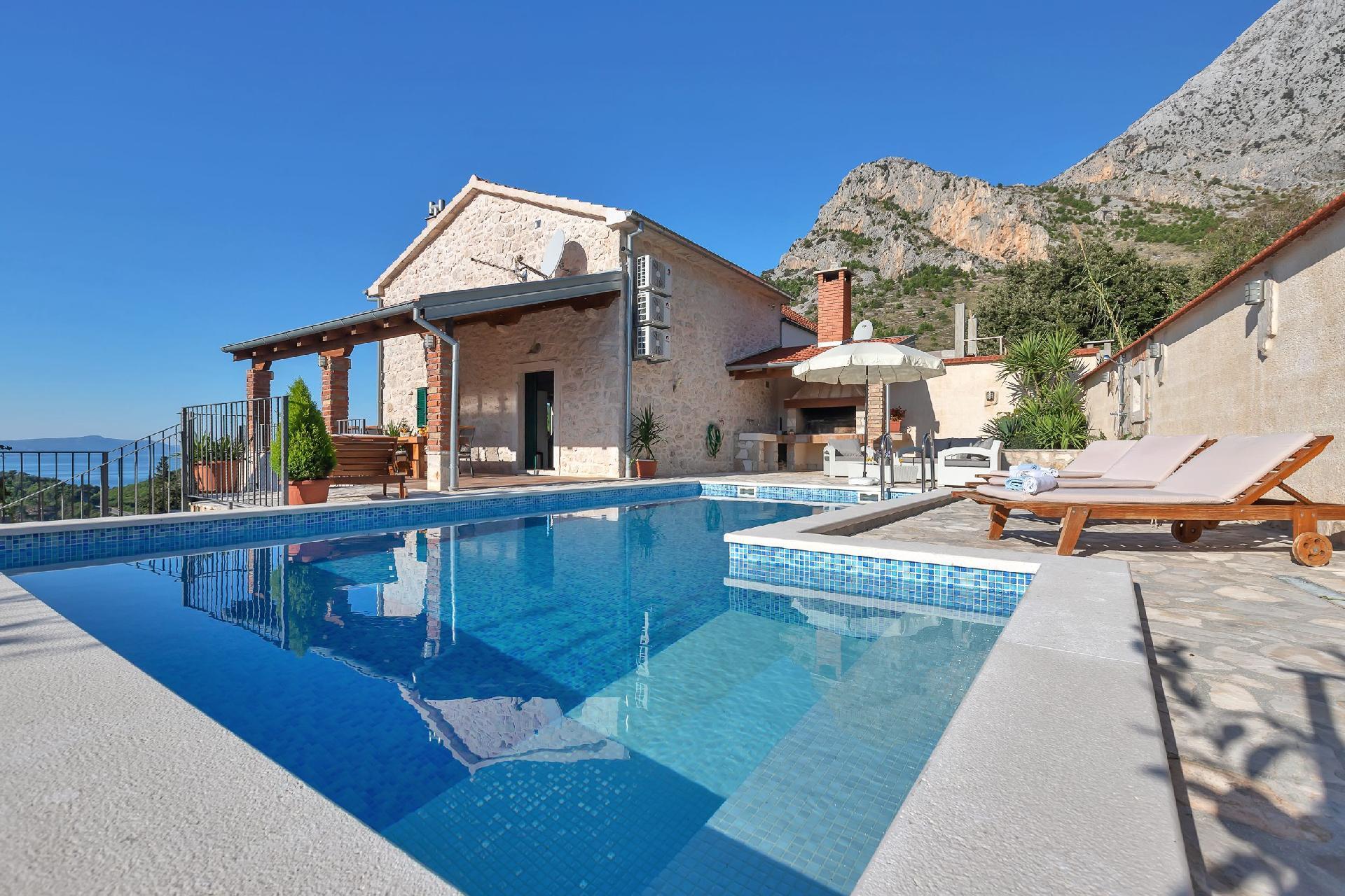 Holiday house Mya with heated pool is located 20 km south of the town of Makarska, 1.0 km from the sea and the beach. The completely renovated stone house has three bedrooms with double bed, three bathrooms with shower.