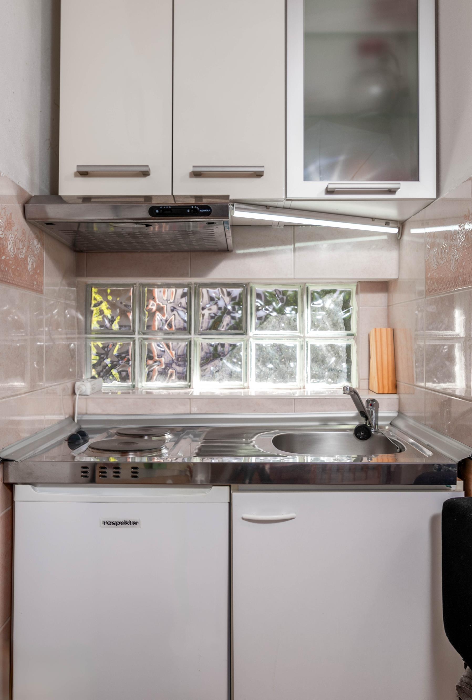Kitchen (2 m2): Kitchenette: Refrigerator, Sink, Additional equipment: Stove, On request: Microwave oven, Water kettle, Coffee machine, Toaster