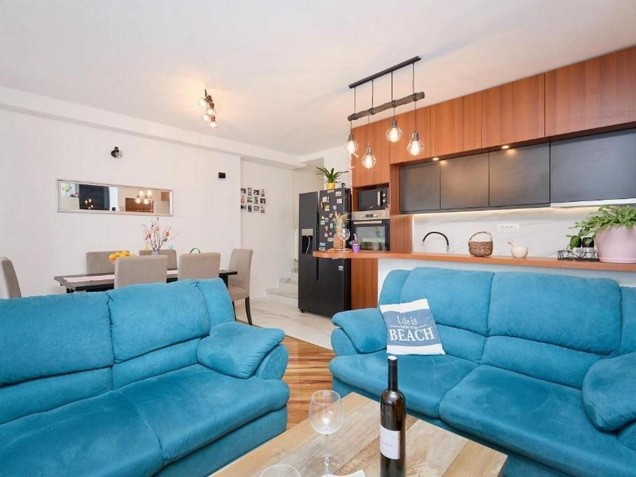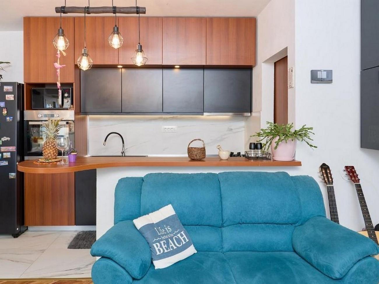 Apartment can accommodate 5 guests. Beds are situated in 2 sleeping rooms, but also in the living room, within 59m2. Guests can use a private terrace to enjoy the warm summer evenings. The apartment offers the sea view. Food can be prepared using barbecue which is shared with other guests too.