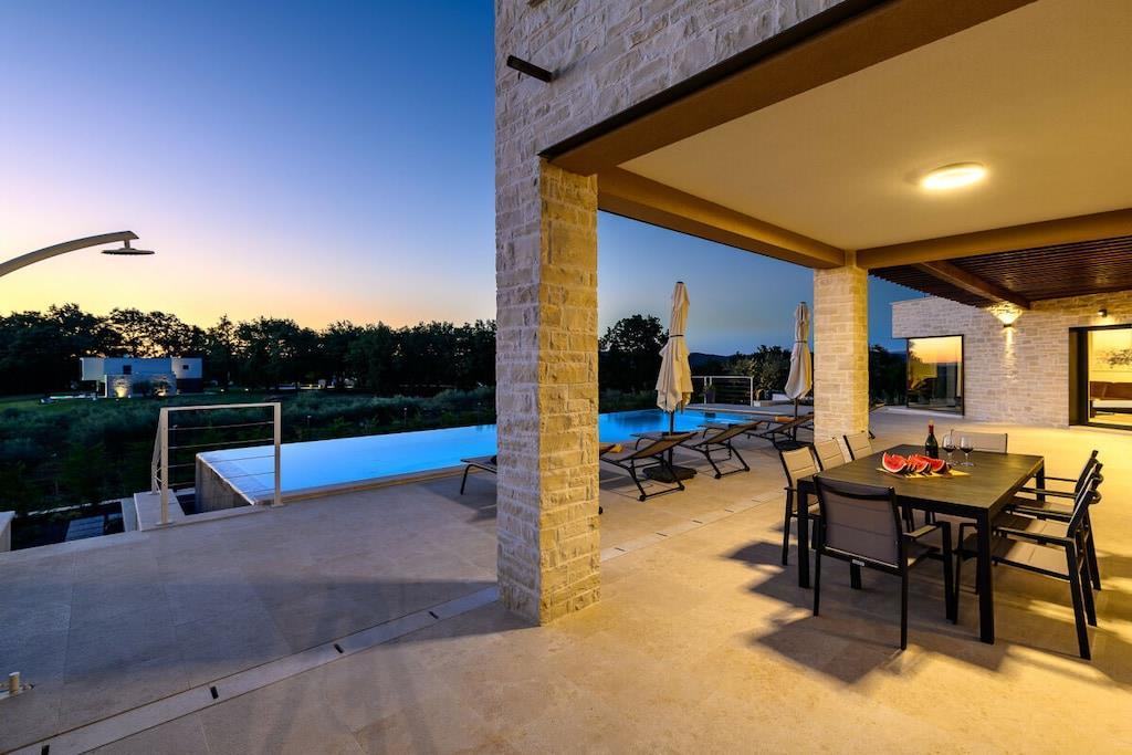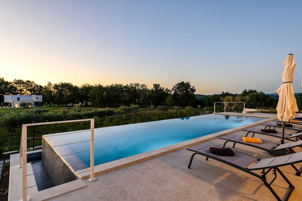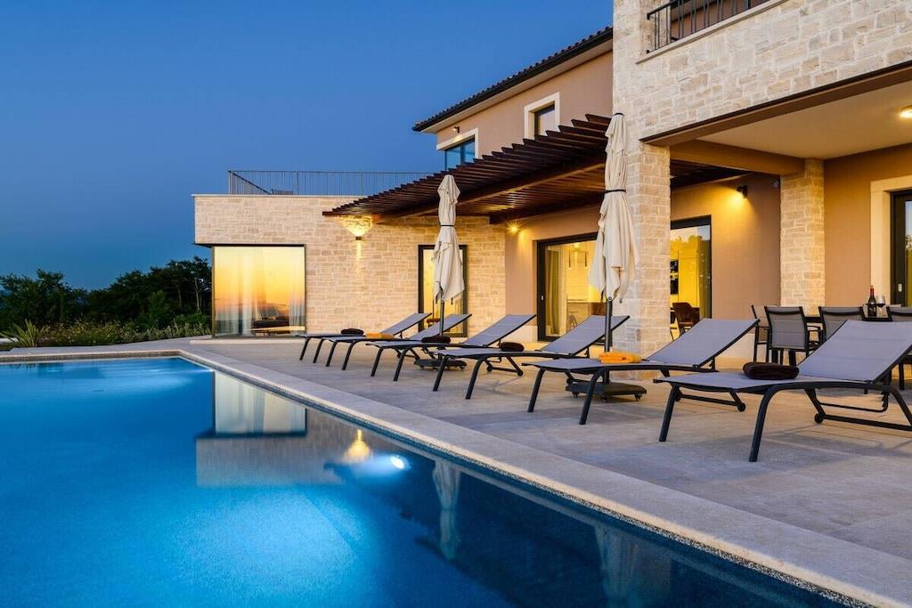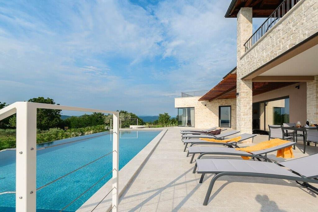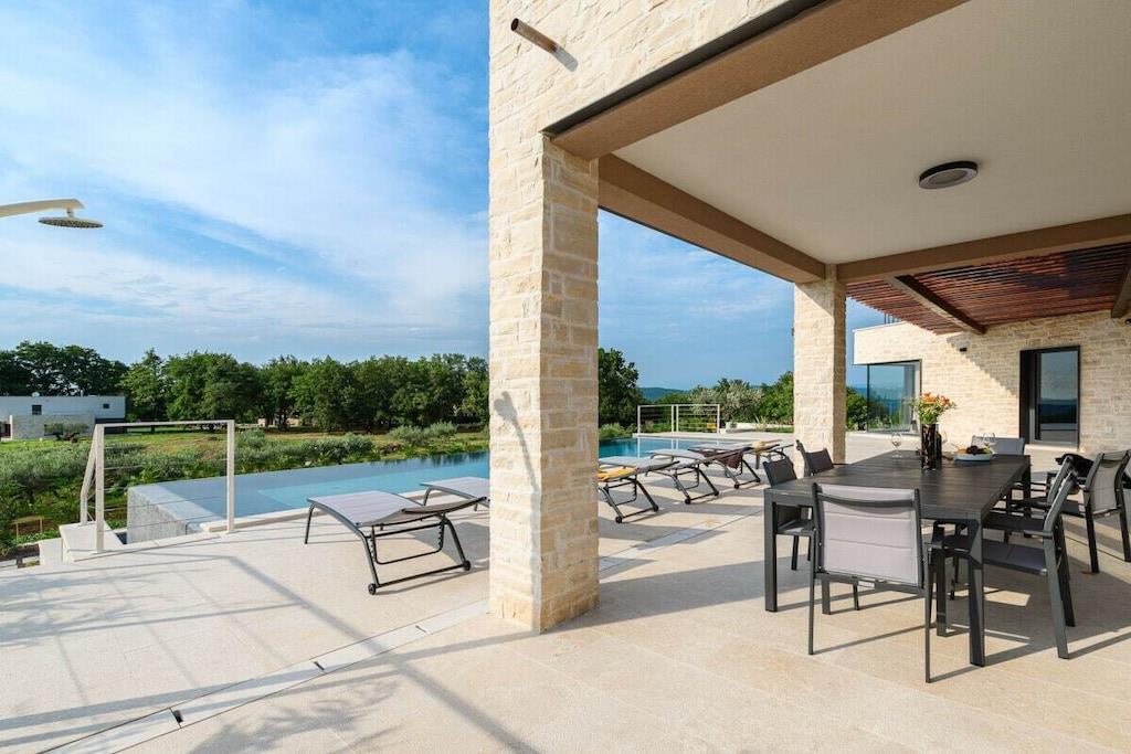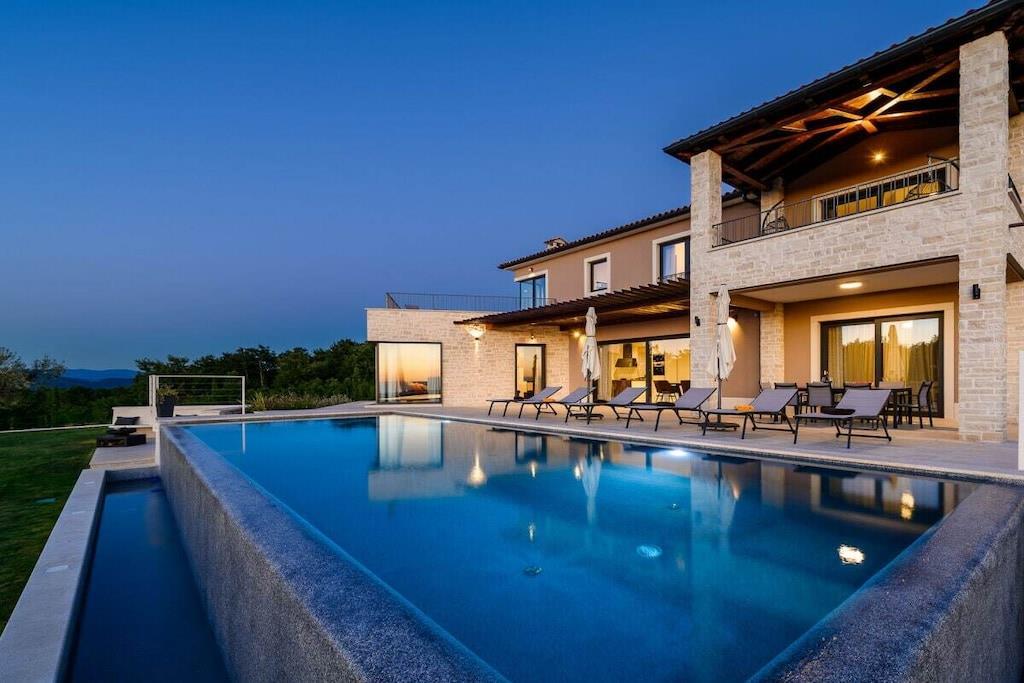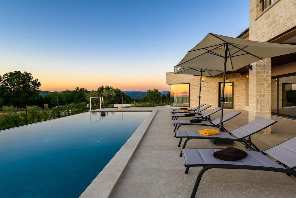 Nestled amidst the greenery of the Vižinada hills, overlooking vineyards and a beautiful sea view, lies the luxurious Villa Faloniga. It takes its name from a nearby natural spring that has provided life since ancient times. This exquisite luxury holiday home near Bajkini features four elegant double bedrooms, each with its own en-suite bathroom, a spacious kitchen, and a dining area. The cozy living room, as well as the entire villa, is inspired by earthy colors and the beauty of nature, creating a uniquely relaxing atmosphere—in connection with nature. The infinity pool, which changes color in combination with the sun, sky, and clouds, adds a charming touch. Come and fall in love with this villa near Bajkini, where you can enjoy the peace and beauty of nature.