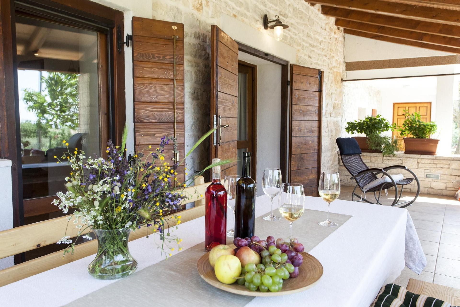 This holiday house, a traditional farmhouse that was renovated in 2014, is not far from the romantic little town of Bale. It is quietly located, just 500 metres from the main road that runs from Bale to Rovinj. It is surrounded by a typical Mediterranean landscape and lots of olive trees, with a view of the sea. It is an ideal place for those seeking peace and quiet, who love nature and being active outdoors. Traditional stone house with roofed terraces, in a quiet location amidst nature near the romantic little town of Bale and the Palud nature reserve