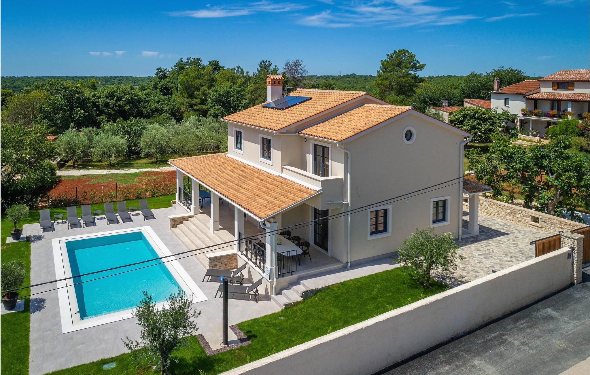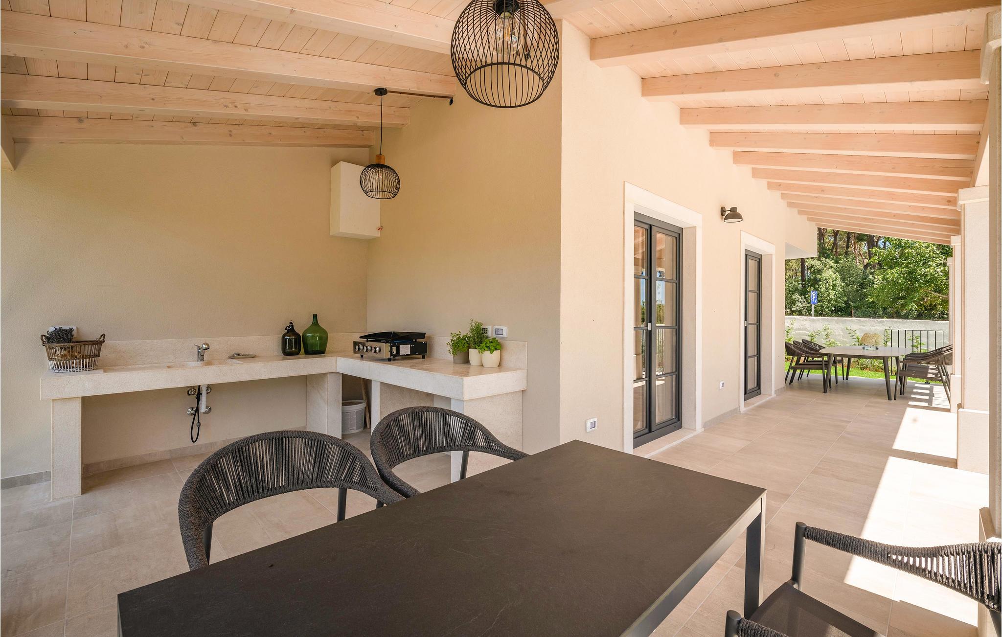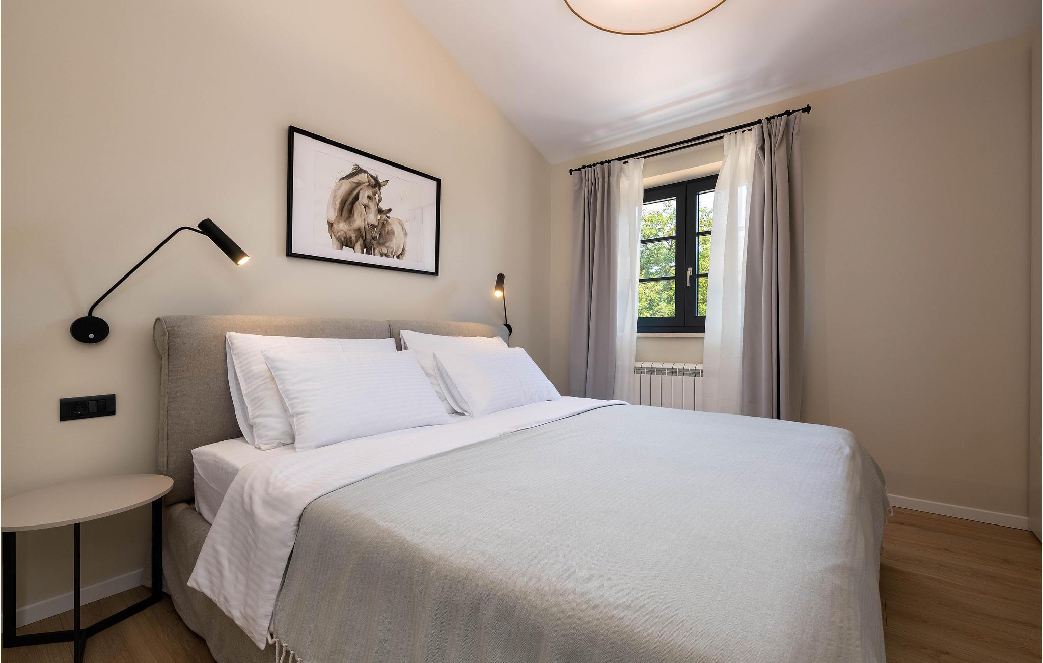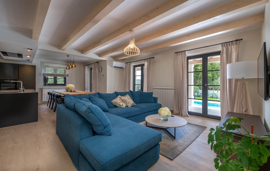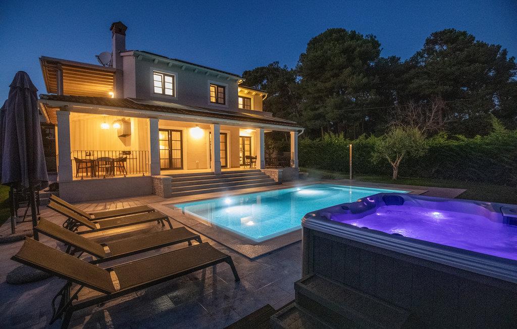 Wenn Sie in einer ruhigen natürlichen Umgebung vollkommen entspannen möchten, ist dieses fantastische Ferienhaus die ideale Wahl für Ihren Urlaub. Es befindet sich in Manjadvorci, einem kleinen Ort auf halbem Weg zwischen den Städten Labin und Pula. Die Innenräume sind mit Qualität und Stil eingerichtet und vollständig an die heutigen Standards angepasst. Der umzäunte Garten wird von einer großen überdachten Terrasse und einem Pool mit Hydromassagedüsen dominiert. Neben dem eingezäunten Grundstück gibt es ein zusätzliches Grundstück mit vielen Einrichtungen zur Unterhaltung der Kleinsten. Die Eigentümer besitzen auch die Barba Tone Ranch, die sich in der Nähe des Hauses befindet und auf der Sie das Reiten lernen können. Für erfahrene Reiter empfehlen wir, die Umgebung bei organisierten Ausflügen mit Pferden oder Quad-Fahrzeugen zu erkunden. Es gibt auch einen kleinen Zoo auf der Ranch, in dem Ihre Kinder gerne Zeit mit Haustieren verbringen. Besuchen Sie den Adrenalinpark Glavani, die Höhle Feštinsko kraljevstvo, Uvala Blaz und Krnicki Porat und entdecken Sie das traditionelle gastronomische Angebot dieser Gegend. Besuchen Sie unbedingt die Touristenzentren von Rovinj, Porec, Rabac, aber auch das antike Pula, das für sein reiches kulturelles Erbe bekannt ist.