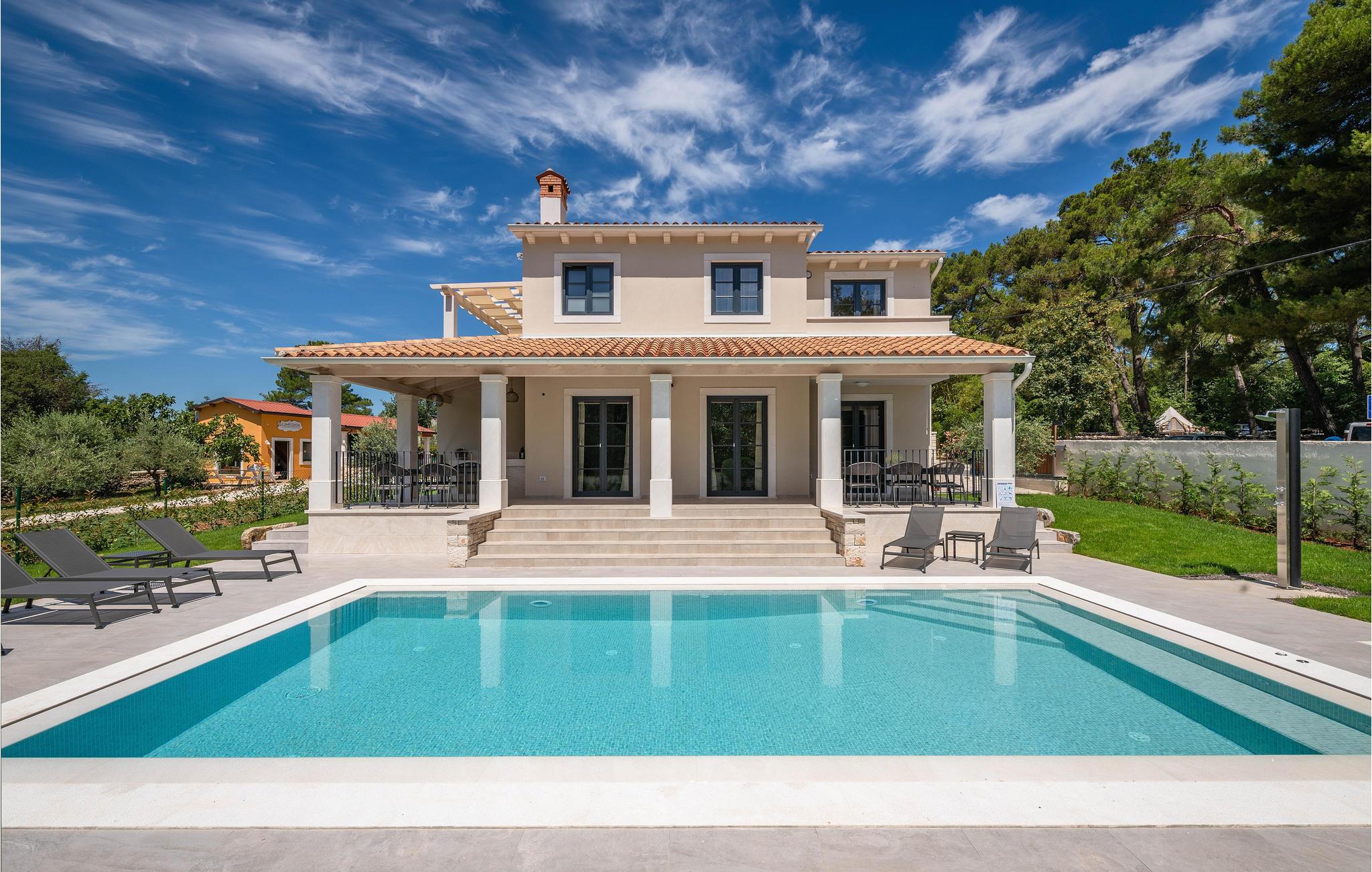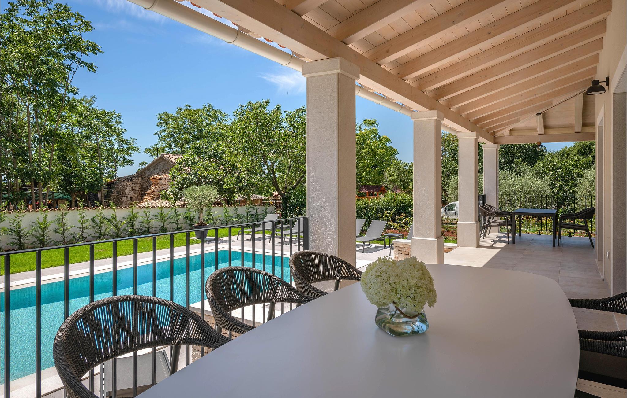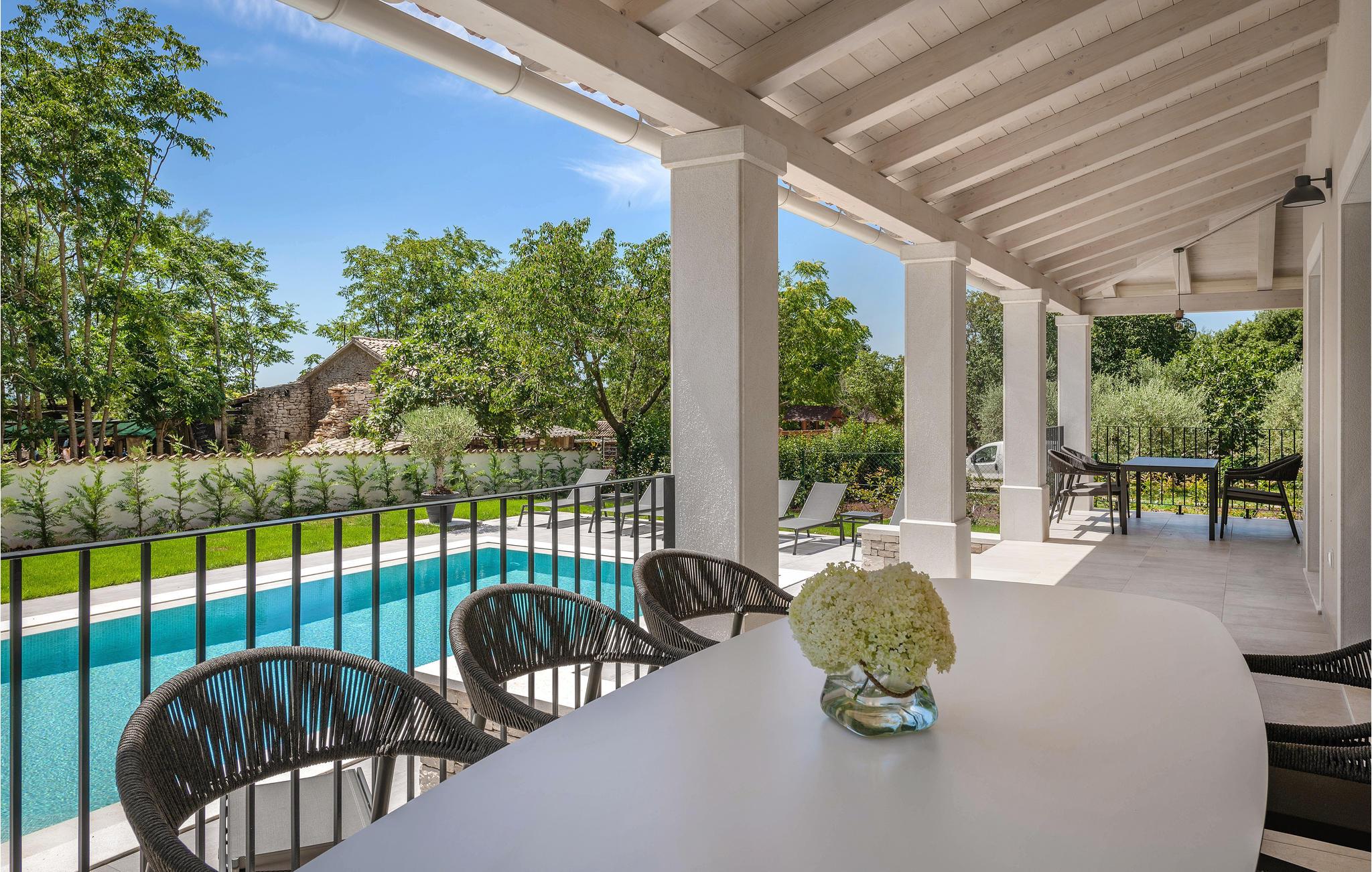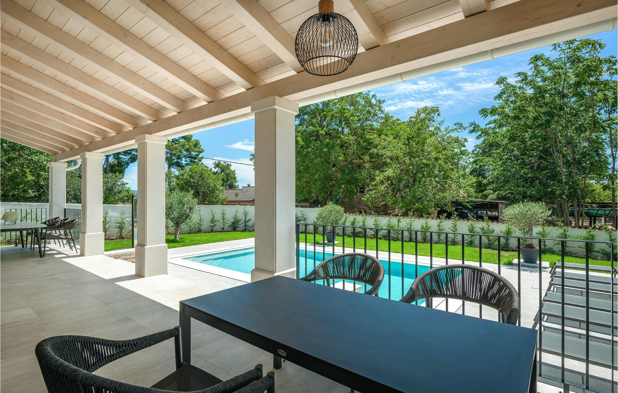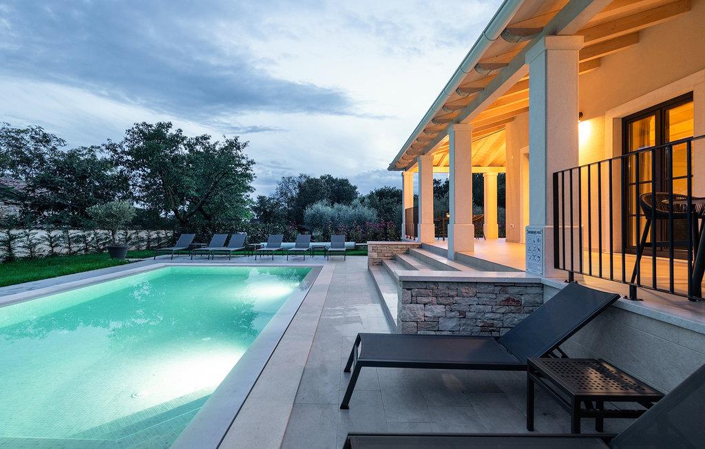 Wenn Sie in einer ruhigen natürlichen Umgebung vollkommen entspannen möchten, ist dieses fantastische Ferienhaus die ideale Wahl für Ihren Urlaub. Es befindet sich in Manjadvorci, einem kleinen Ort auf halbem Weg zwischen den Städten Labin und Pula. Die Innenräume sind mit Qualität und Stil eingerichtet und vollständig an die heutigen Standards angepasst. Der umzäunte Garten wird von einer großen überdachten Terrasse und einem Pool mit Hydromassagedüsen dominiert. Neben dem eingezäunten Grundstück gibt es ein zusätzliches Grundstück mit vielen Einrichtungen zur Unterhaltung der Kleinsten. Die Eigentümer besitzen auch die Barba Tone Ranch, die sich in der Nähe des Hauses befindet und auf der Sie das Reiten lernen können. Für erfahrene Reiter empfehlen wir, die Umgebung bei organisierten Ausflügen mit Pferden oder Quad-Fahrzeugen zu erkunden. Es gibt auch einen kleinen Zoo auf der Ranch, in dem Ihre Kinder gerne Zeit mit Haustieren verbringen. Besuchen Sie den Adrenalinpark Glavani, die Höhle Feštinsko kraljevstvo, Uvala Blaz und Krnicki Porat und entdecken Sie das traditionelle gastronomische Angebot dieser Gegend. Besuchen Sie unbedingt die Touristenzentren von Rovinj, Porec, Rabac, aber auch das antike Pula, das für sein reiches kulturelles Erbe bekannt ist.