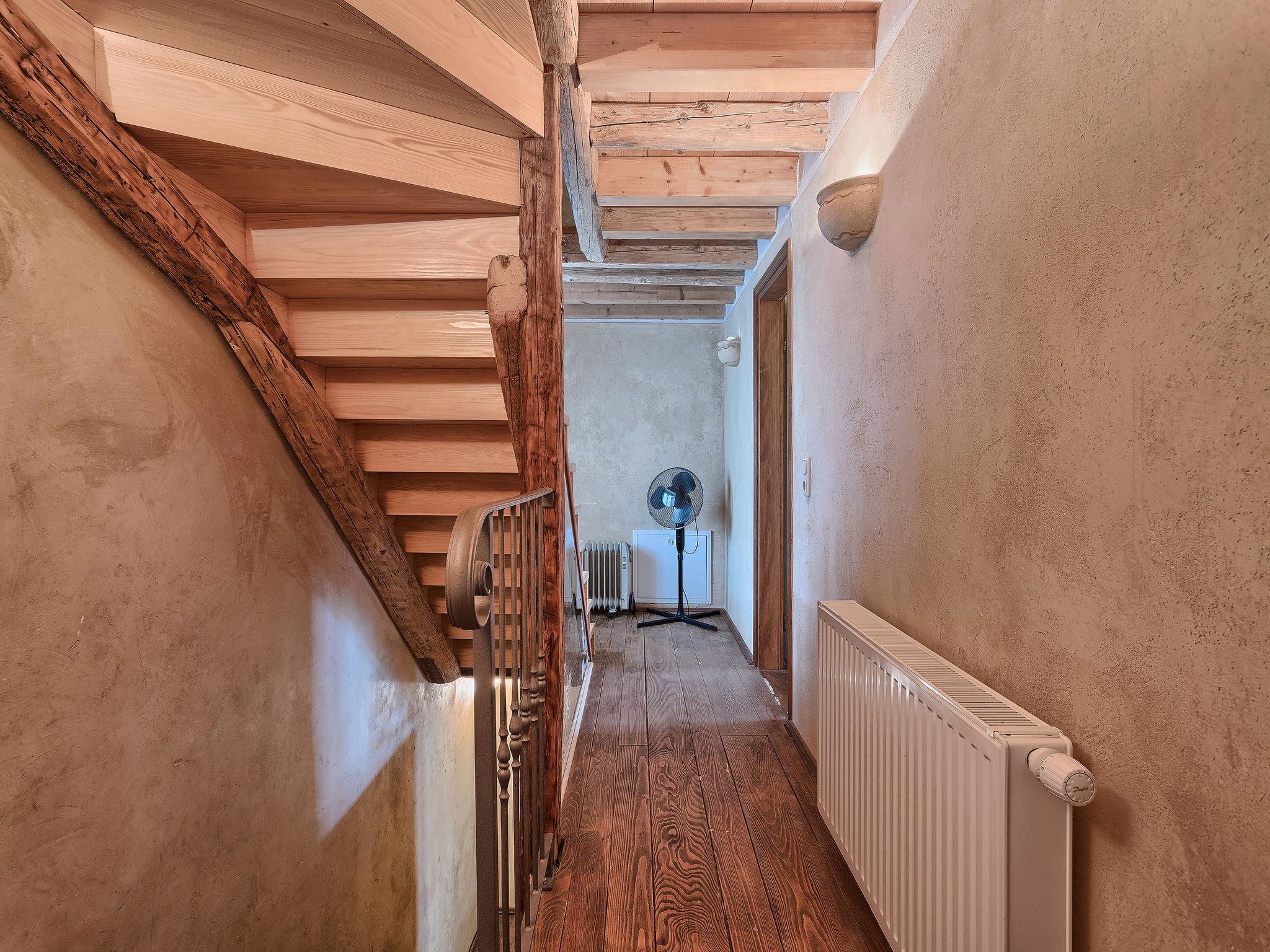 9-room villa 370 m2 on 3 levels. Comfortable and rustic furnishings: living/dining room 58 m2 with open-hearth fireplace (only for decoration), satellite TV (flat screen). Exit to the garden. Living/dining room 40 m2 with open-hearth fireplace, kitchen corner and satellite TV (flat screen). Exit to the garden, to the terrace. Kitchen (4 hot plates, oven, dishwasher, freezer) with dining table, open-hearth fireplace. Exit to the garden, to the terrace. Shower/WC, sep. WC. Upper floor: 1 room with 1 french bed (160 cm, length 190 cm). 1 room with 2 beds (80 cm, length 190 cm). 3 rooms, each room with 1 french bed (160 cm, length 190 cm), shower/WC. Bath/shower/WC. Top floor: 1 room with sloping ceilings, ceiling height 120 - 230 cm with 1 french bed (160 cm, length 190 cm), bath/WC. 1 room with sloping ceilings, ceiling height 120 - 250 cm with 1 double sofabed (140 cm, length 190 cm), 1 french bed (160 cm, length 200 cm), bath/WC. Heating (extra). Terrace 20 m2, roofed, 2 terraces 15 m2. Terrace furniture, deck chairs. Beautiful view of the countryside. Facilities: Internet (WiFi, free). 1 small pet/ dog allowed. House consists of 2 semi-detached parts, one 5-room and one 4-room. Each part with living/dining area and kitchen in ground floor, bedrooms in upper floors.