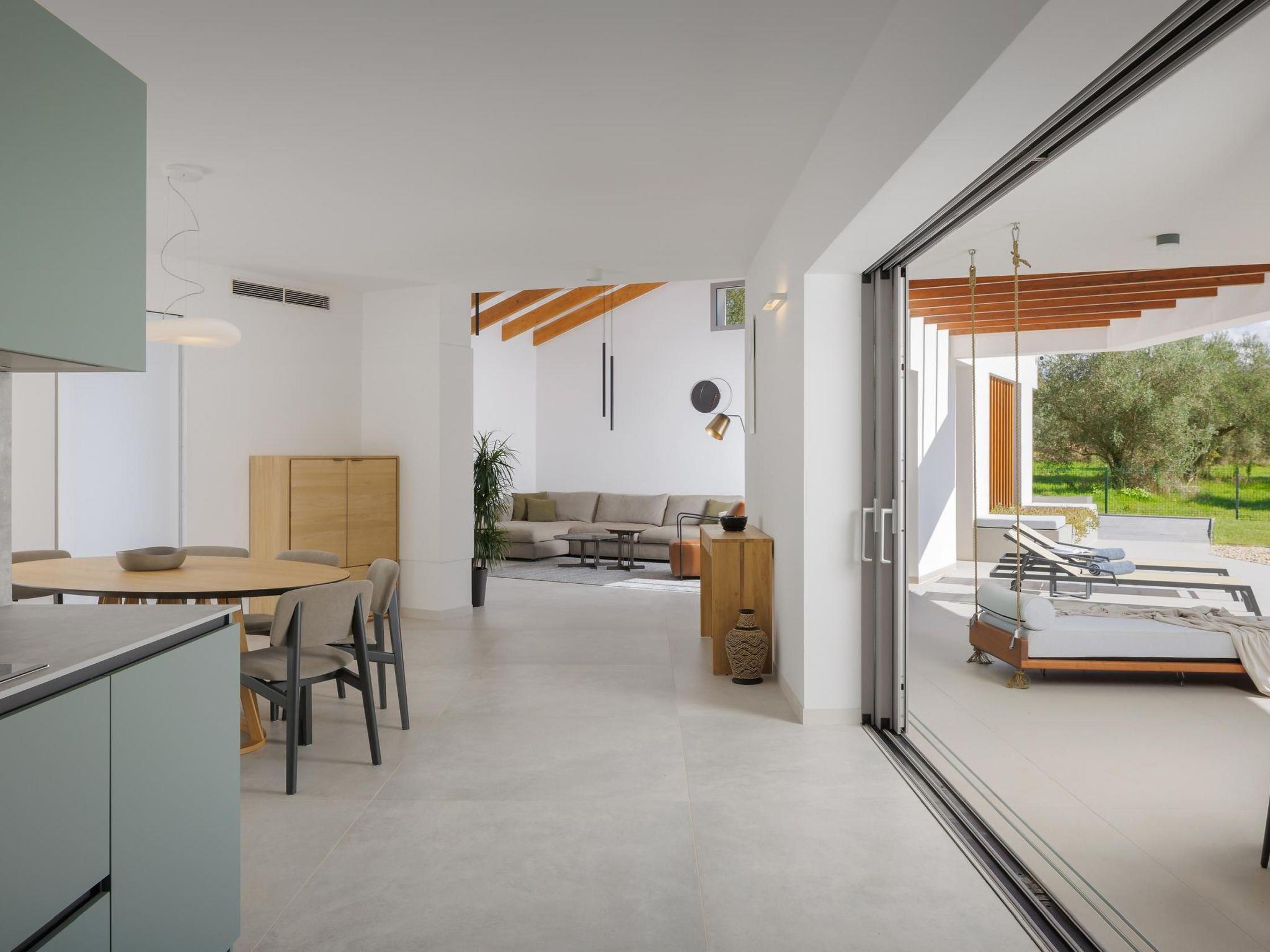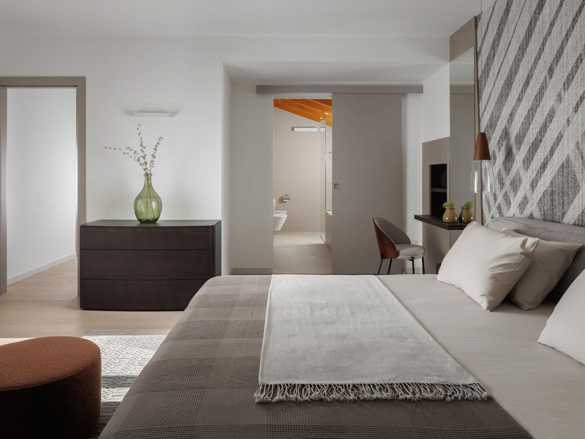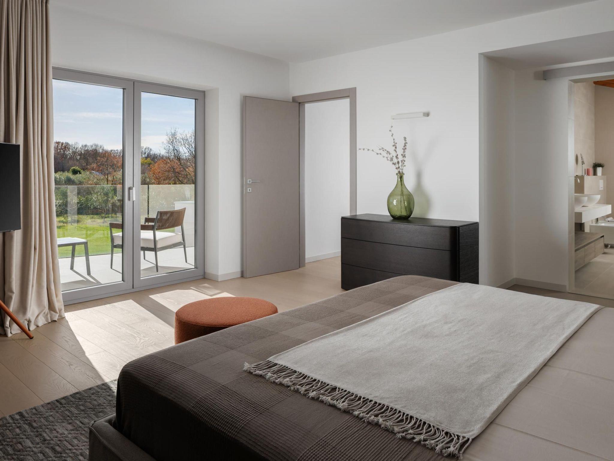 The master bedroom is located on the first floor, with a king-size double bed, a luxurious en-suite bathroom with a bathtub and shower. It offers a access to a covered balcony overlooking the pool and olive garden.