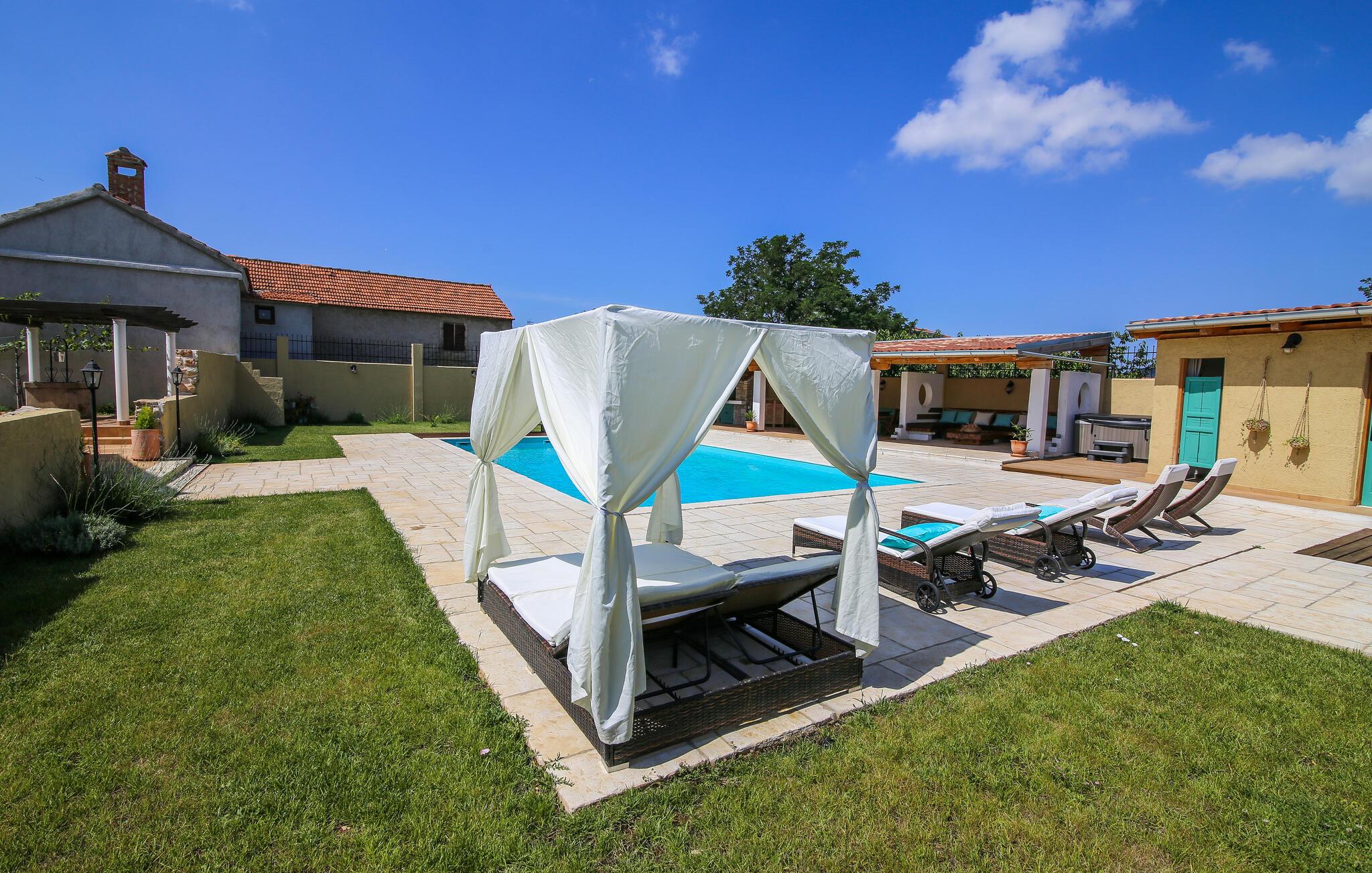 Auch der Außenbereich lockt mit reizvollen Extras. Erfrischen Sie sich im großen Pool, spielen Sie Boule oder gönnen Sie sich eine Runde Entspannung im Whirlpool, während die Kinder die vielen Spielmöglichkeiten nutzen. Genießen Sie erholsame Siestas auf dem Daybed, anregende Gespräche in der Lounge und zelebrieren Sie die gemeinsame Zeit mit stimmungsvollen Grillabenden.