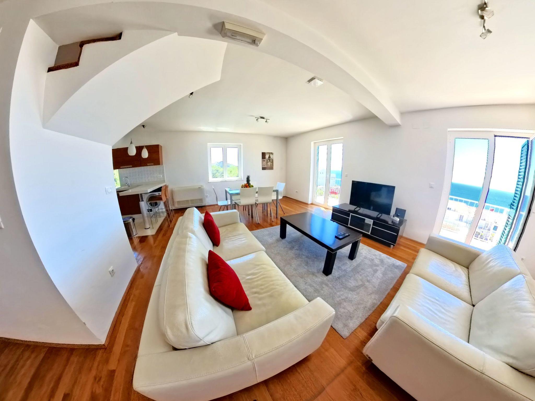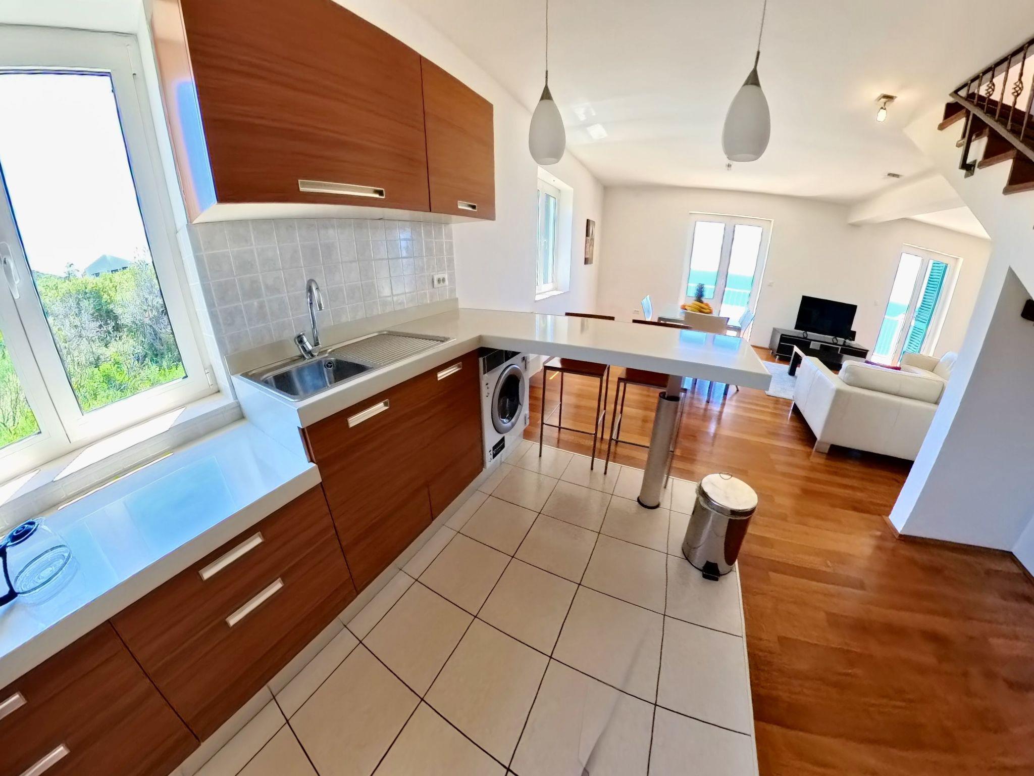 Inside, the apartment is air-conditioned throughout, promising a cool respite from the warm Dalmatian sun. The living area is a haven of comfort, featuring leather sofas that invite you to relax, a TV, DVD player, and stereo system for your entertainment needs. The seamless transition to the open kitchen ensures that meal preparation is as social as it is easy. Equipped with a ceramic hob, dishwasher, microwave, coffee machine, and electric kettle, it has everything you need for a holiday of convenience and culinary exploration. For laundry needs, a washing machine and clothes dryer are provided for your exclusive use, ensuring all the comforts of home while you're away.