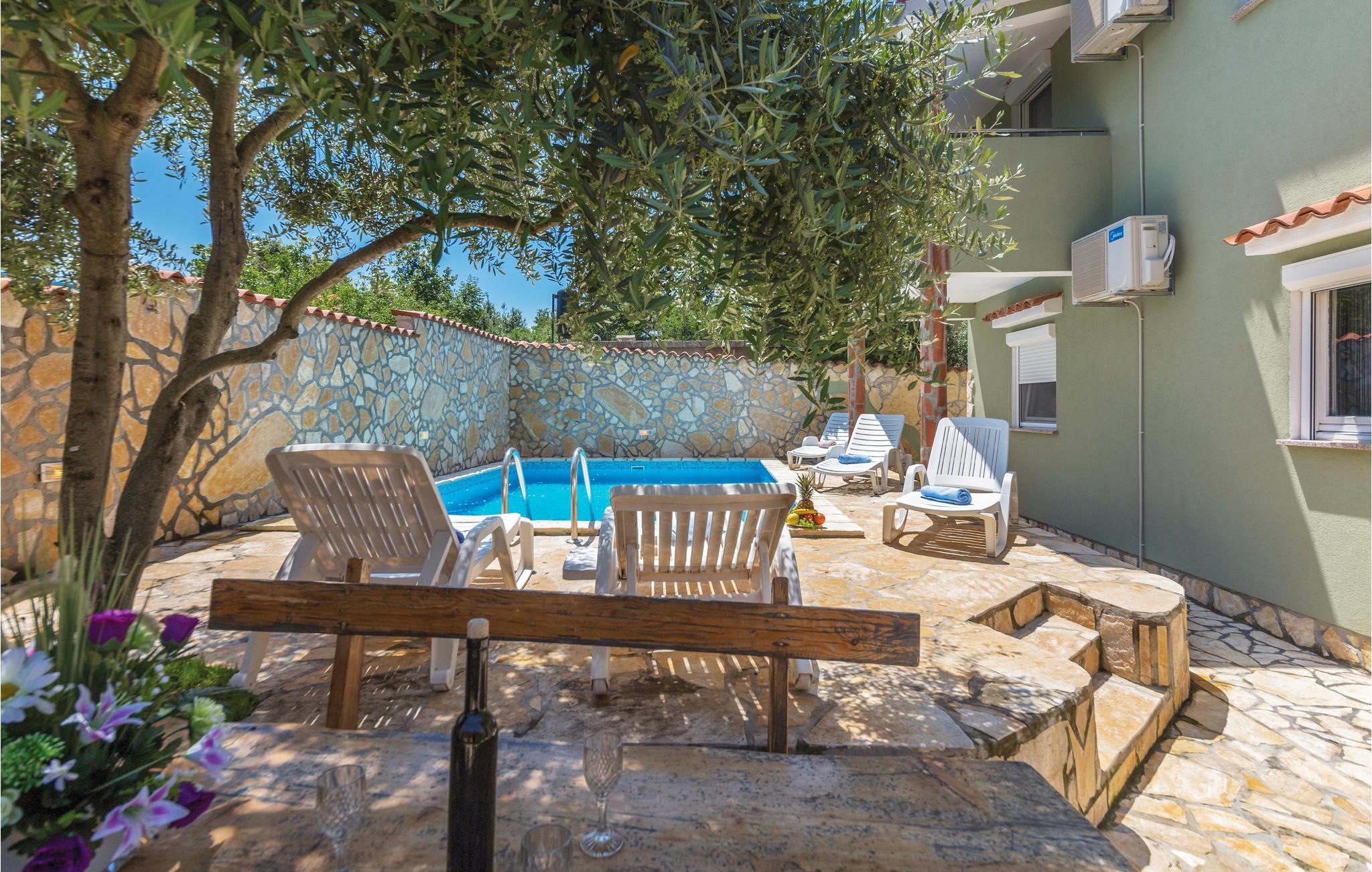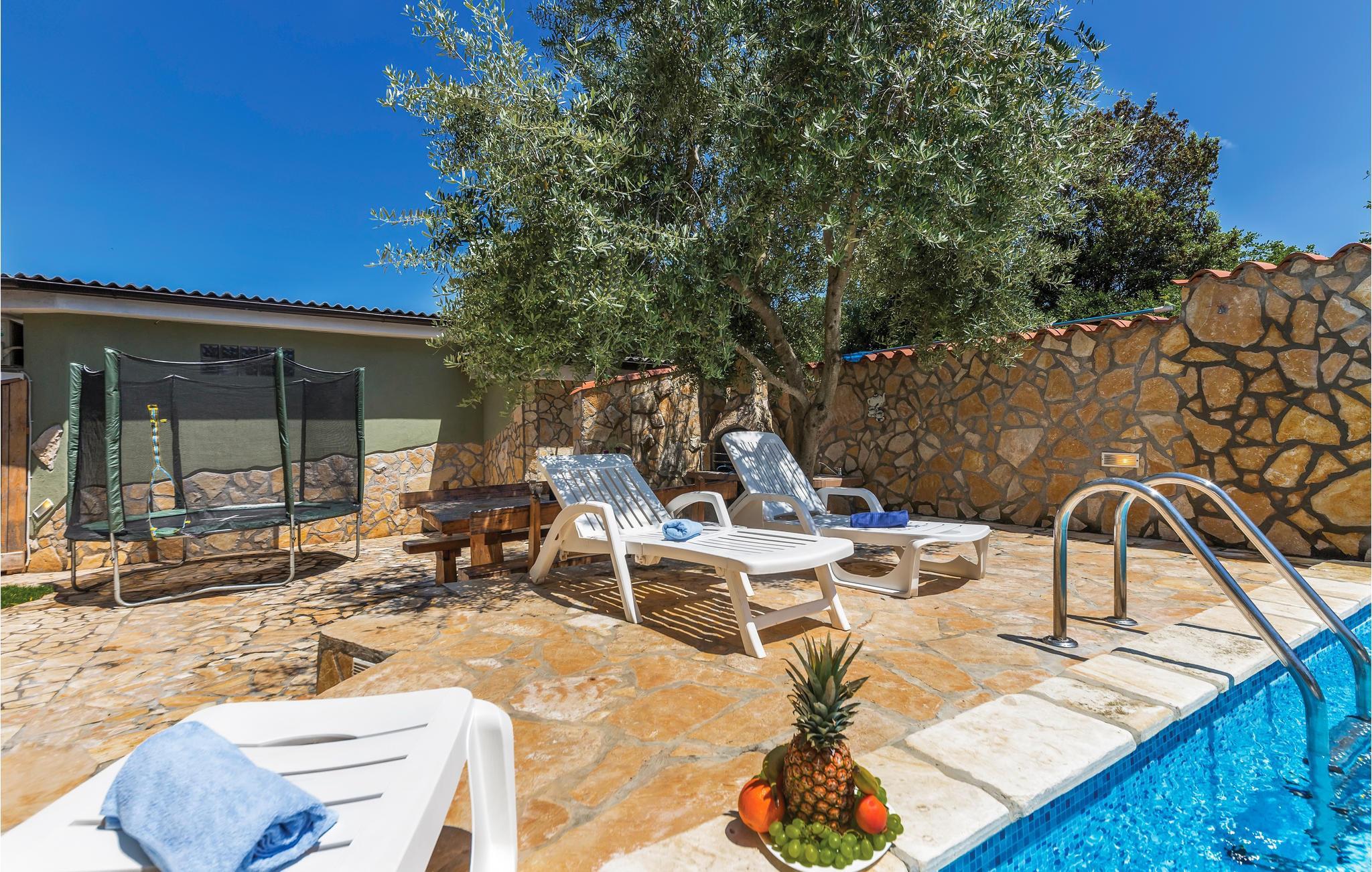 Dieses Ferienhaus liegt im kleinen, ruhigen Dorf Peroj. Der erste Stock wird über einen separaten Eingang erreicht, hier liegen zwei Schlafzimmer und ein Badezimmer. Im Erdgeschoss befinden sich zwei Schlafzimmer, die Küche mit Wohnzimmer sowie das Badezimmer. Das eingezäunte Grundstück, das mit Olivenbäumen bepflanzt ist, beinhaltet den schönen Pool und daneben einen Grill. Die Terrasse auf der ersten Etage bietet einen teilweisen Blick auf das Meer, wo Sie Ihren Morgenkaffee umgeben von mediterranem Flair genießen können.