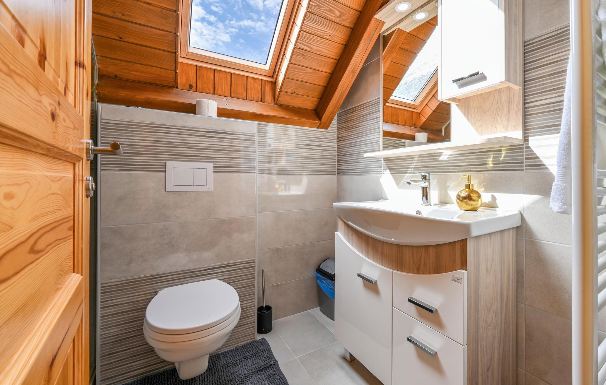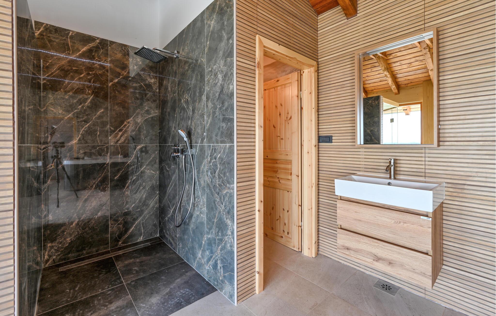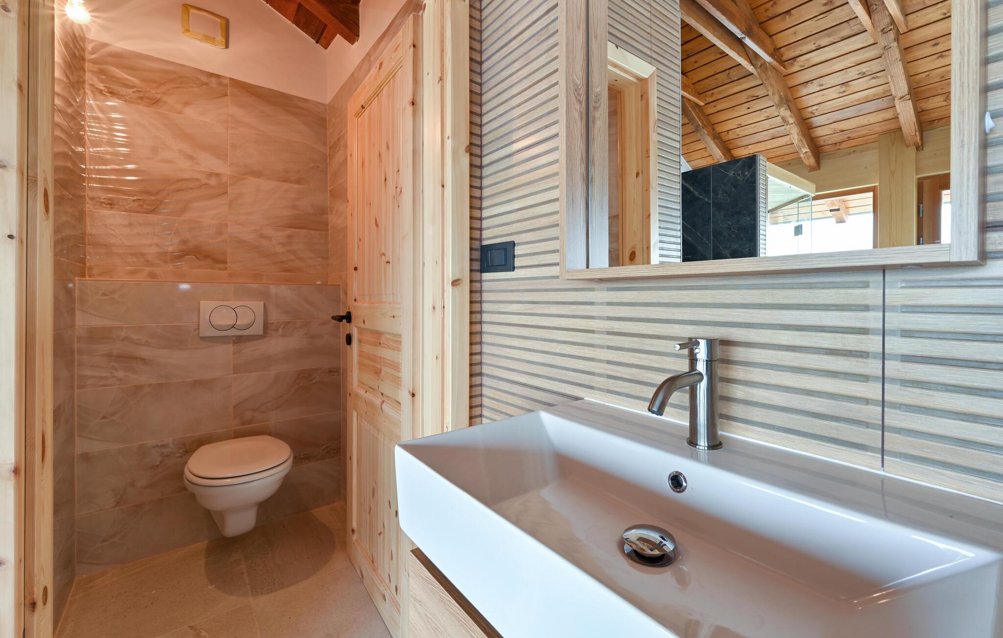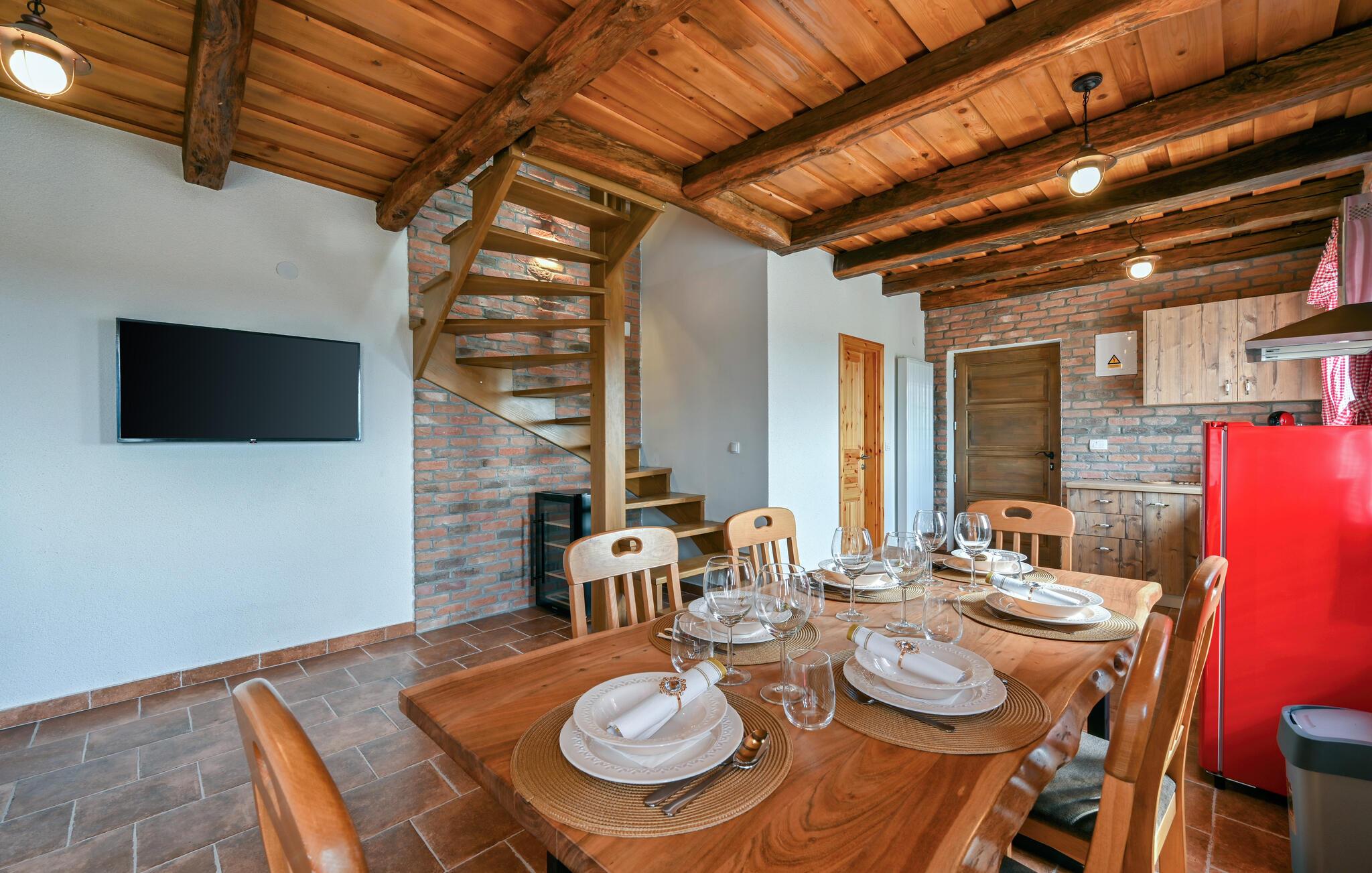 Willkommen in dem einladenden Haus, das Sie in fantastischer Panoramalage umgeben von einer malerischen Landschaft empfängt. Es verdankt seinen Charme der Einrichtung mit rustikaler Gemütlichkeit, die durch schöne Holzdecken und teilweise sichtbares Mauerwerk gepaart mit modernem Komfort entsteht, und lädt zu einer erholsamen Pause vom Alltag ein. Entspannen Sie nach Ihren Aktivitäten in der Umgebung in gemütlichem Rahmen, machen Sie es sich am Esstisch bequem und veranstalten Sie einen Spieleabend, genießen Sie nach dem Saunagang ein Bad im Whirlpool oder plaudern Sie bis spät in den Abend am leise knisternden Kamin.