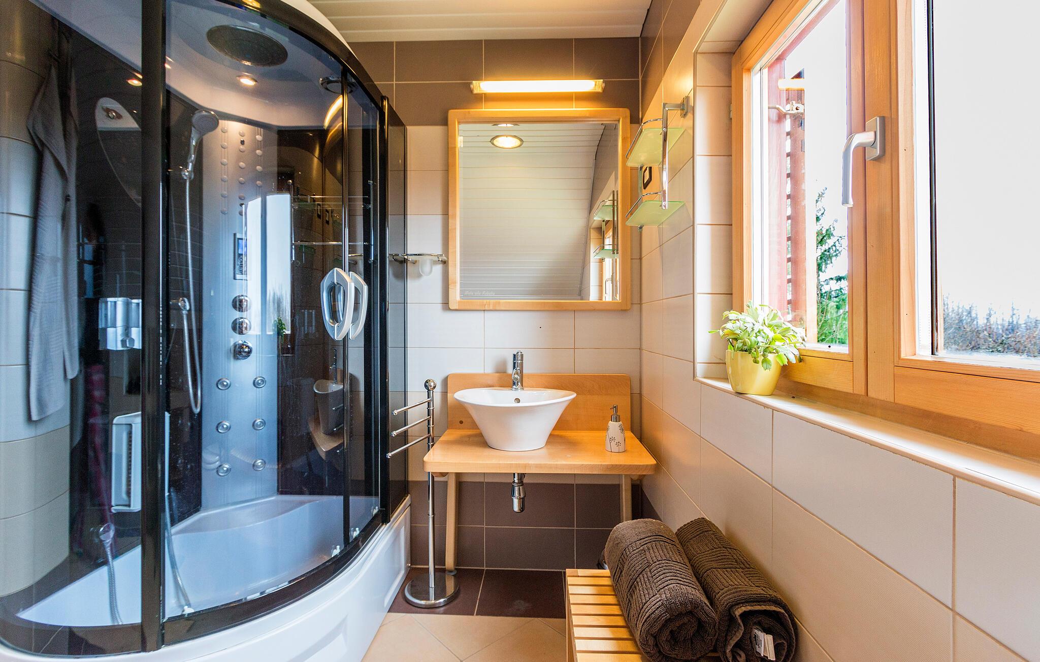 Dieses, dicht an einem duftenden Wald gelegene, Ferienhaus verwöhnt Sie mit einem großzügigen und gemütlichen Innenbereich, in dem Entspannung an erster Stelle steht. Freuen Sie sich auf gesellige Mahlzeiten, spielen Sie Billard, während der Kamin leise im Hintergrund prasselt, gönnen Sie sich wohlige Momente in der Sauna oder im Whirlpool und kommen Sie auf der bequemen Sofalandschaft für eine spannende Serie zusammen.