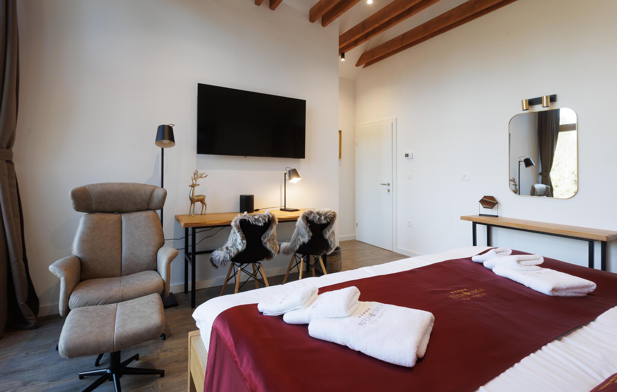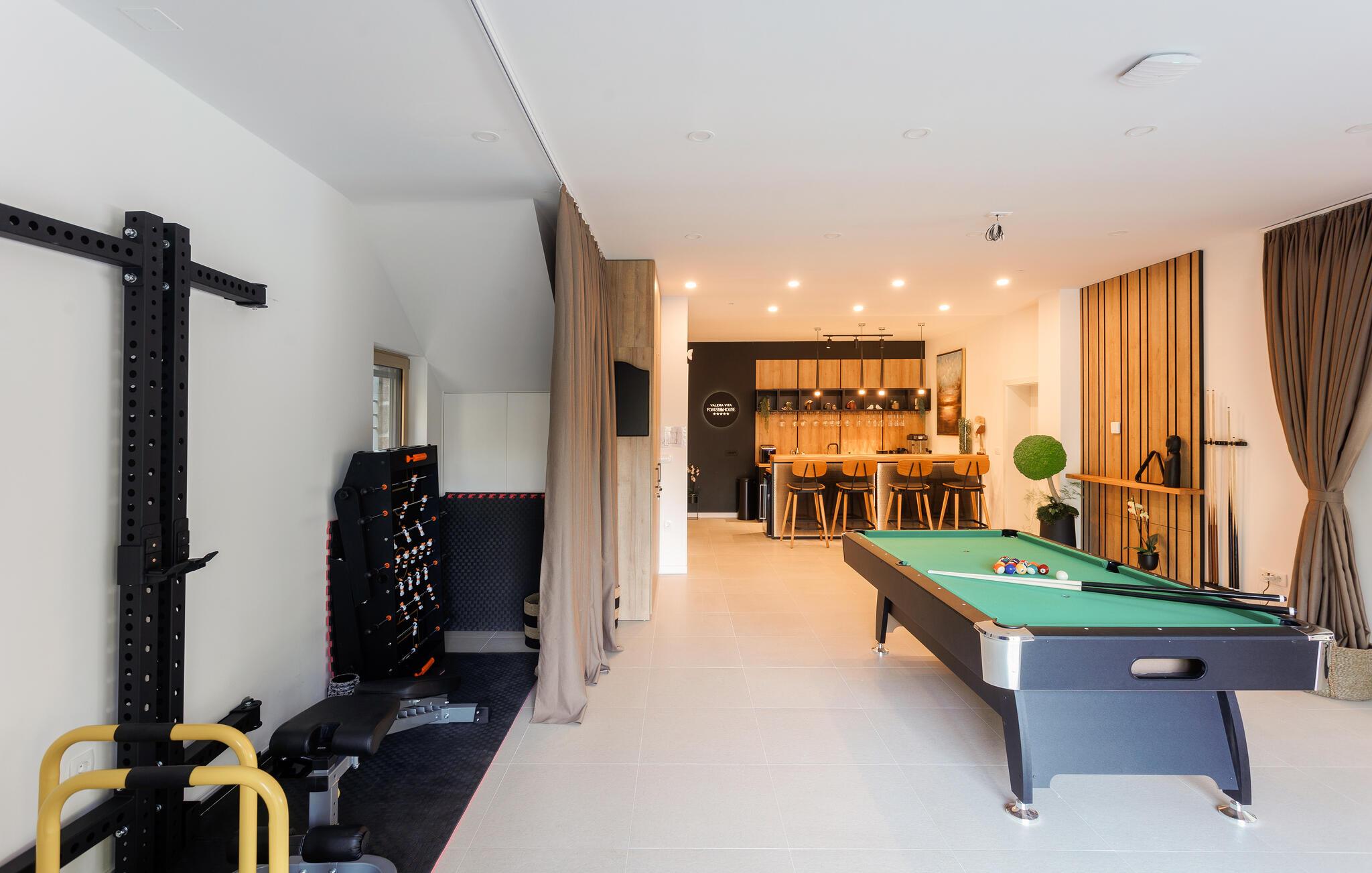 Dieses sensationelle Urlaubsdomizil lässt keine Wünsche offen. In ruhiger, idyllischer Lage können Sie harmonische Mahlzeiten und gesellige Stunden genießen. Gönnen Sie sich wohlige Momente in der Sauna oder im Whirlpool, halten Sie sich auf dem Trimmrad fit oder spielen Sie eine Runde Billard oder Tischfußball. Plaudern Sie an der hauseigenen Bar bei einem Cocktail oder streamen Sie Ihre Lieblingsserie.