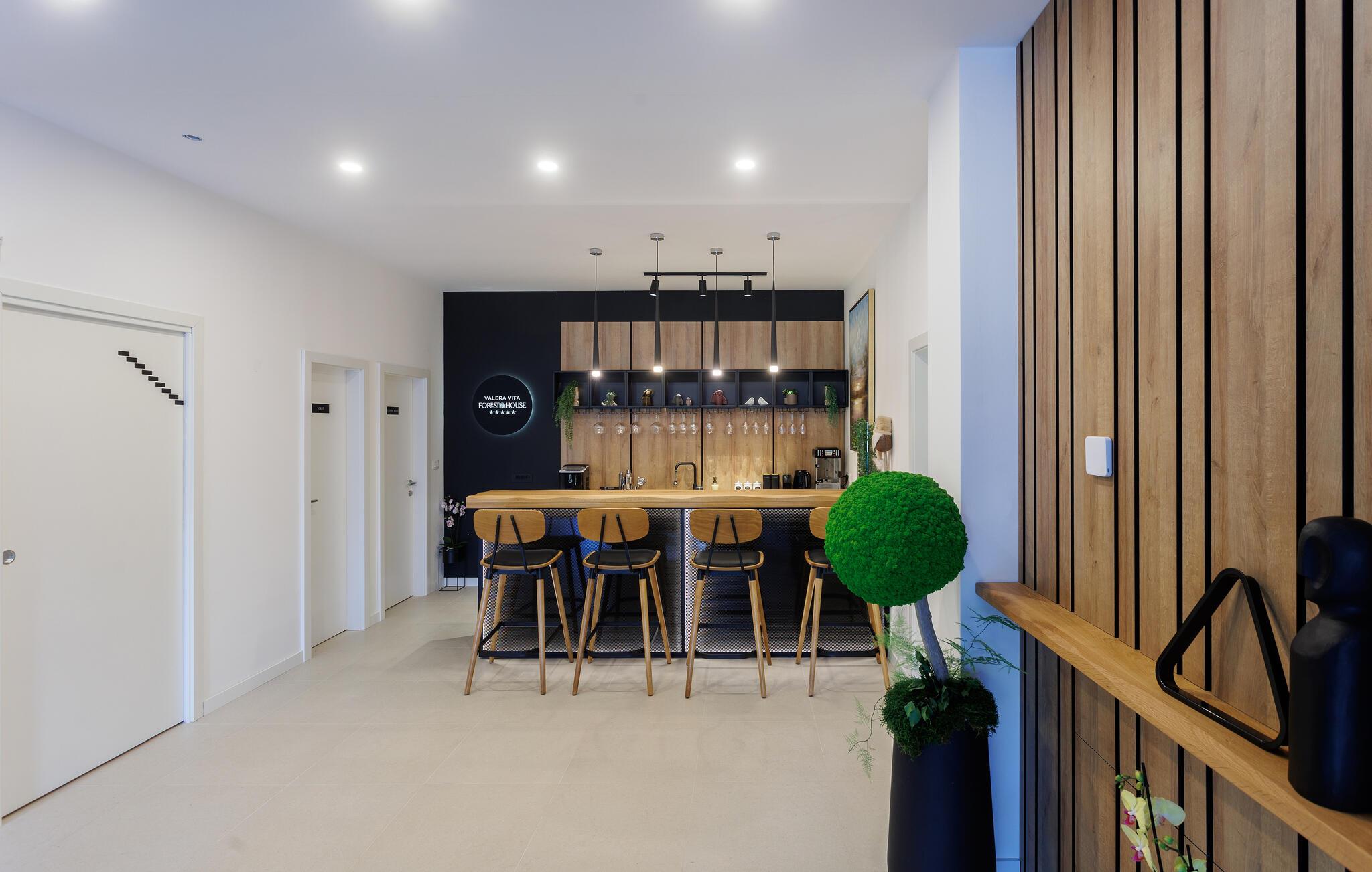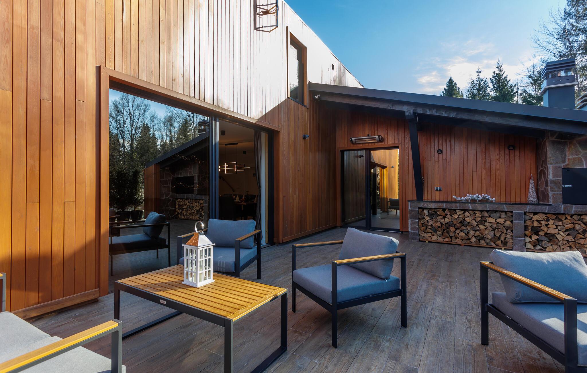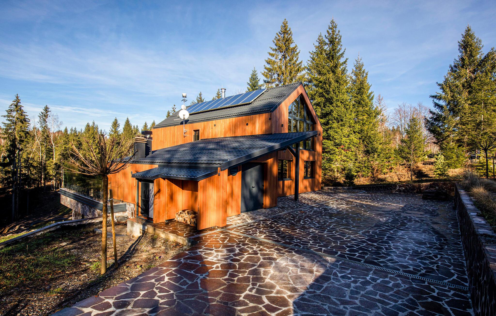Der wunderschöne Pool, an dem Sie mit Blick auf den Wald entspannen können, kann sowohl offen als auch geschlossen genutzt werden. Atmen Sie nach einem wohligen Bad die frische Waldluft auf der Terrasse ein und lassen Sie die friedliche Atmosphäre auf sich wirken.