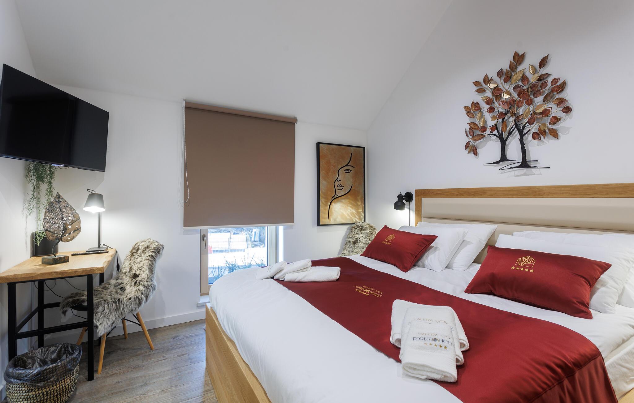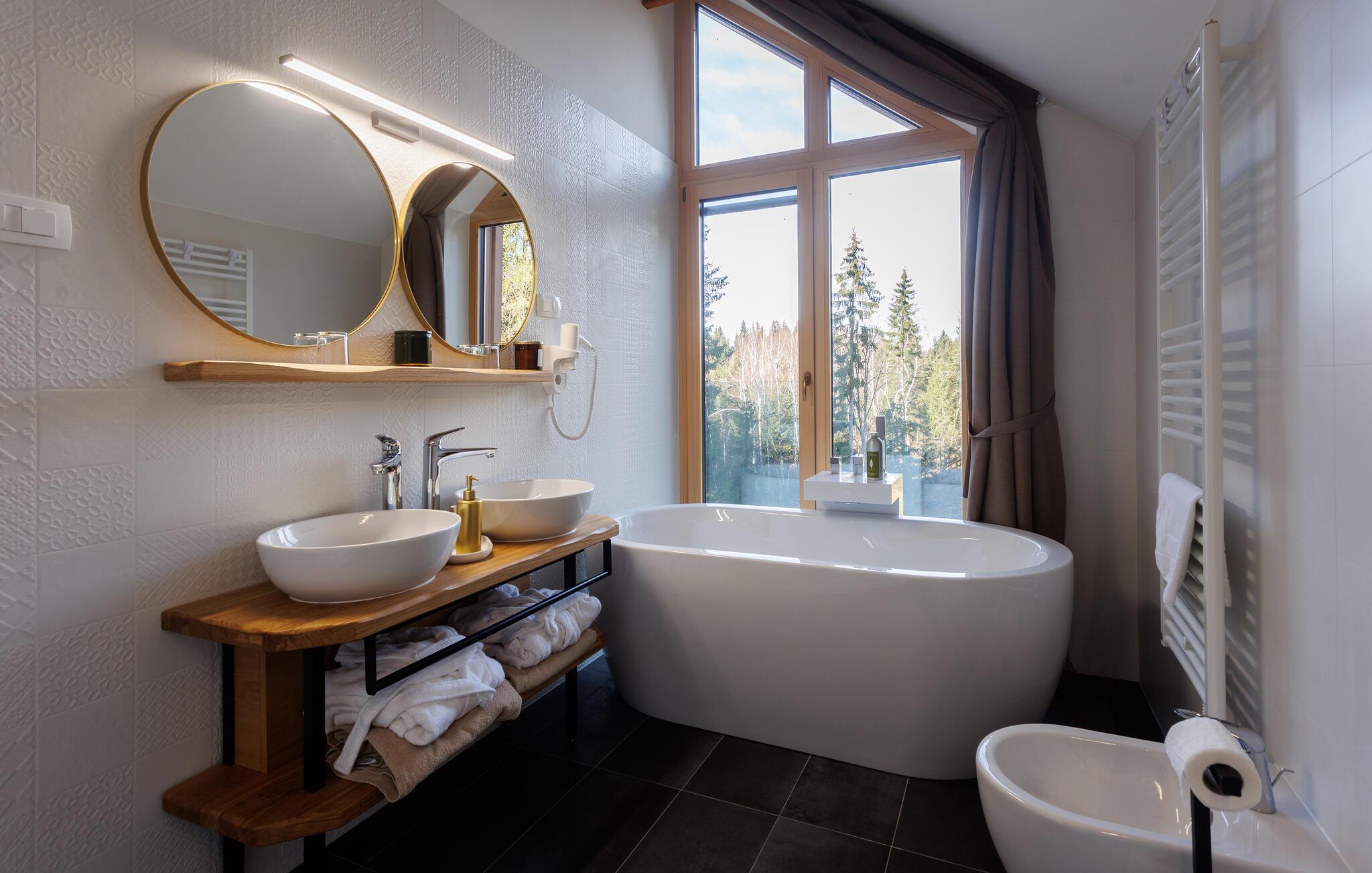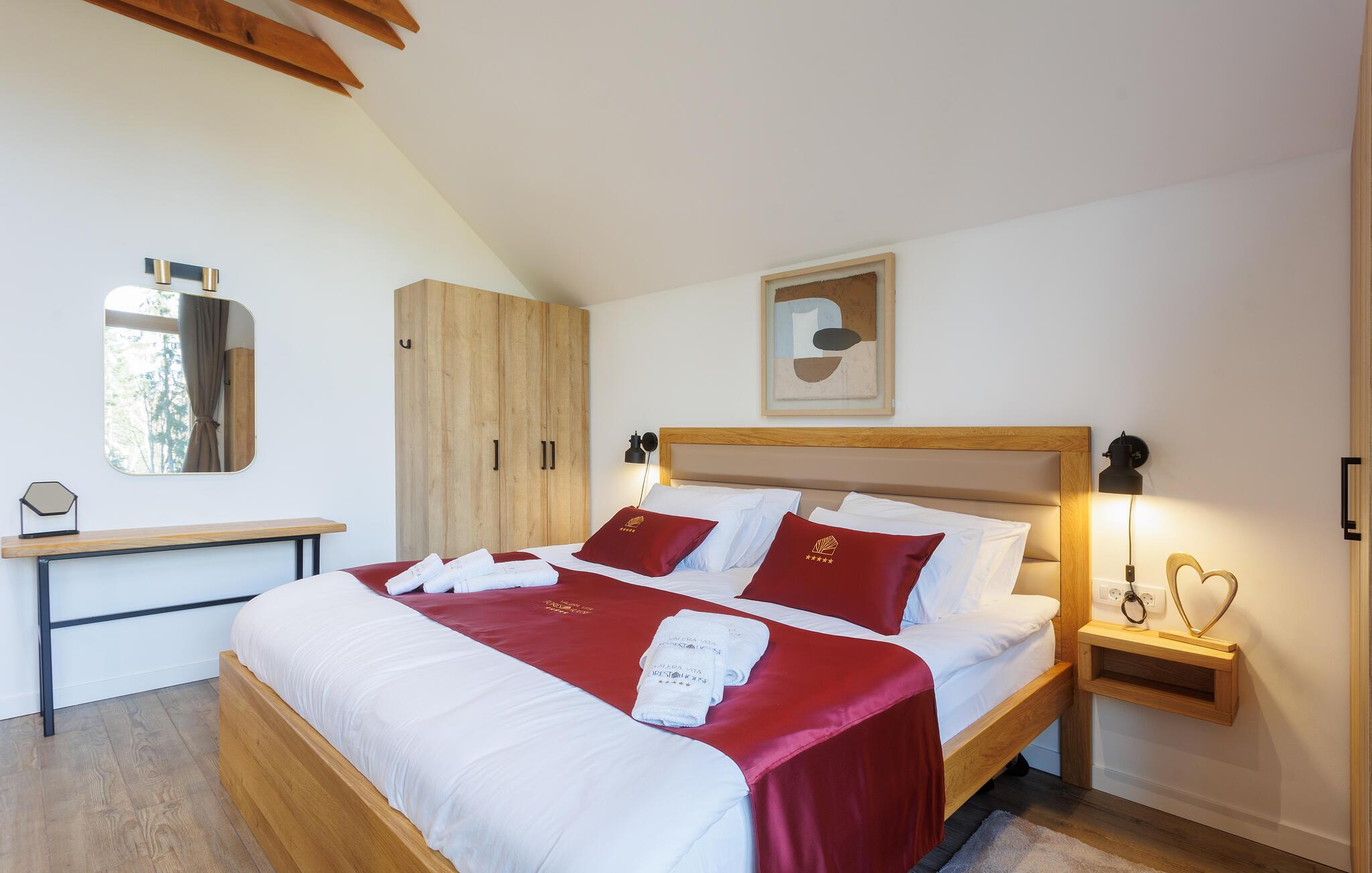 Der wunderschöne Pool, an dem Sie mit Blick auf den Wald entspannen können, kann sowohl offen als auch geschlossen genutzt werden. Atmen Sie nach einem wohligen Bad die frische Waldluft auf der Terrasse ein und lassen Sie die friedliche Atmosphäre auf sich wirken.