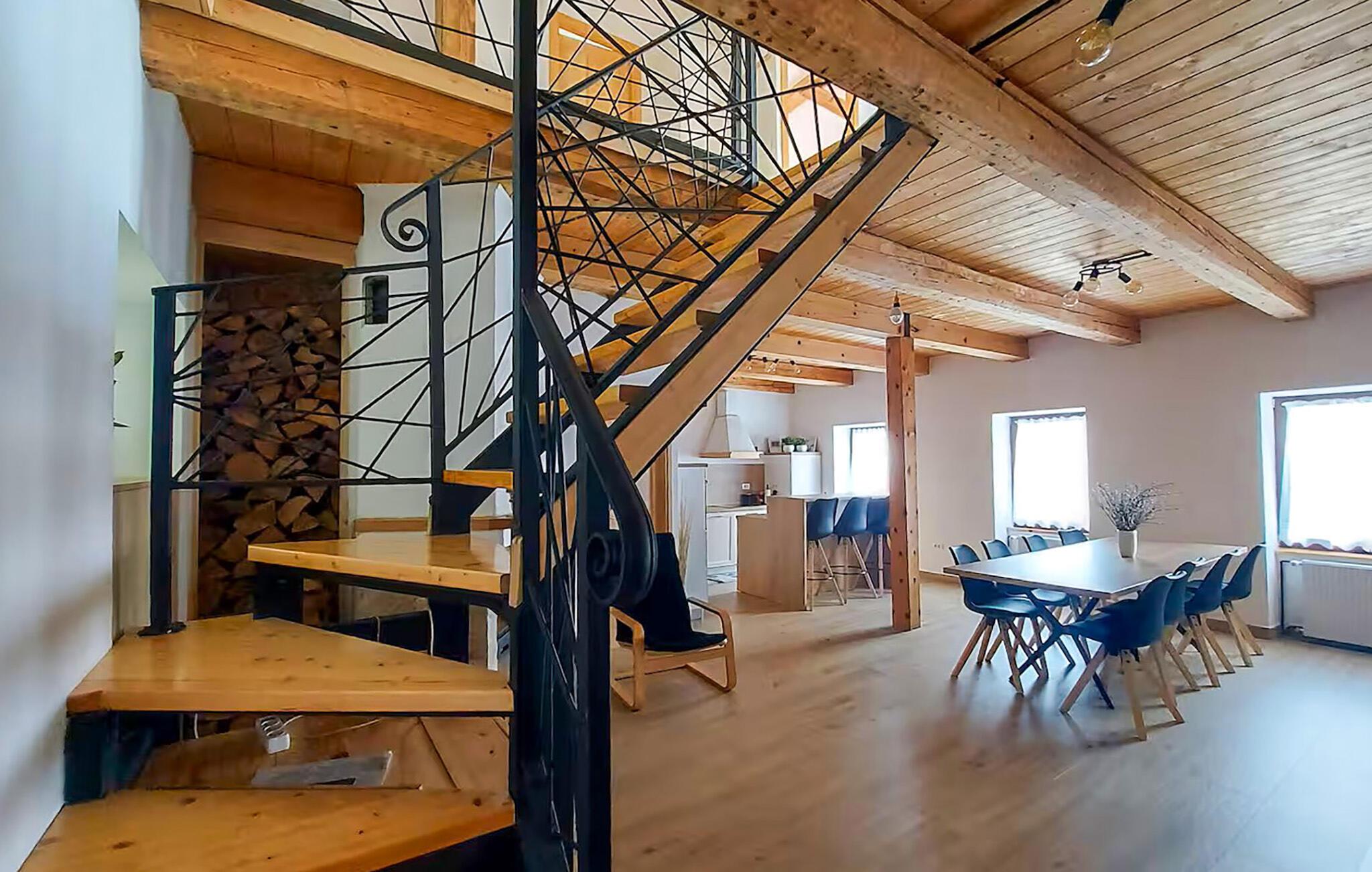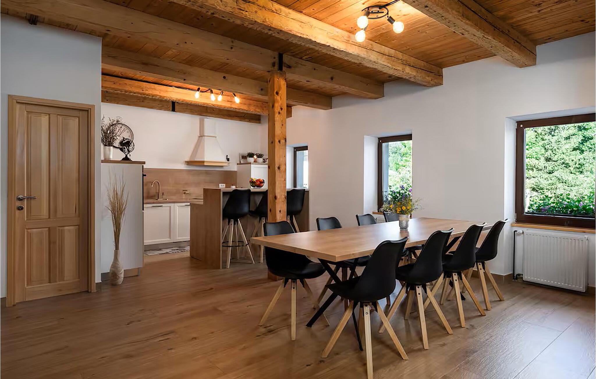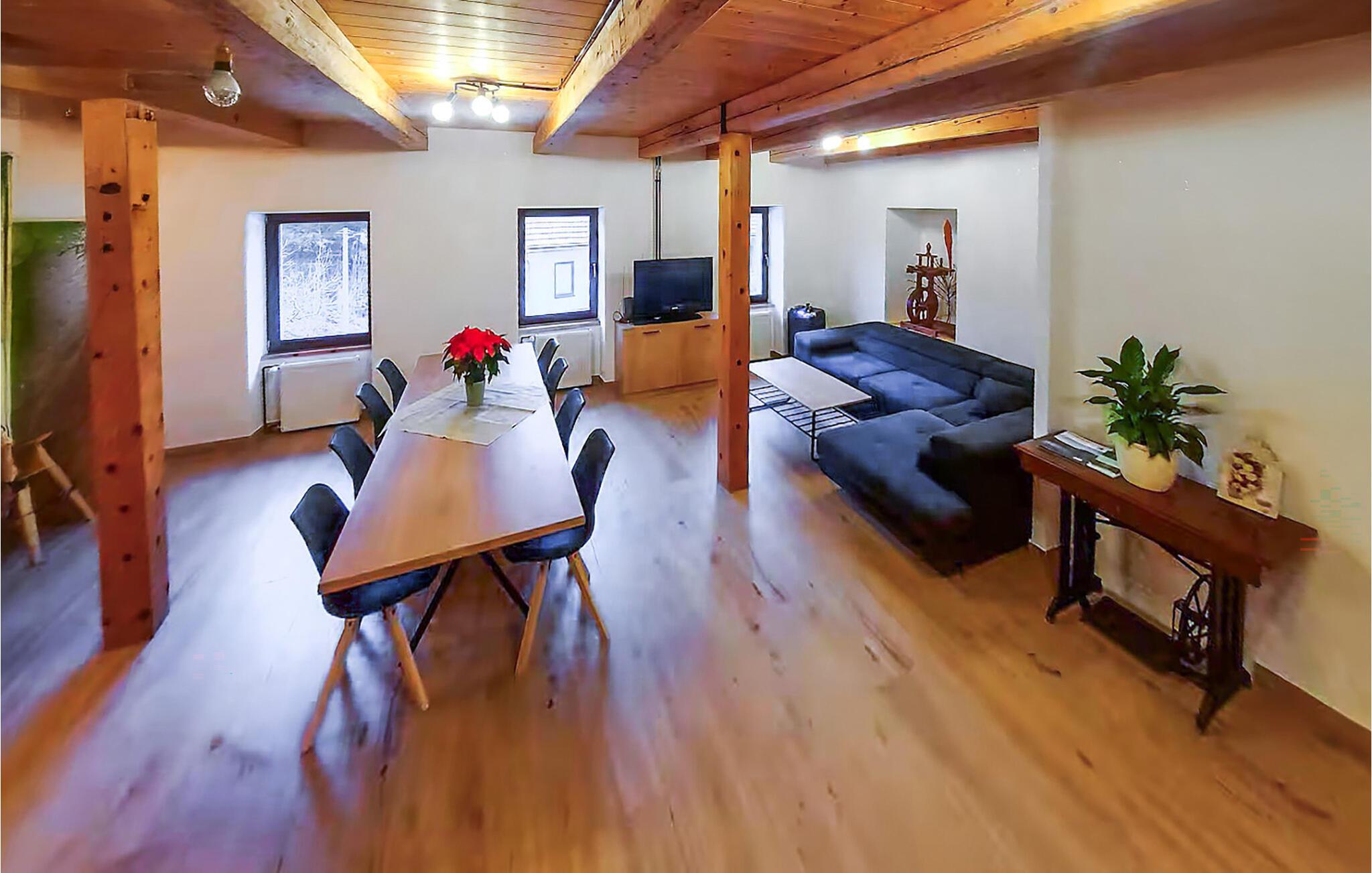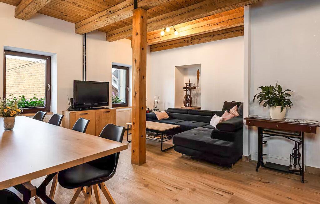 Diese komfortable und geräumige Ferienwohnung bietet Ihnen ein behagliches Refugium, während Sie mit Ihren Liebsten die malerische Natur erkunden. Bereiten Sie in geselliger Runde stärkende Mahlzeiten zu und nehmen Sie am einladenden Esstisch Platz. Planen Sie gemeinsam Ihre Unternehmungen und veranstalten Sie nach einem langen Tag an der frischen Luft gemütliche Filmabende oder machen Sie es sich mit einem Brettspiel bequem.