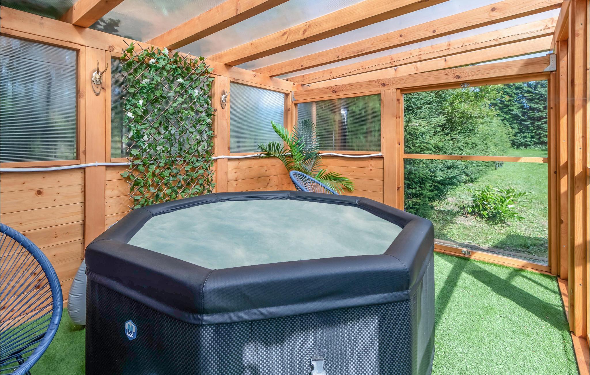 Willkommen in diesem geräumigen Holzhaus mit schönem Garten und Whirlpool im Freien.