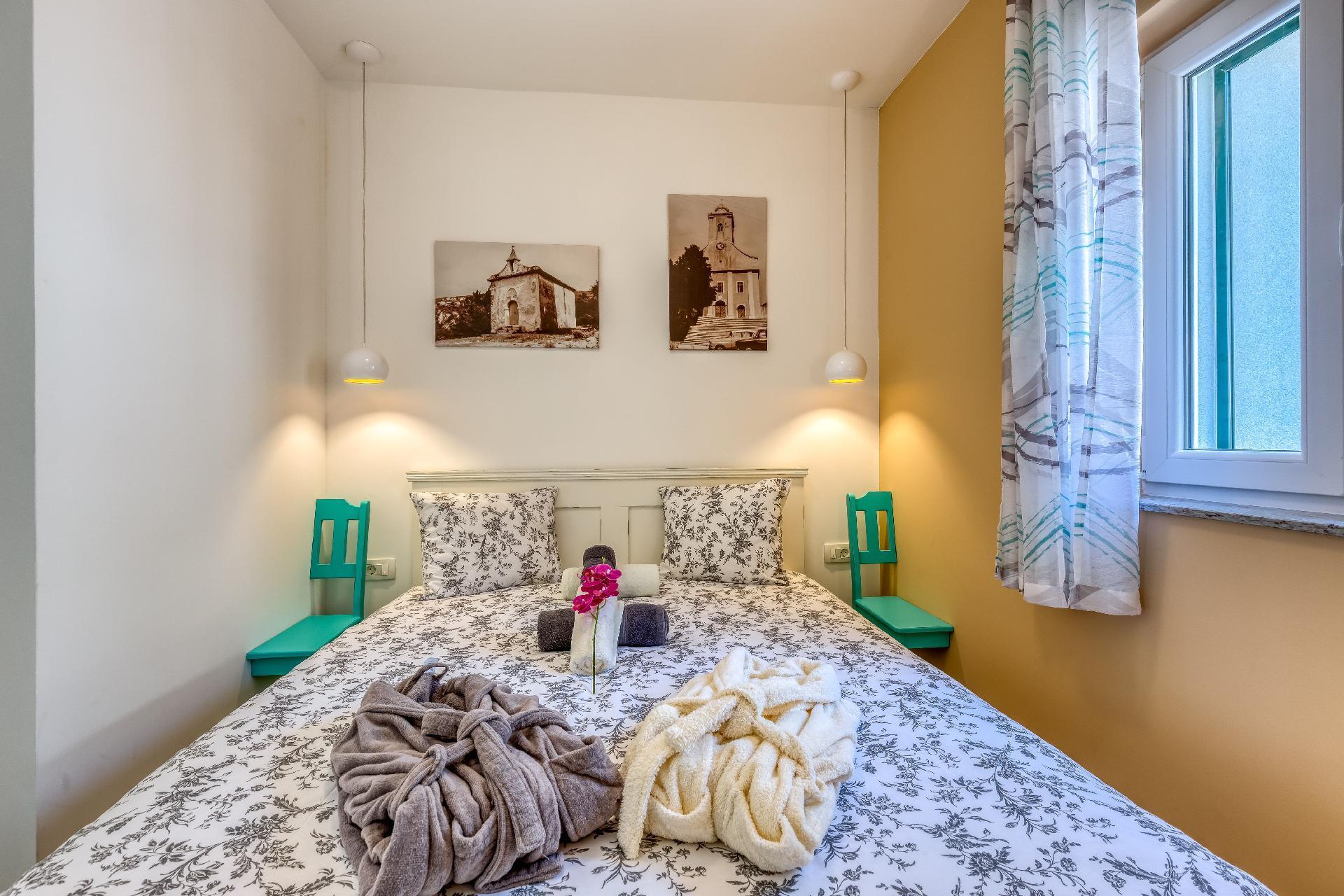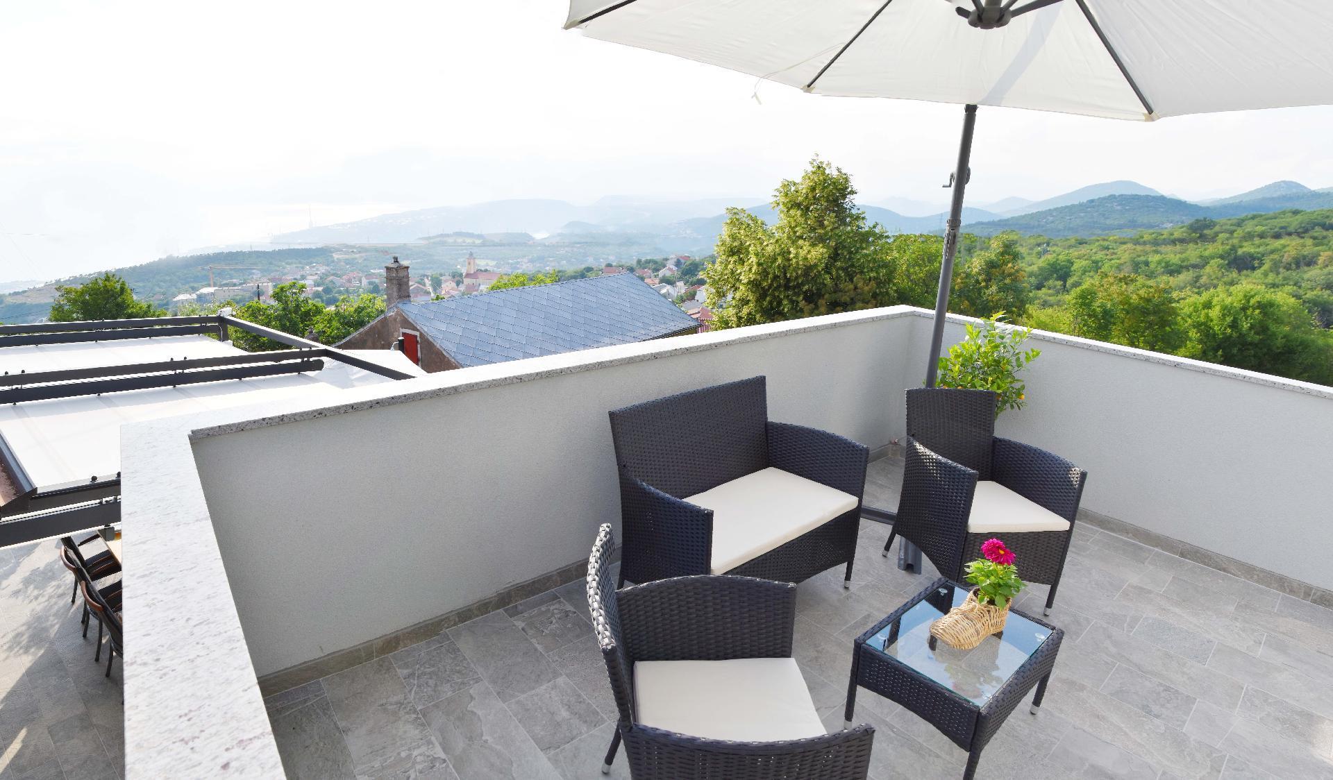 10 minutes by car to the beaches on Adraitic sea and 15 minutes to the mountains of Gorski kotar. The beautiful forests around and three lakes are ideal for walking or cycling. The house consists of 2 floors. The ground floor has a living room, kitchen with dining area, bathroom, toilet, sauna, fitness room, laundry. 1st floor accessible via outside and inside spiral stairs: 2 double bedrooms each with its own bathroom and 1 family room (2 separate bedrooms) with bathroom, balcony and terrace with sea view.