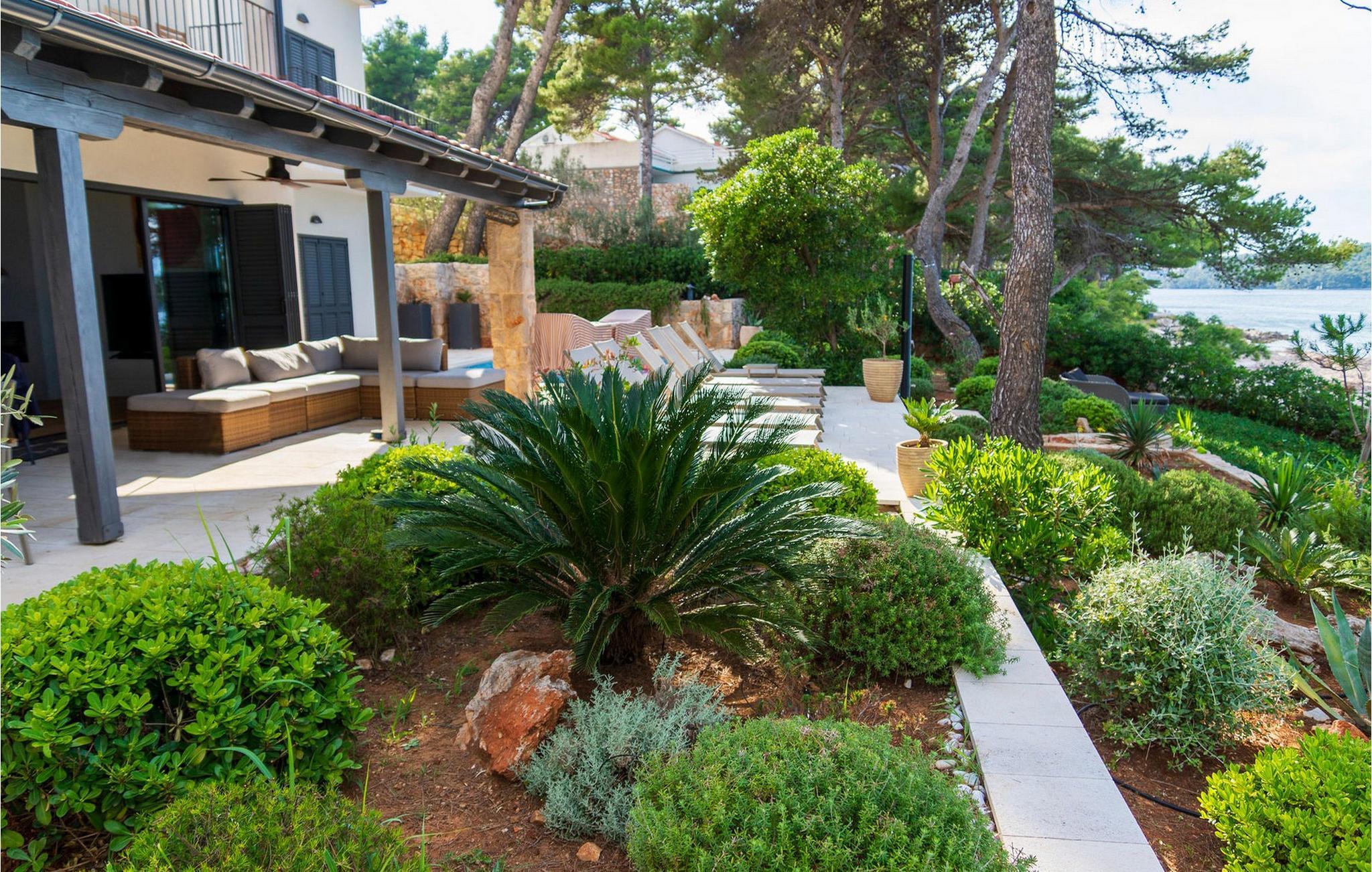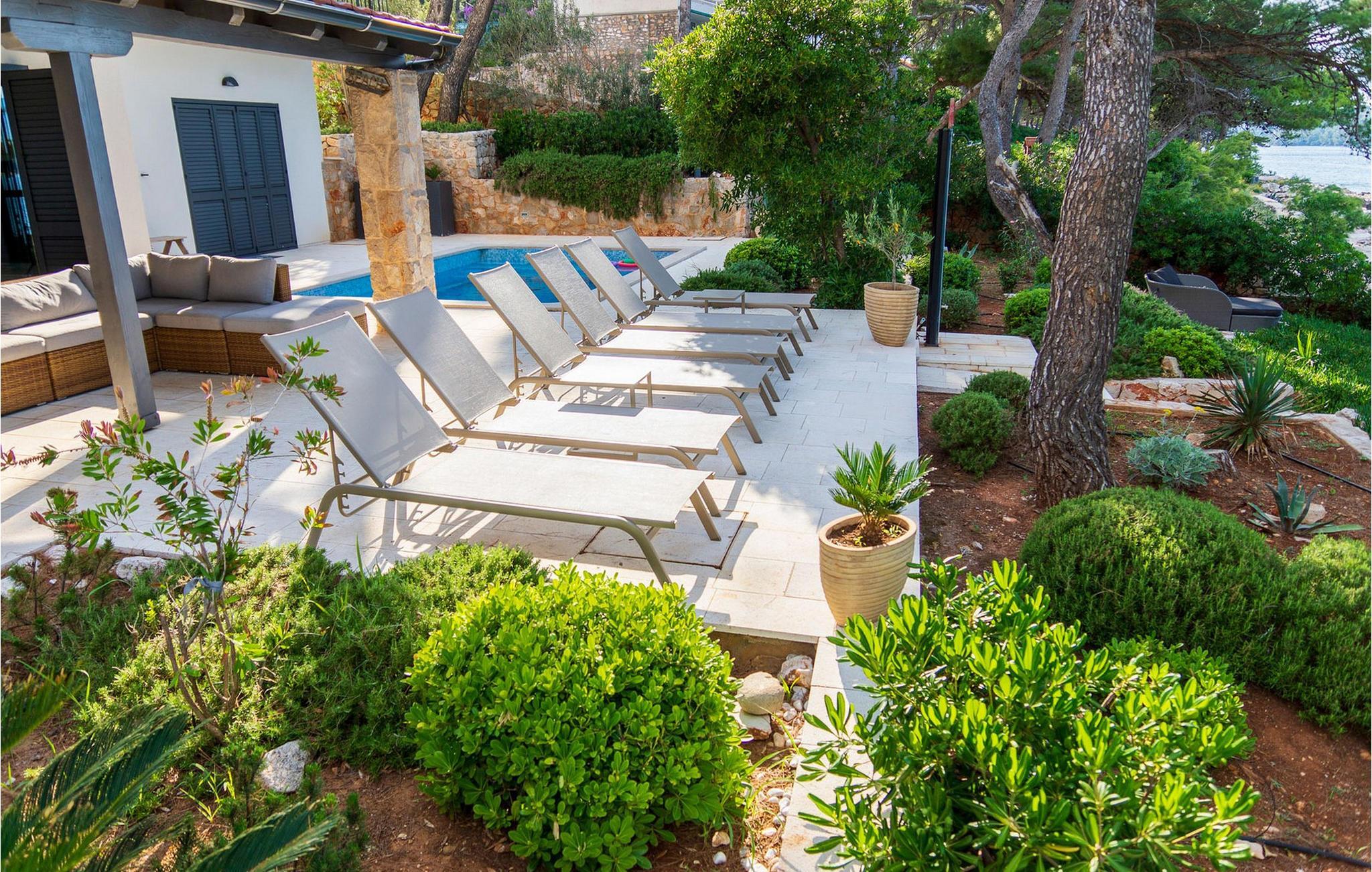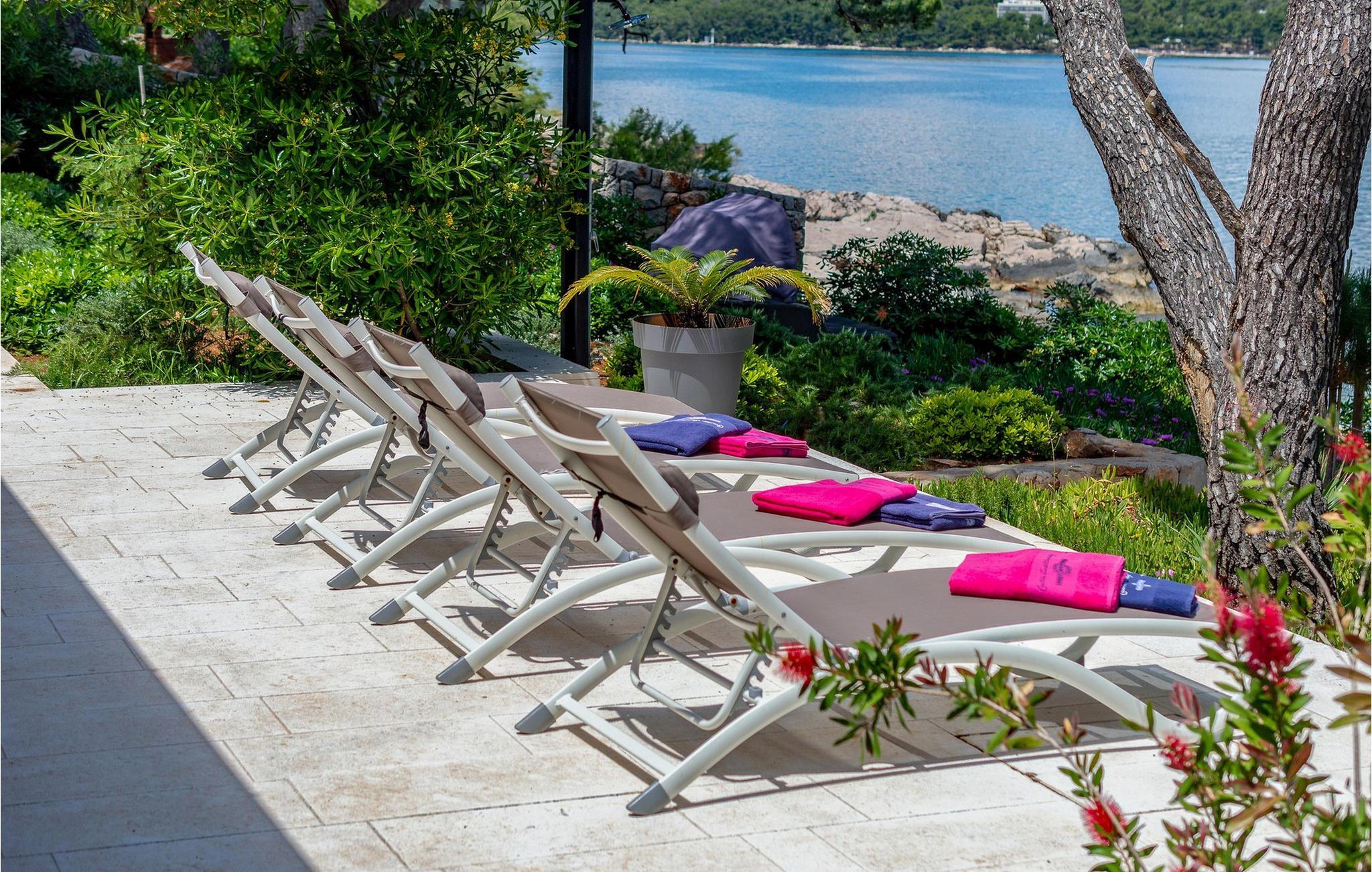 Ihr wunderschönes, mit mediterranen Pflanzen geschmücktes Grundstück verfügt über eine private Bucht mit angelegtem Zugang zum Meer. Hier genießen Sie absolute Privatsphäre, während Sie die friedliche Atmosphäre im Pool oder auf der Sonnenliege auf sich wirken lassen. Freuen Sie sich auf stimmungsvolle Sonnenuntergänge bei einem Glas Wein unter duftenden Pinien und zelebrieren Sie die gemeinsame Zeit mit gemütlichen Abenden im Indoor-Grillplatz.