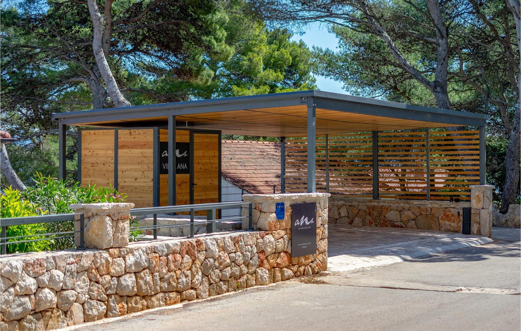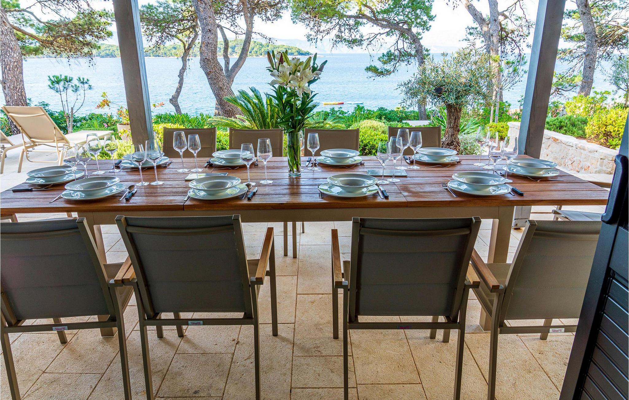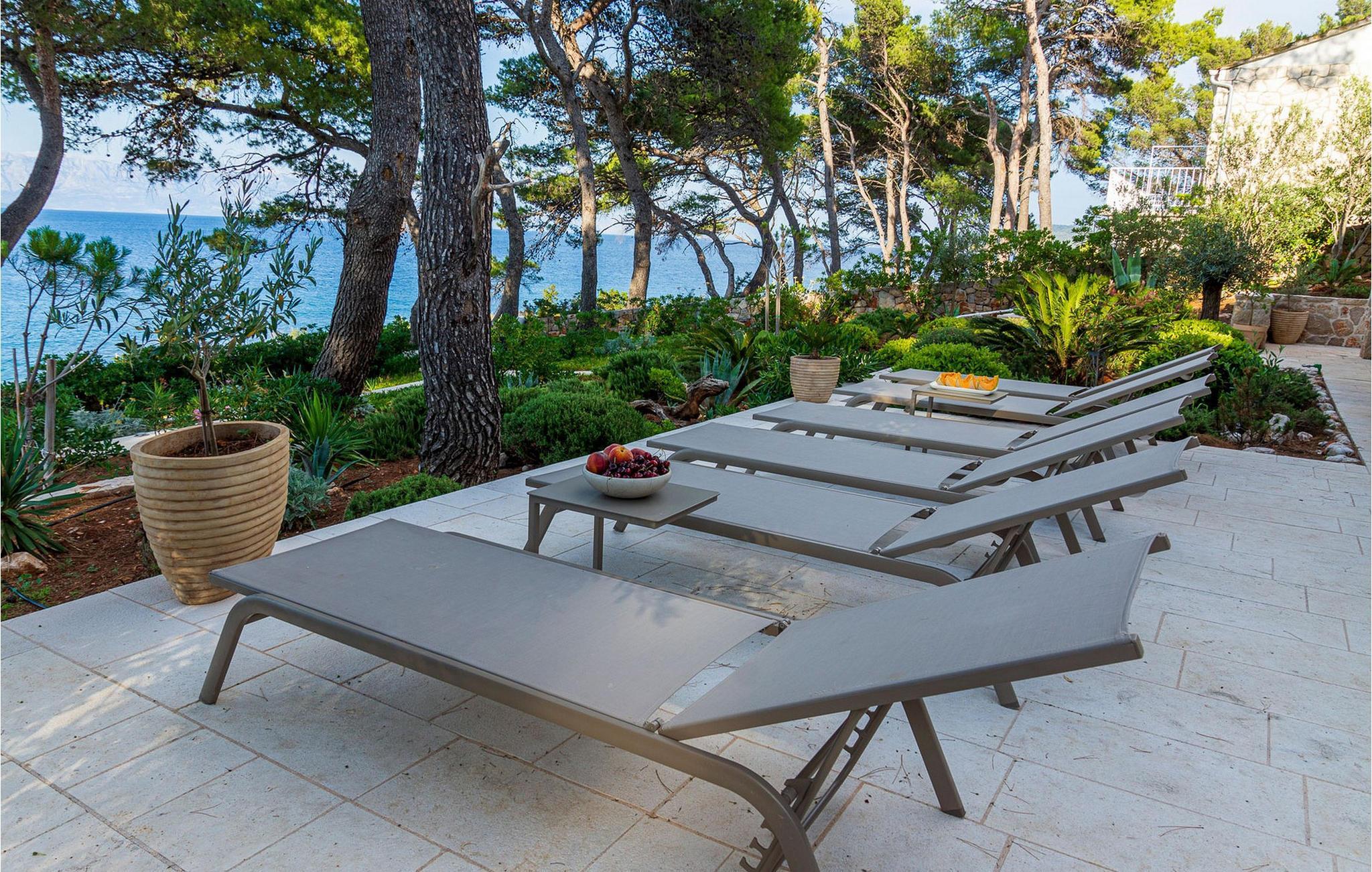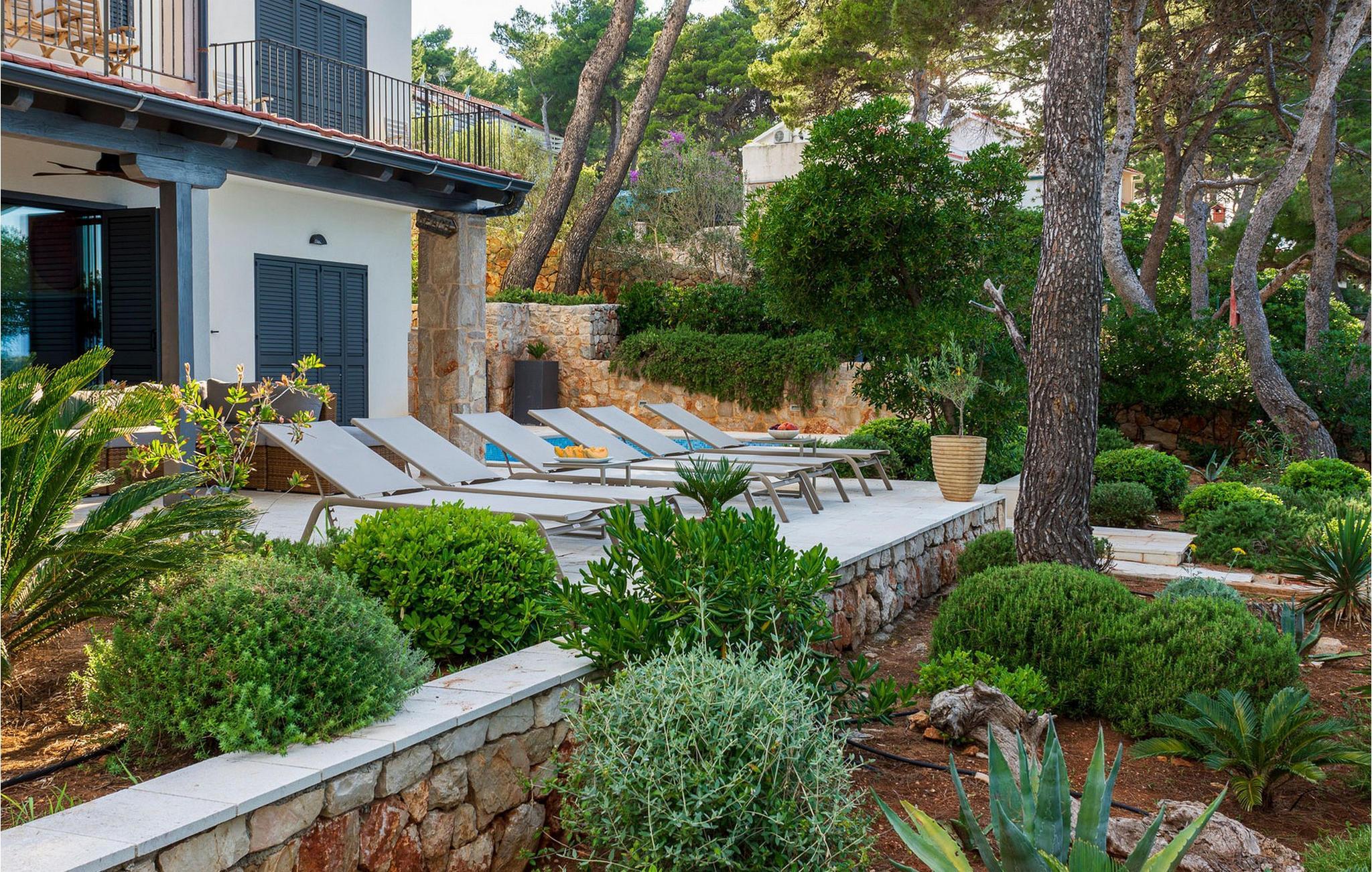 Ihr wunderschönes, mit mediterranen Pflanzen geschmücktes Grundstück verfügt über eine private Bucht mit angelegtem Zugang zum Meer. Hier genießen Sie absolute Privatsphäre, während Sie die friedliche Atmosphäre im Pool oder auf der Sonnenliege auf sich wirken lassen. Freuen Sie sich auf stimmungsvolle Sonnenuntergänge bei einem Glas Wein unter duftenden Pinien und zelebrieren Sie die gemeinsame Zeit mit gemütlichen Abenden im Indoor-Grillplatz.