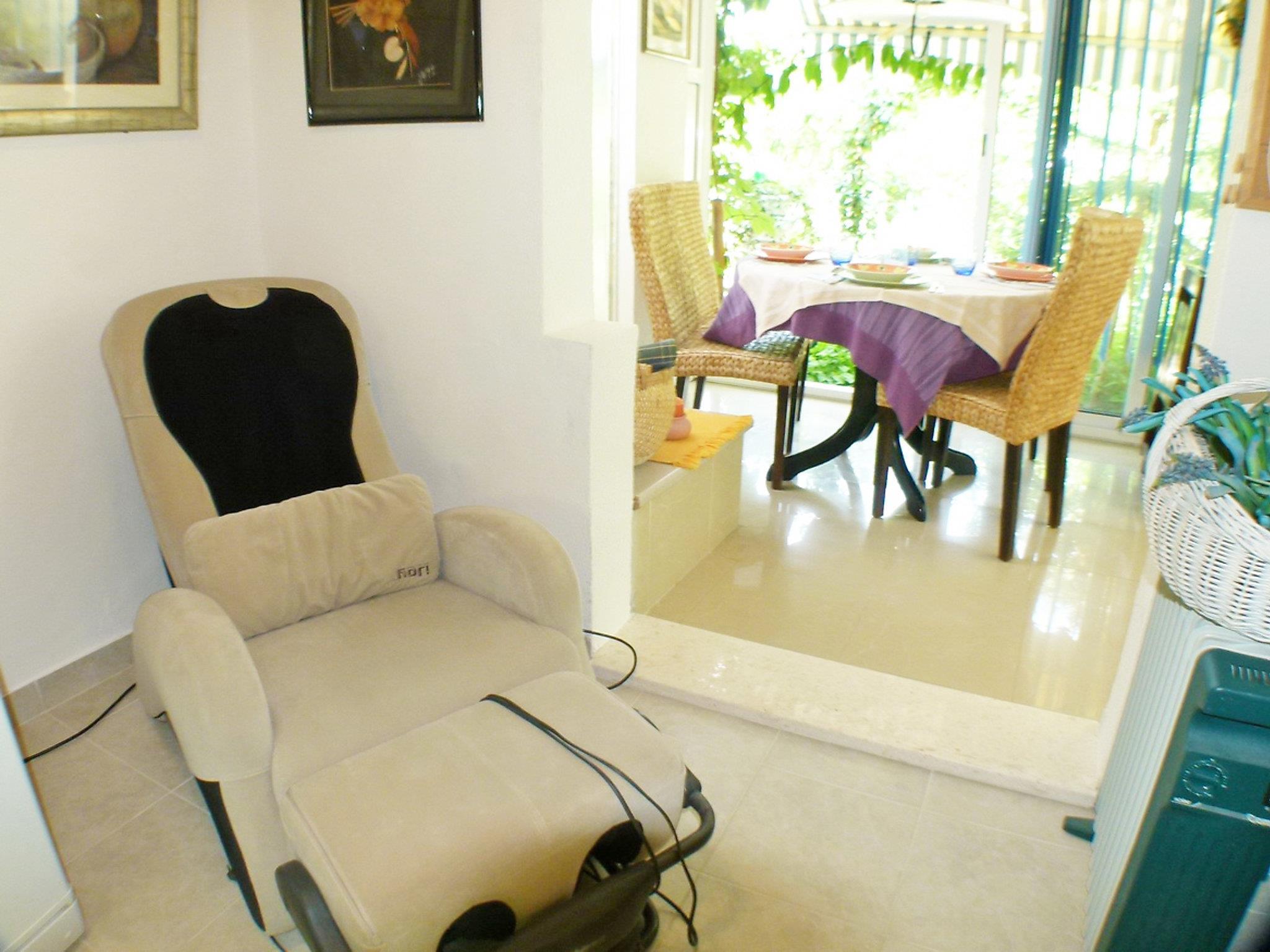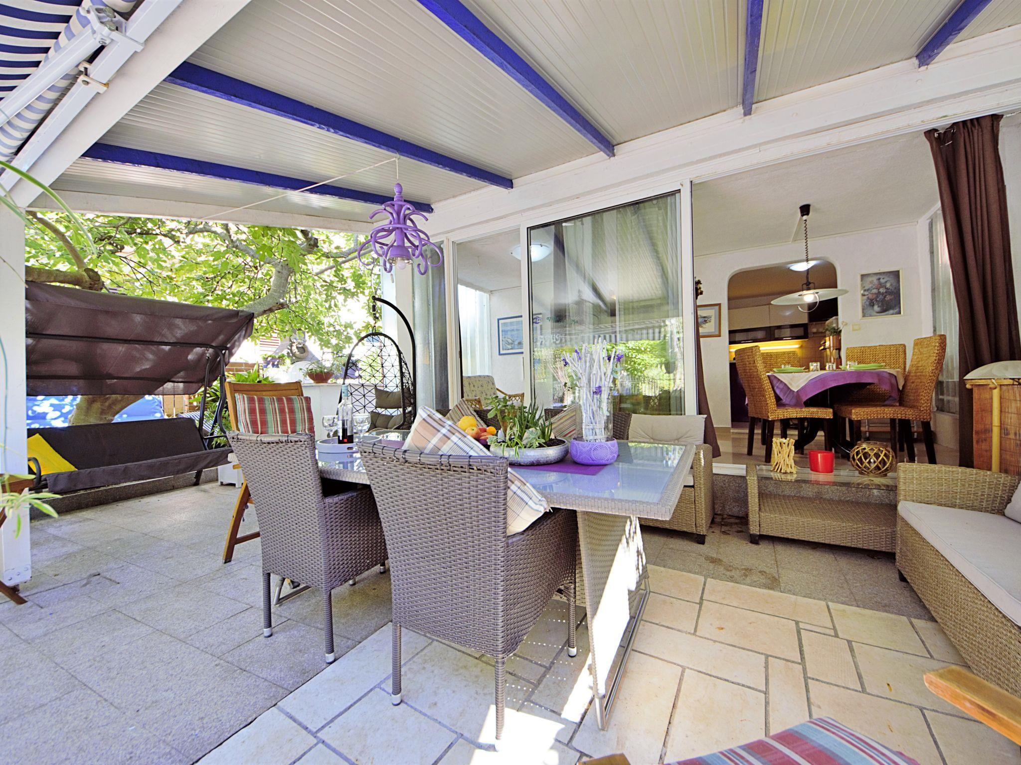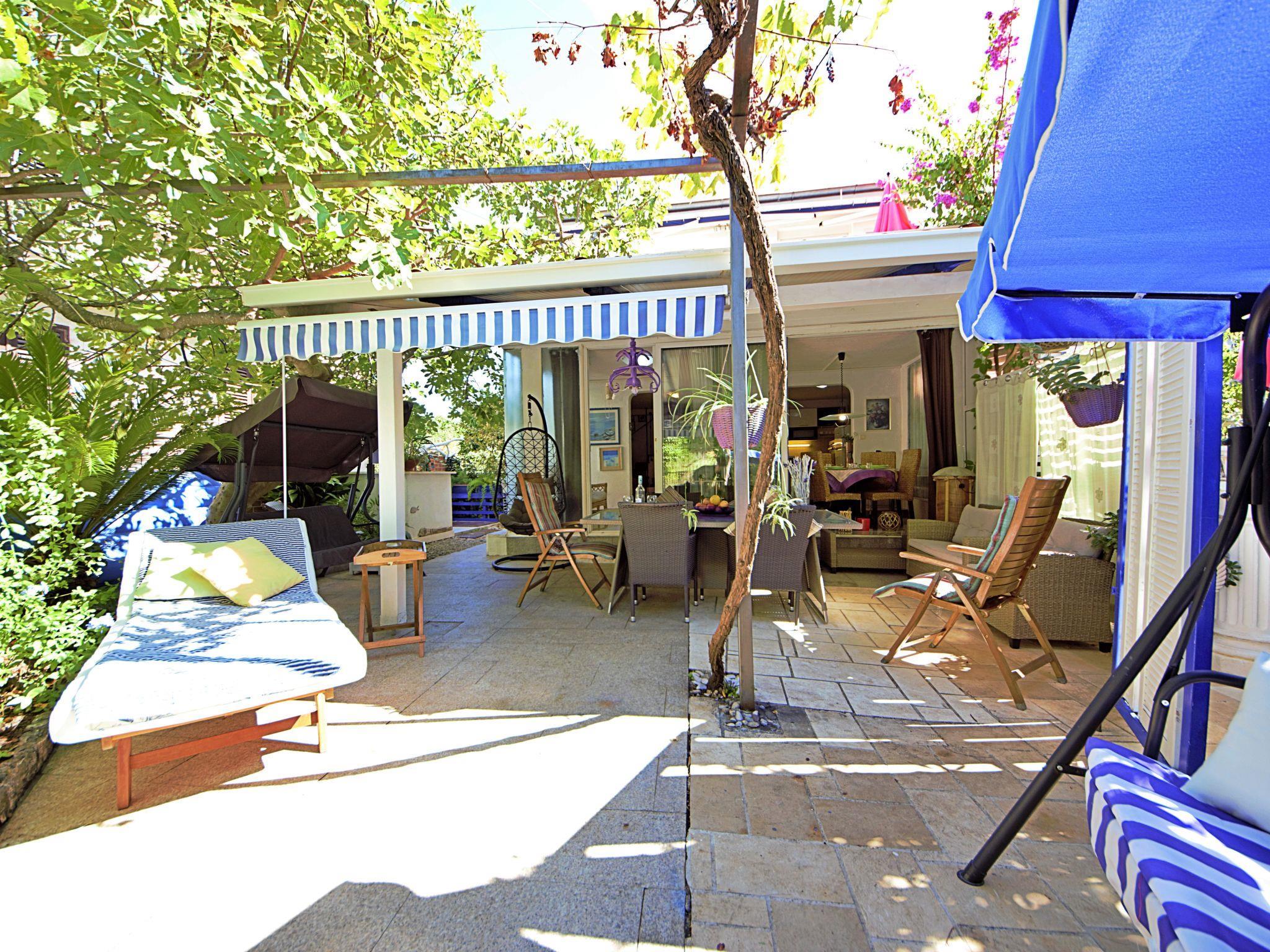 4-room semi-detached house 110 m2 on 2 levels, west facing position. Living/dining room with satellite TV (flat screen), air conditioning. Exit to the terrace. Open kitchen (2 hot plates, oven, dishwasher, microwave, freezer, electric coffee machine). Shower/WC. Upper floor: 1 room with 1 french bed (160 cm, length 200 cm). Exit to the balcony. 1 room with 2 beds (90 cm, length 200 cm). 1 room with 1 bed (90 cm, length 200 cm). Shower/WC. No heating option. Balcony 5 m2, small balcony terrace 15 m2. Terrace furniture, balcony furniture, deck chairs. Facilities: Internet (WiFi, free). Maximum 2 pets/ dogs allowed.