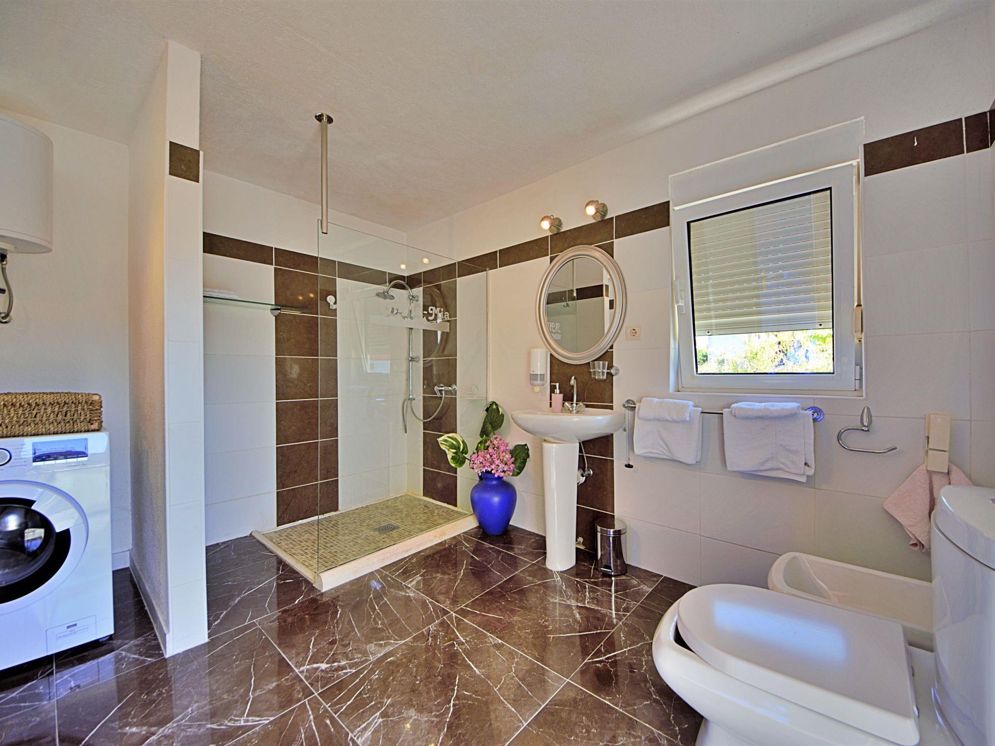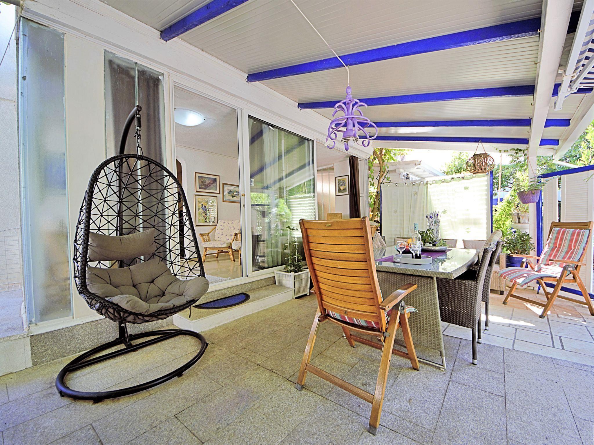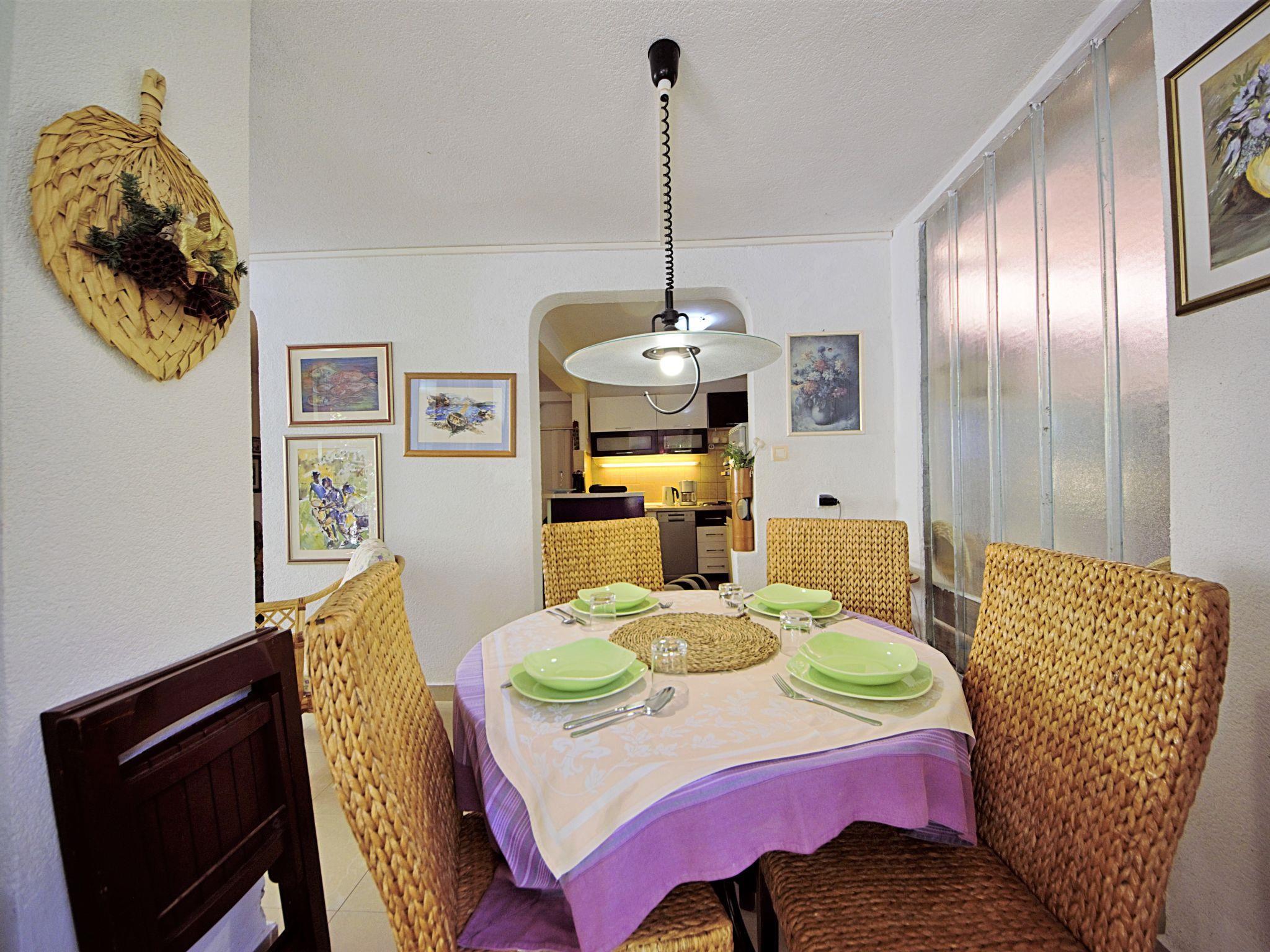 4-room semi-detached house 110 m2 on 2 levels, west facing position. Living/dining room with satellite TV (flat screen), air conditioning. Exit to the terrace. Open kitchen (2 hot plates, oven, dishwasher, microwave, freezer, electric coffee machine). Shower/WC. Upper floor: 1 room with 1 french bed (160 cm, length 200 cm). Exit to the balcony. 1 room with 2 beds (90 cm, length 200 cm). 1 room with 1 bed (90 cm, length 200 cm). Shower/WC. No heating option. Balcony 5 m2, small balcony terrace 15 m2. Terrace furniture, balcony furniture, deck chairs. Facilities: Internet (WiFi, free). Maximum 2 pets/ dogs allowed.