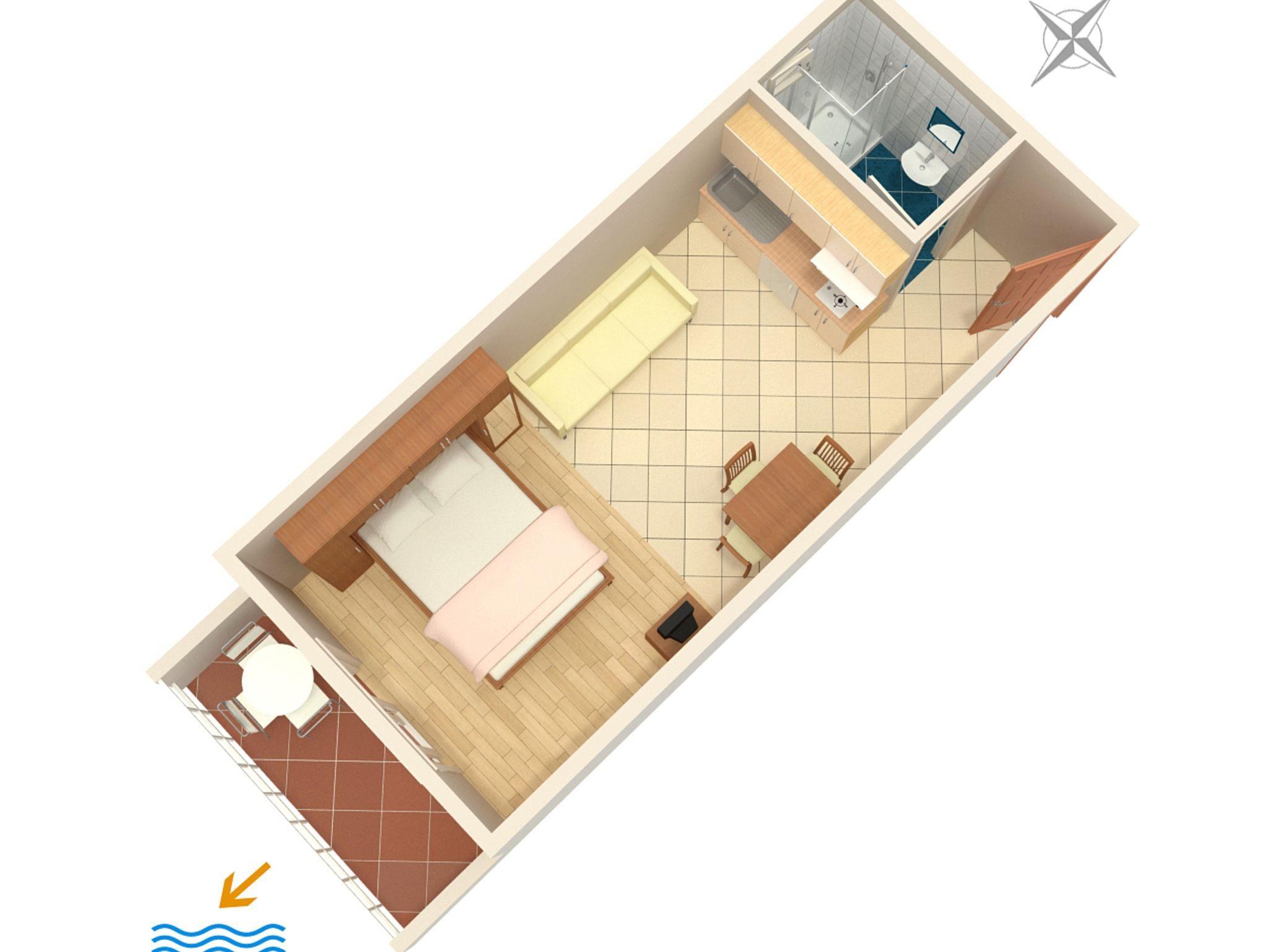 Studio bietet Platz für 2 Gäste. Die Betten sind in Schlafzimmern, die es 1 gibt, innerhalb einer Gesamtfläche von 20m2, angeordnet. Die Gäste haben einen eigenen Balkon zur Verfügung, auf der sie in warmen Sommernächten genießen können. Das Studio-Apartment bietet Meerblick. Es ist erlaubt, Speisen auf dem Gemeinschafts-Grill vorzubereiten. IM PREIS INBEGRIFFEN: Kurtaxe, Endreinigung, Klimatisierung, Parkplatz, Internet, Kinderbett, Bügeleisen, Bügelbrett, Föhn, tragbarer Grill, 1 Bett für Kinder (im Preis enthalten). VERBINDLICHE ZUSÄTZLICHE KOSTEN: Aufzahlung für Kurzaufenthalte (prozentualer Zuschlag pro Nächtigungsanzahl: 30% - 1, 20% - 2, 10% - 3). UNVERBINDLICHE ZUSÄTZLICHE KOSTEN: Wäschewaschen (5,00 € Waschen). Die Verfügbarkeit zusätzlicher Dienstleistungen in Ihrem reservierten Termin und die Preise derselben (falls nicht aufgeführt) müssen im Voraus überprüft werden. Zusätzliche Dienstleistungen die in der Zahlungsaufforderung nicht aufgeführt sind werden direkt beim Vermieter bezahlt, angenommen der Gast nutzt auch diese.
